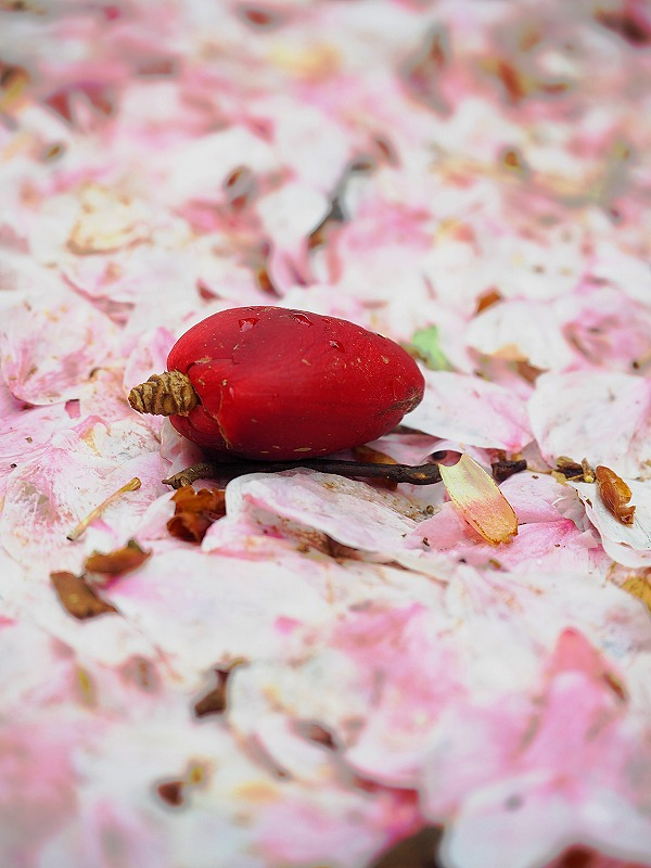 時期を同じくして満開だった椿の蕾も、桜のふかふかベッドの上でスヤスヤと