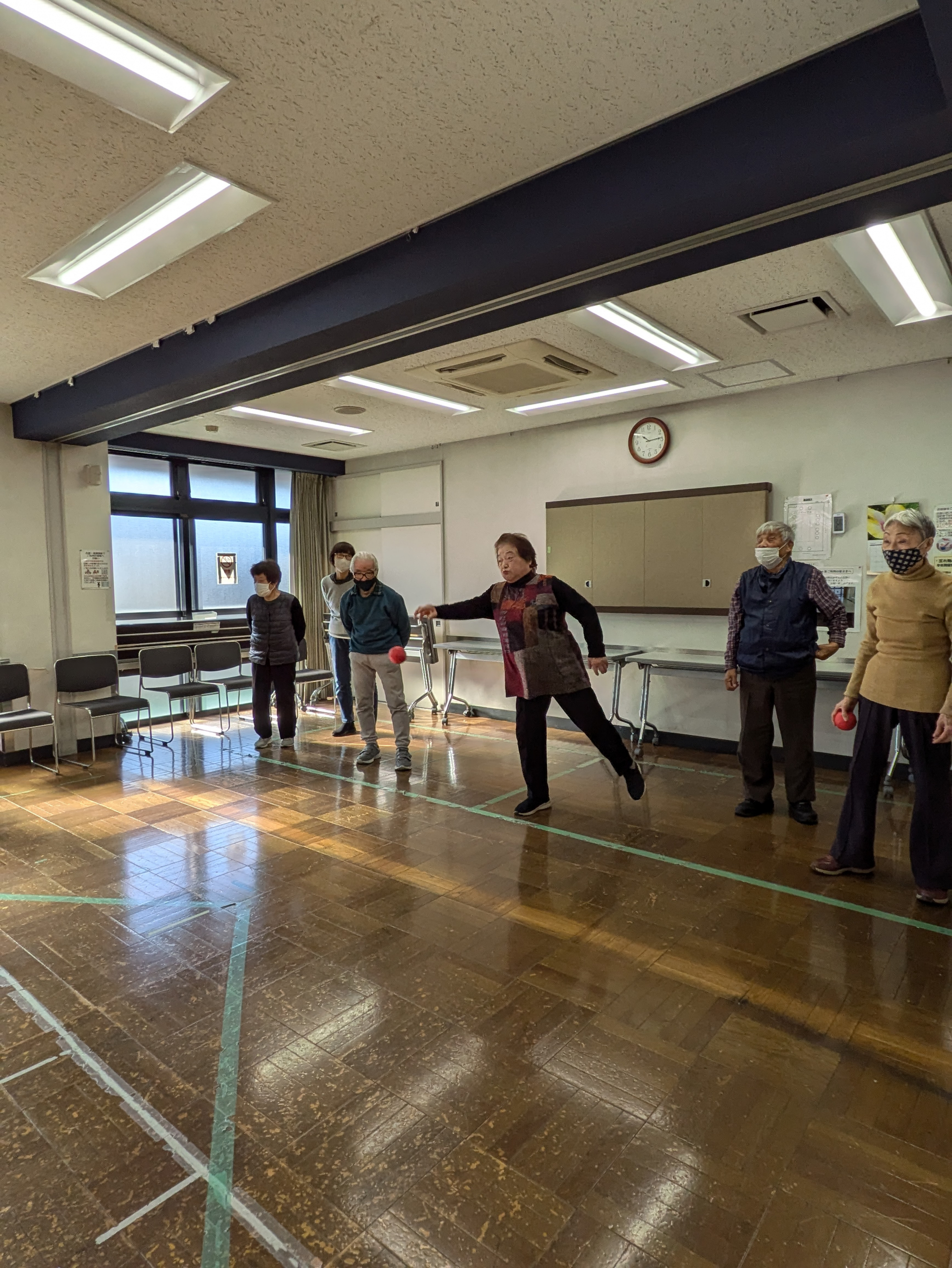 ジャッジ後の皆で玉拾いもひざの曲げ伸ばし運動になります。