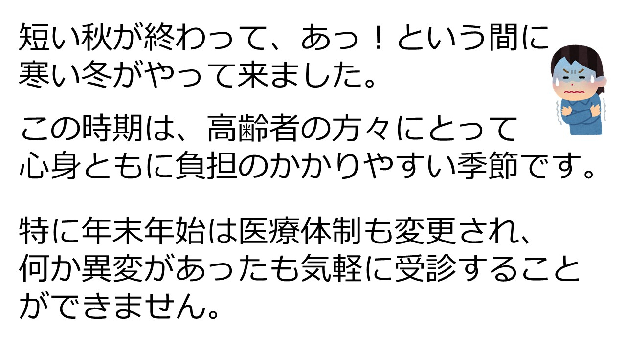 2025.12.22 お知らせ 年末年始を元気に過ごしましょう。 ~健康講座~ Tweet シェアする 前の記事 2026.01.05 お知らせ Let’s 脳トレ 「間違い探し」 次の記事 2025.12.19 お知らせ ハンドメイド教室 ~毛糸で作るクリスマスリース~ 一覧へ戻る