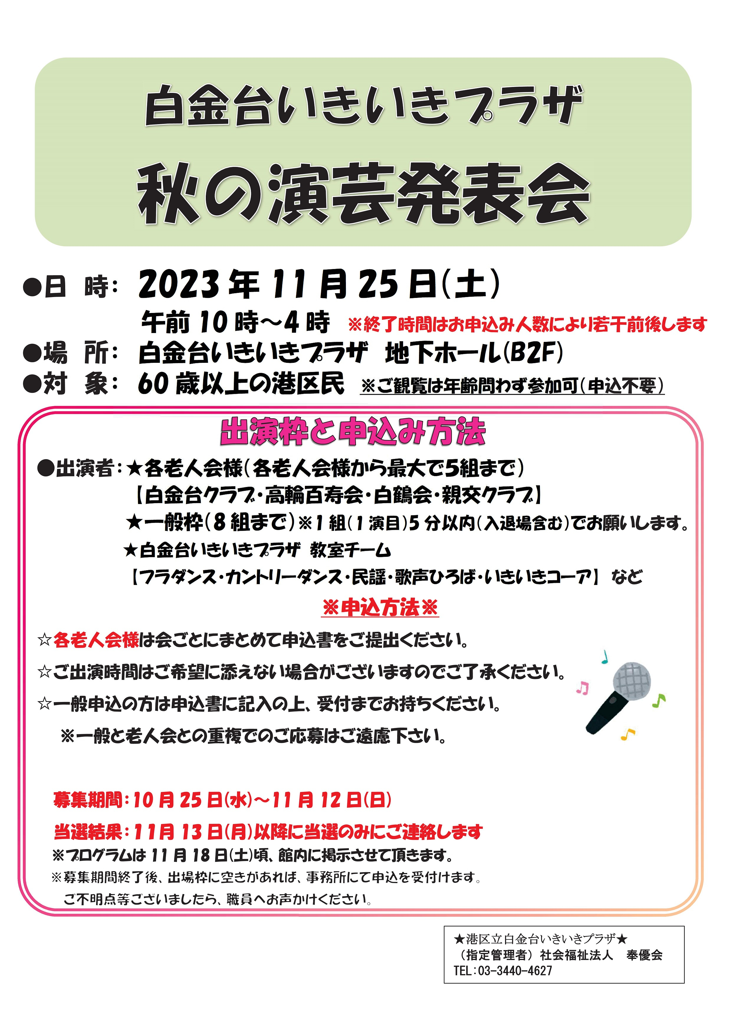 11月25日(土)は白金台いきいきプラザで秋の演芸発表会を開催します!!