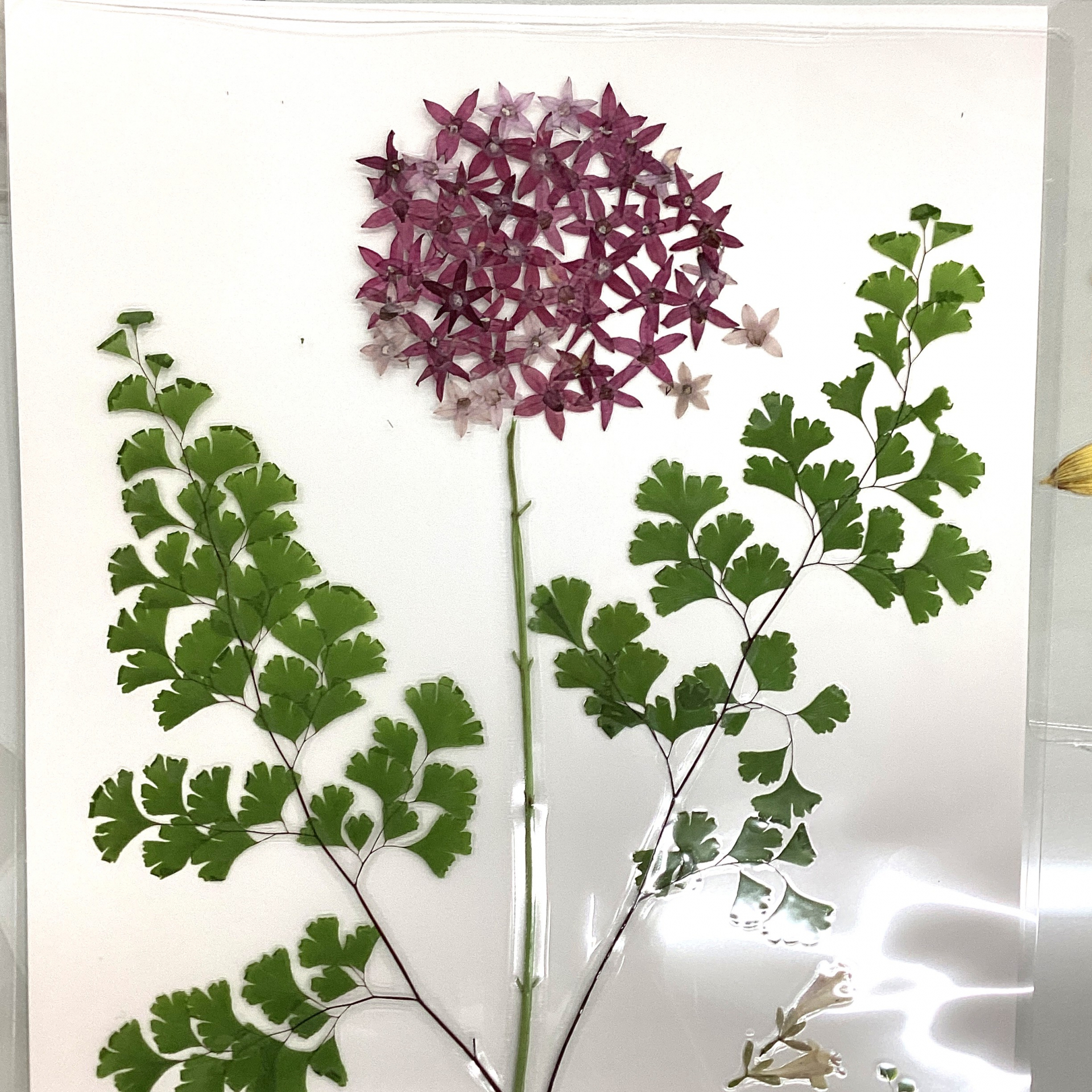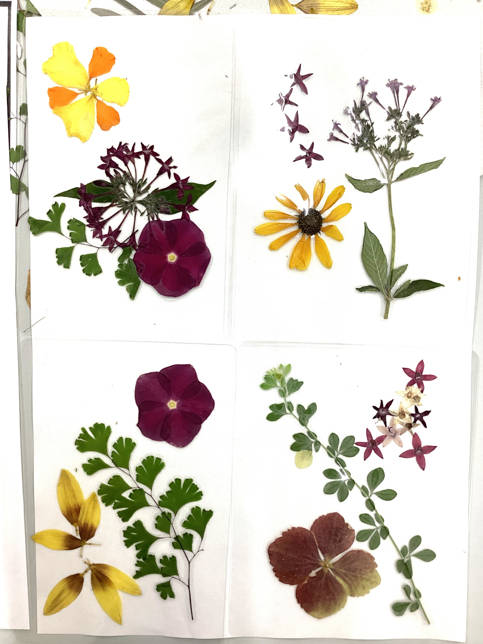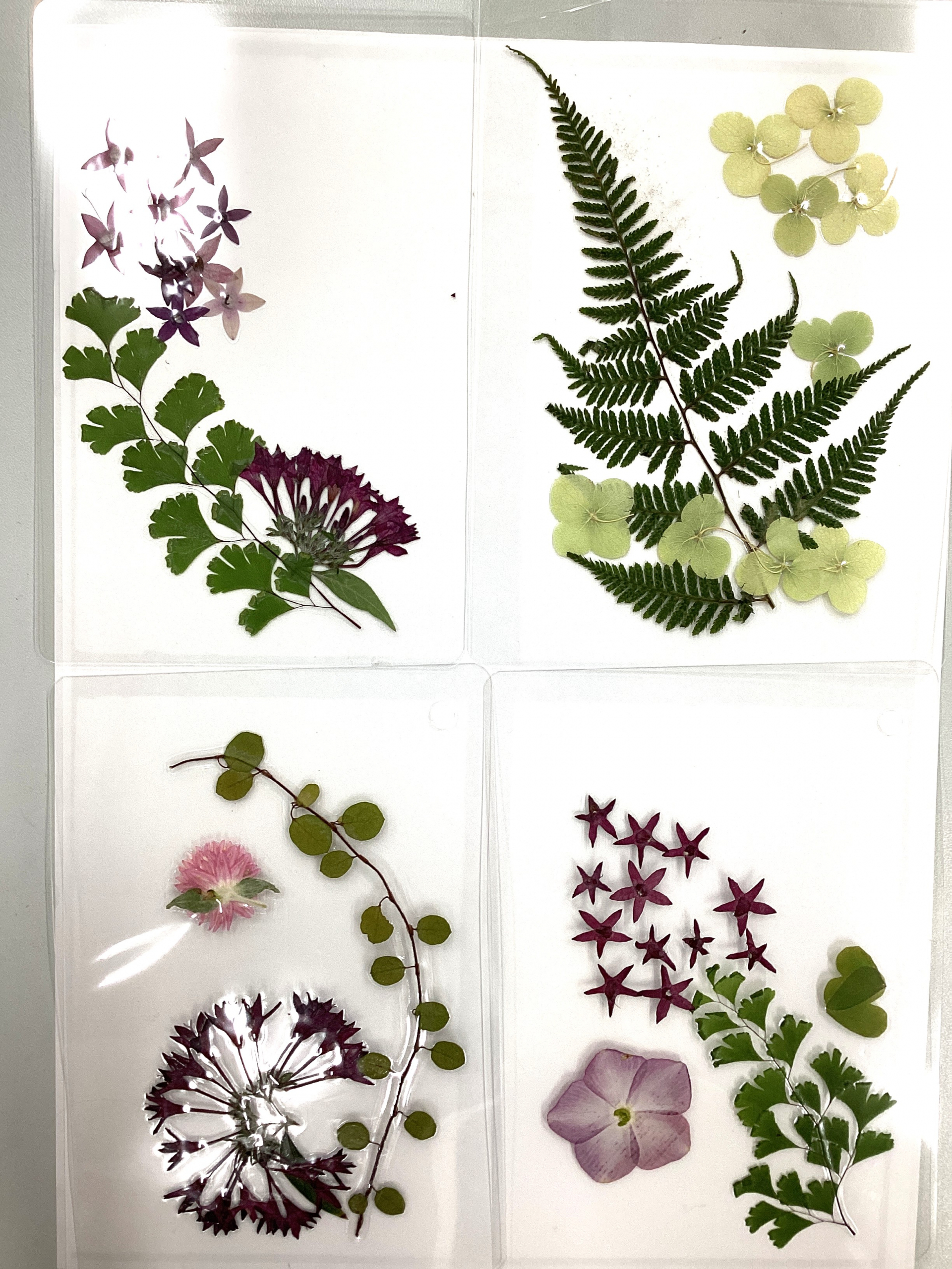 この押し花を台紙を下敷きにしたラミネートシートに挟んでいきます。