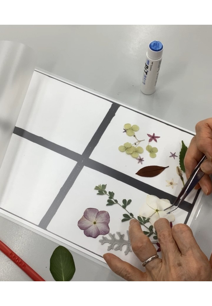 しおりのできあがりをイメージしながらお花を置いていきますが、