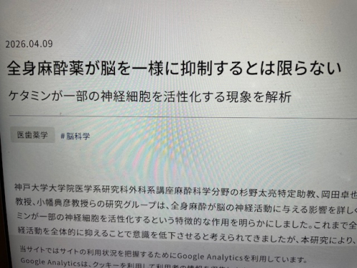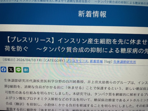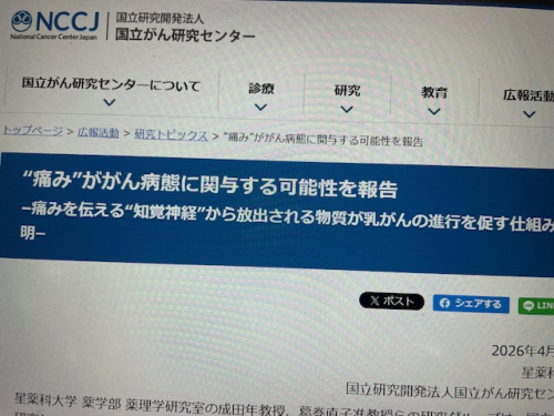 2026.04.15 早期アルツハイマー病治療薬・レカネマブと副作用 ニュース 2026.04.15 笑って体力づくり お知らせ 2026.04.15 コレラ菌は光で加速する? ニュース 2026.04.15 免疫細胞が血管を作り、骨を再生 ニュース 2026.04.15 がんと「痛み」の深い関係 ニュース 2026.04.15 行動経済学のナッジと健康管理 ニュース 2026.04.15 他人ごとではないフレイル ニュース 2026.04.15 サプリメント過剰摂取 ニュース 2026.04.15 ネコひねりを解明 ニュース 2026.04.15 膵β細胞の休息と正常なインスリン産生 ニュース 2026.04.15 全身麻酔薬と脳の神経細胞 ニュース 2026.04.15 コロナ禍の行動制限及び解除がどう血糖管理に影響したのか? ニュース 2026.04.15 喫煙・飲酒経験があり歯数が少ない高齢者は、死亡リスクが大幅に増加 ニュース 2026.04.13 切り絵サロン作品 活動報告 2026.04.10 真菌症って何? ニュース 1 2 3 … 125