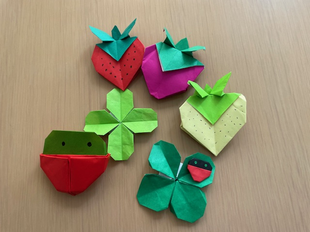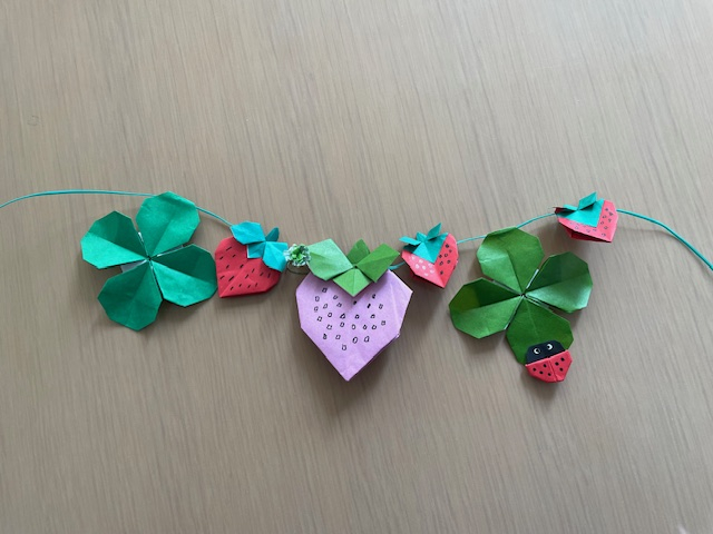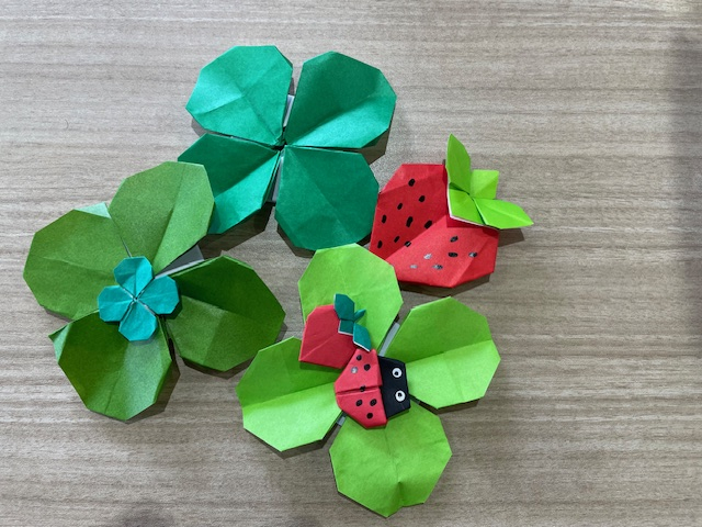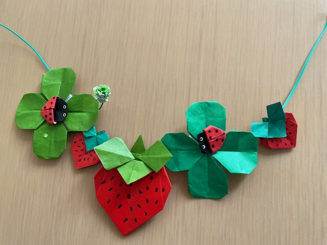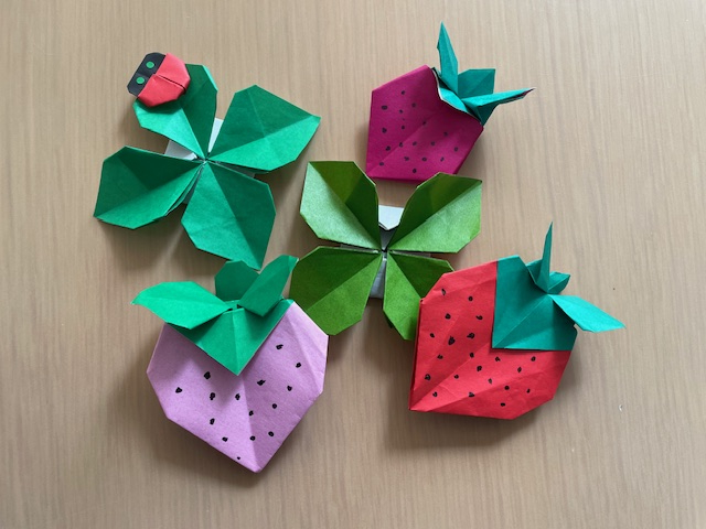 3月に入ったので春らしく、苺、クローバー、てんとう虫を折りました。