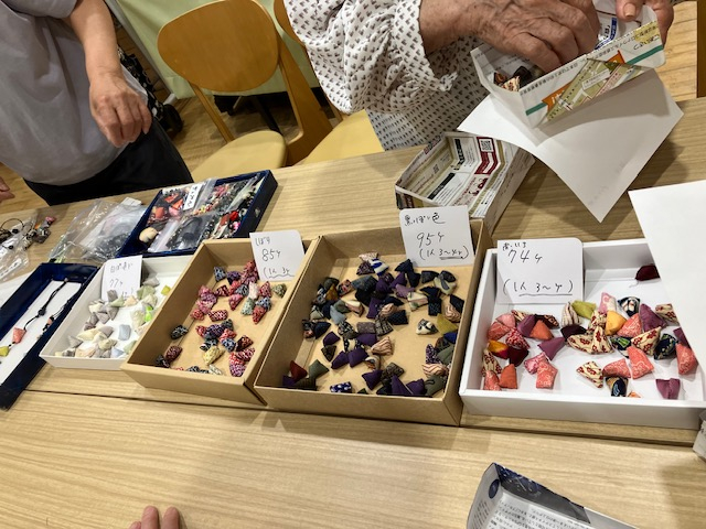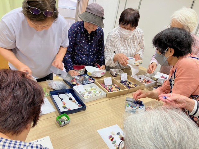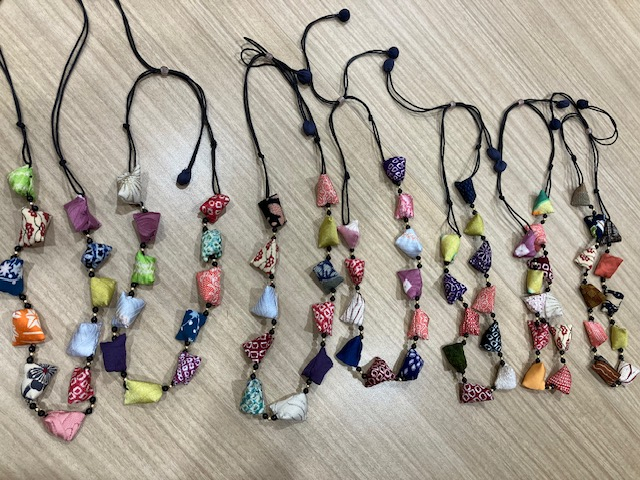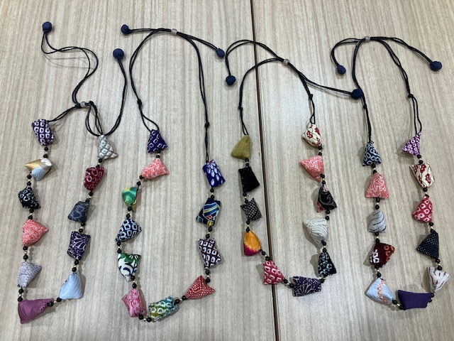 和の布で作った小さなパーツとビーズを組み合わせて作るネックレス!どの作品も素敵に仕上がりました!