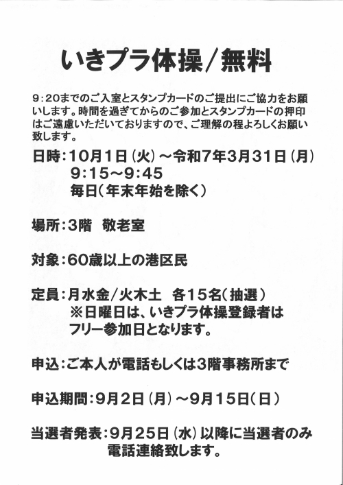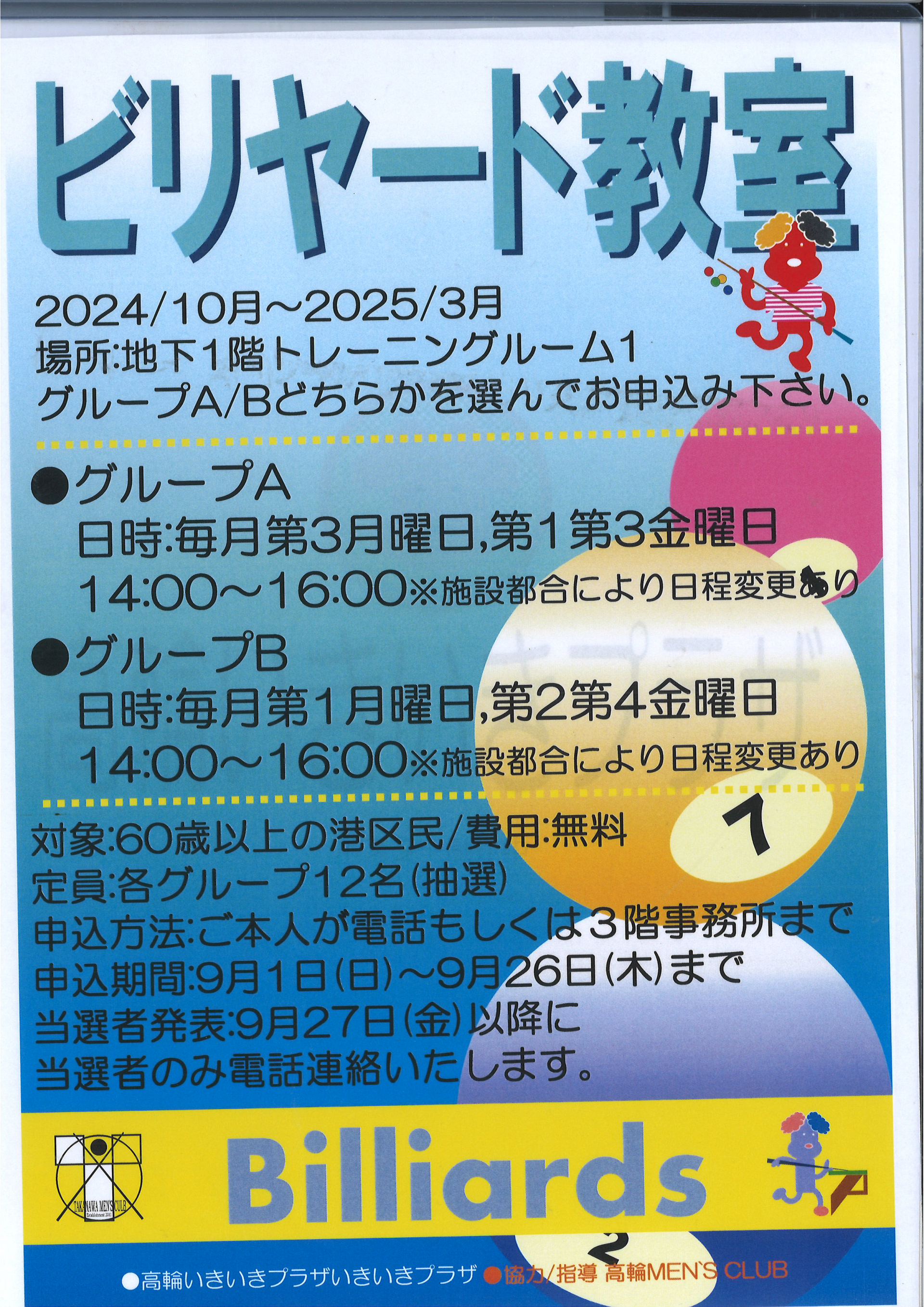 2024.09.04 お知らせ ビリヤード Tweet シェアする 高輪いきいきプラザ H.H. 前の記事 2024.09.06 お知らせ ネコのiPS細胞に成功 次の記事 2024.09.04 お知らせ いきプラ体操 一覧へ戻る
