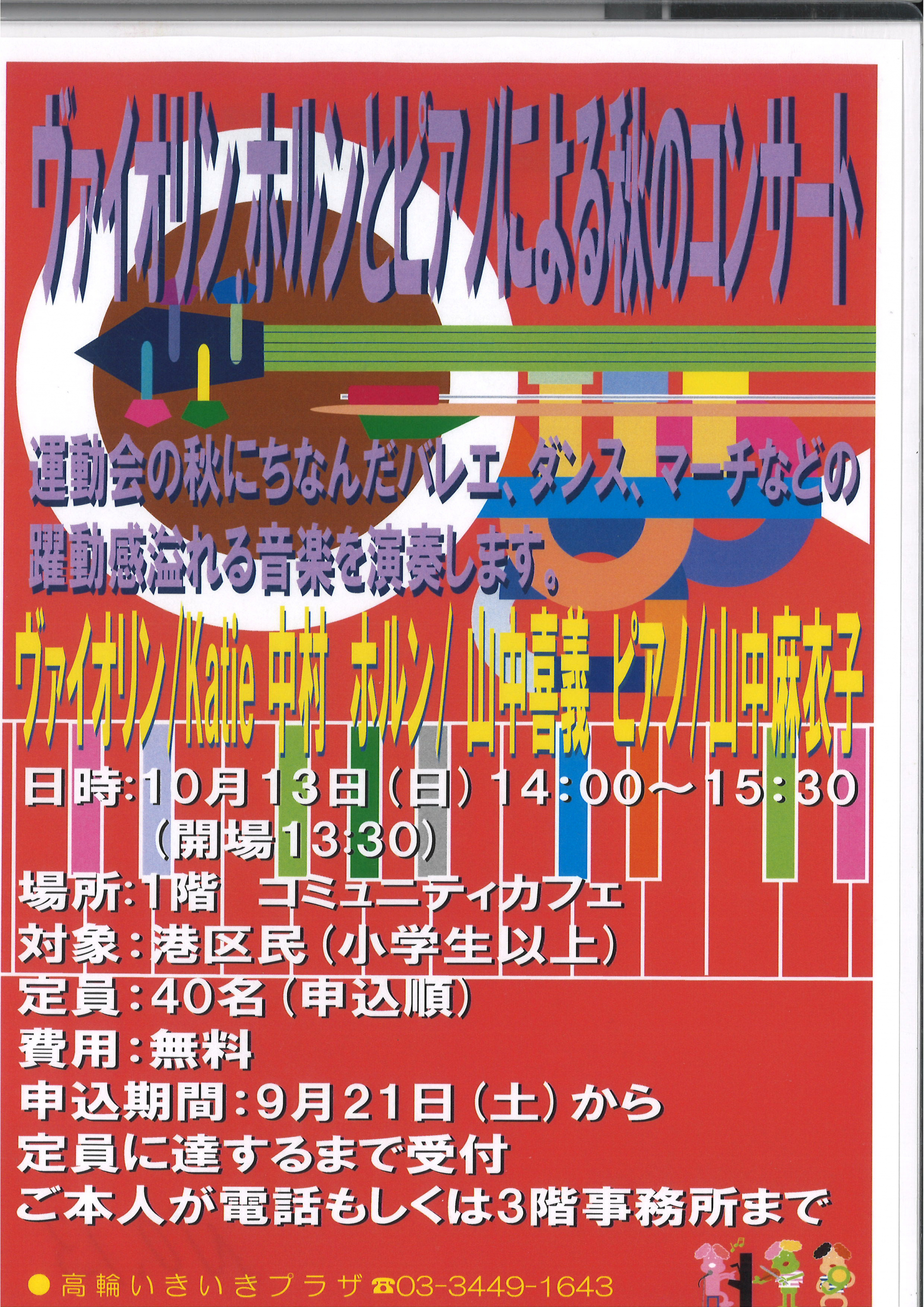 2024.09.24 お知らせ ヴァイオリン、ホルンとピアノによる秋のコンサートの募集です Tweet シェアする 高輪いきいきプラザ H.H. 前の記事 2024.09.25 お知らせ 高輪だより10月号 次の記事 2024.09.24 お知らせ 秋の朗読講座の募集です 一覧へ戻る