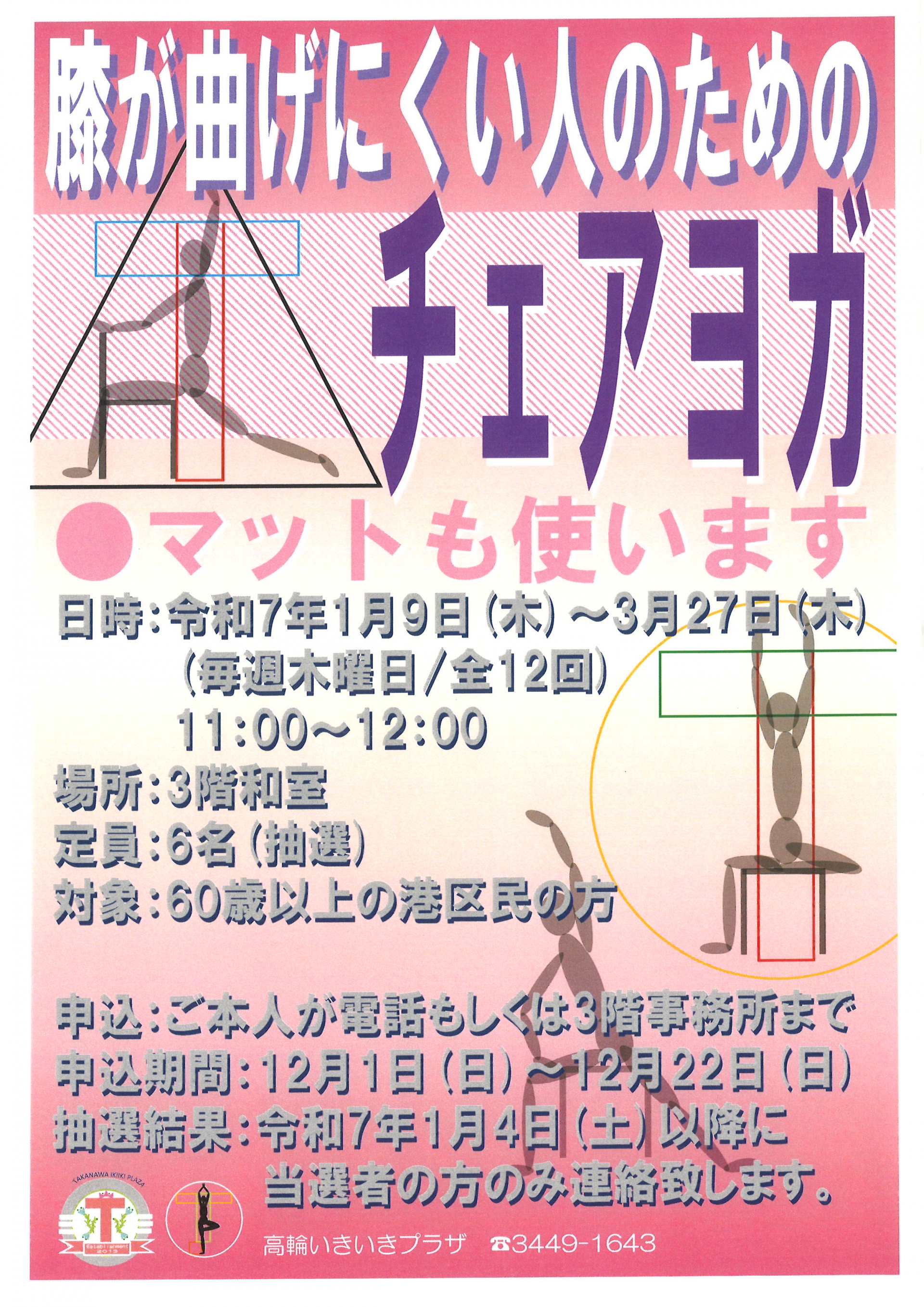 2024.11.25 お知らせ 「膝が曲げにくい人のチェアヨガ」(2025年1月開始) 参加者募集 Tweet シェアする 「膝が曲げにくい人のチェアヨガ」(2025年1月~3月開催のコース)の参加者を募集いたします。 高輪いきいきプラザ H.H. 前の記事 2024.11.25 お知らせ 「ハタヨガ」(2025年1月開始) 参加者募集 次の記事 2024.11.25 お知らせ 「体が硬い人のためのヨガ教室」(2025年1月開始) 参加者募集 一覧へ戻る