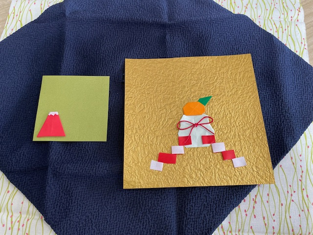 今回は富士山と鏡餅を題材にして、それぞれ額や台紙に貼りつけてみました。