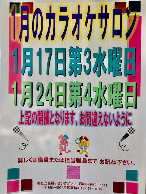 2023.12.27 活動報告 1月のカラオケサロン日程 Tweet シェアする カラオケサロン 前の記事 2023.12.27 活動報告 トリュフの人口栽培 次の記事 2023.12.25 活動報告 高輪だより1月号 一覧へ戻る