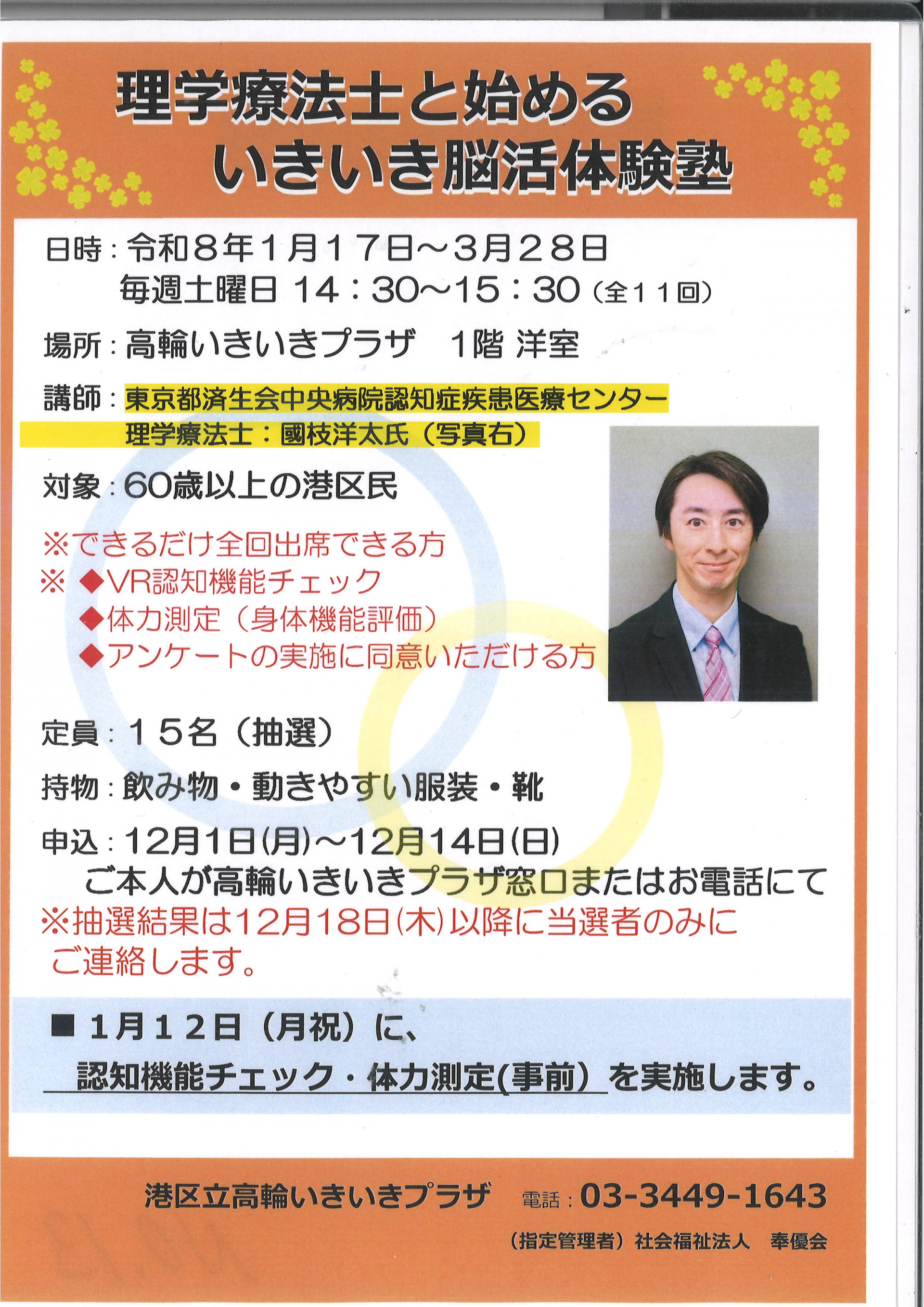 2025.12.03 お知らせ 理学療法士と始めるいきいき脳活体験塾 Tweet シェアする 前の記事 2025.12.03 お知らせ 社会不安症と認知機能 次の記事 2025.12.03 お知らせ ハタヨガ 一覧へ戻る