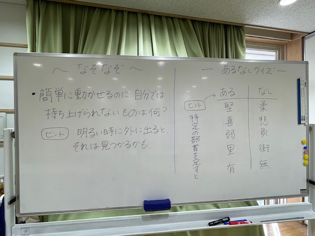 毎回、事業開始前の待ち時間にウォーミングアップで考えていただく「なぞなぞ」「あるなしクイズ」です。