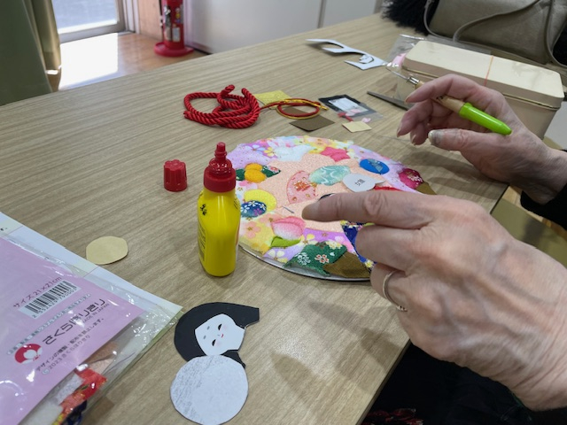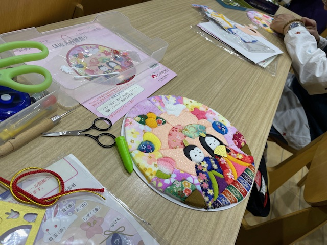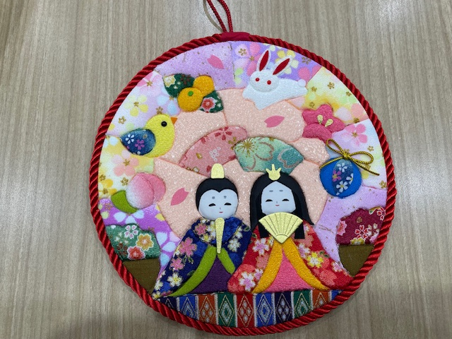 色々な模様の生地を使用し、春らしくて綺麗な「お雛様の飾り」が出来上がりました!