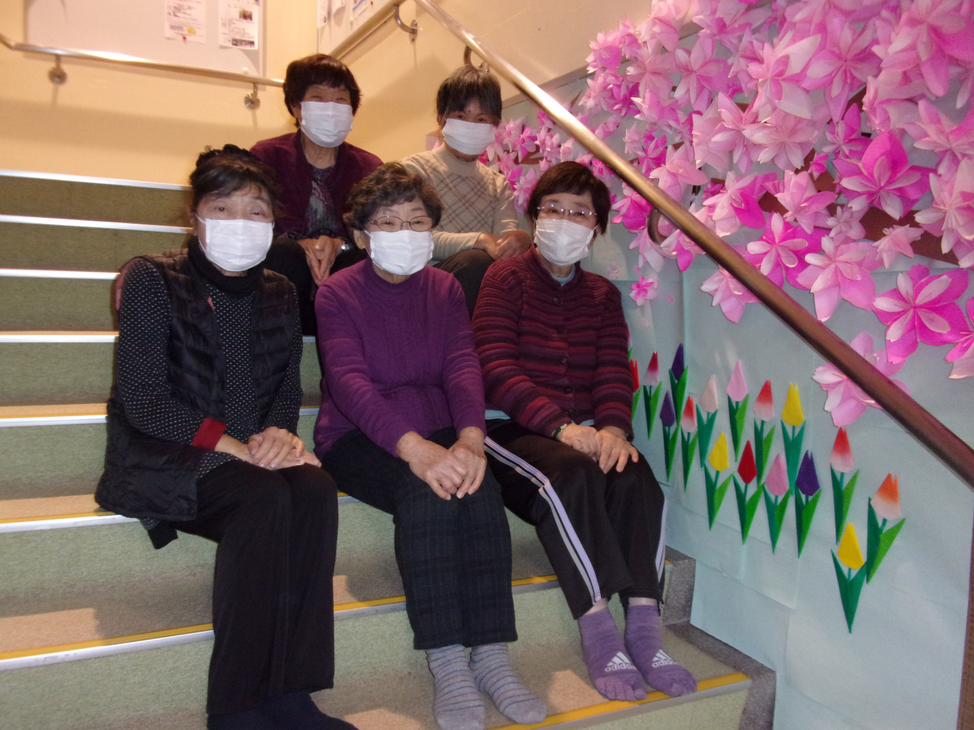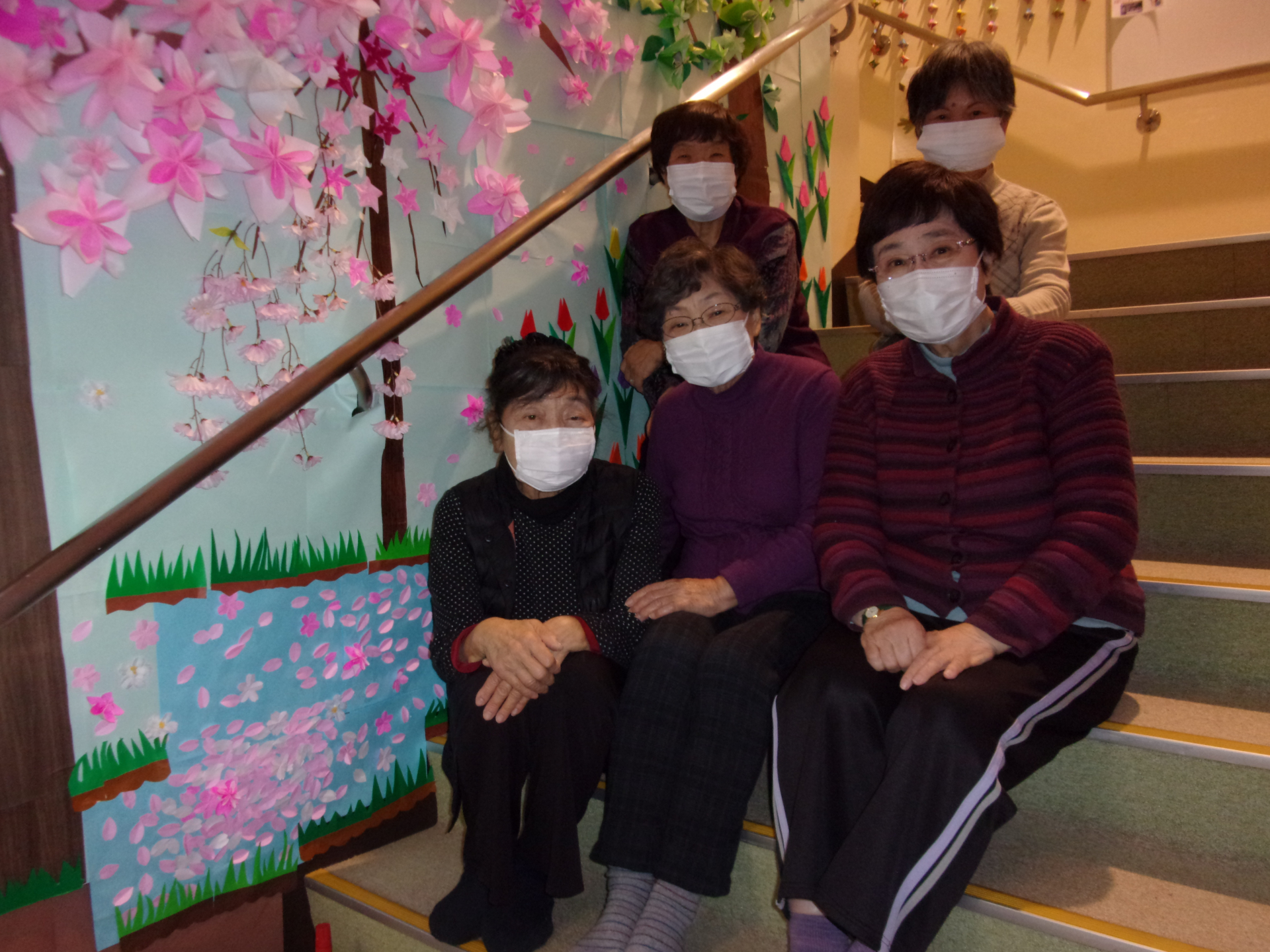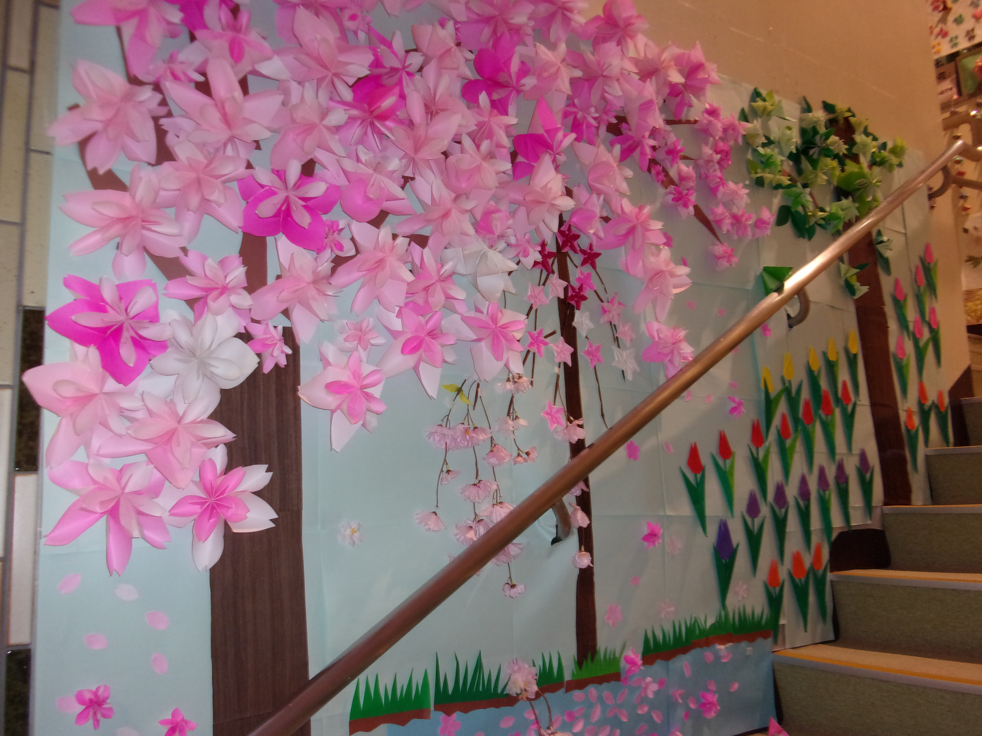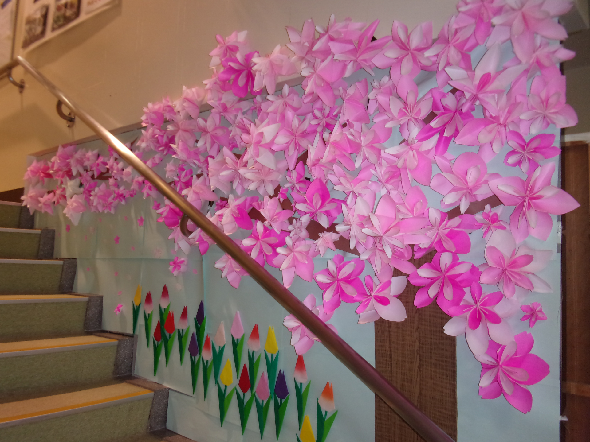 装飾ボランティアの皆さんが、折り紙で階段の両側に満開の桜 を咲かせてくれました