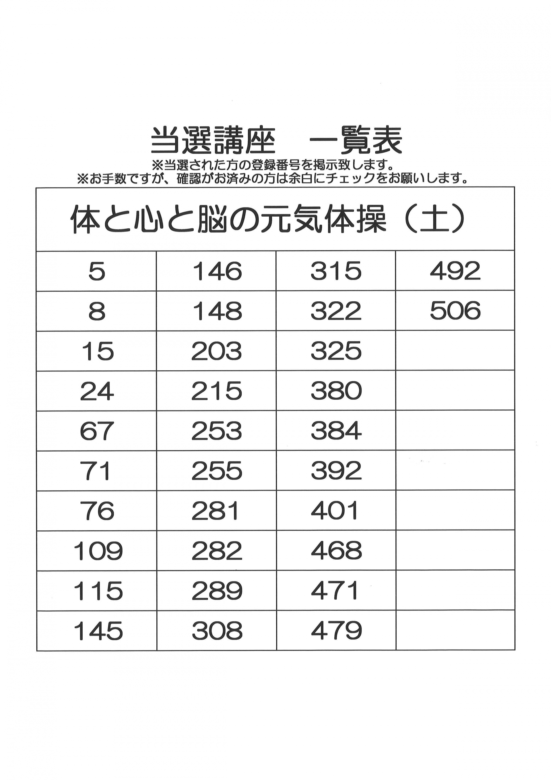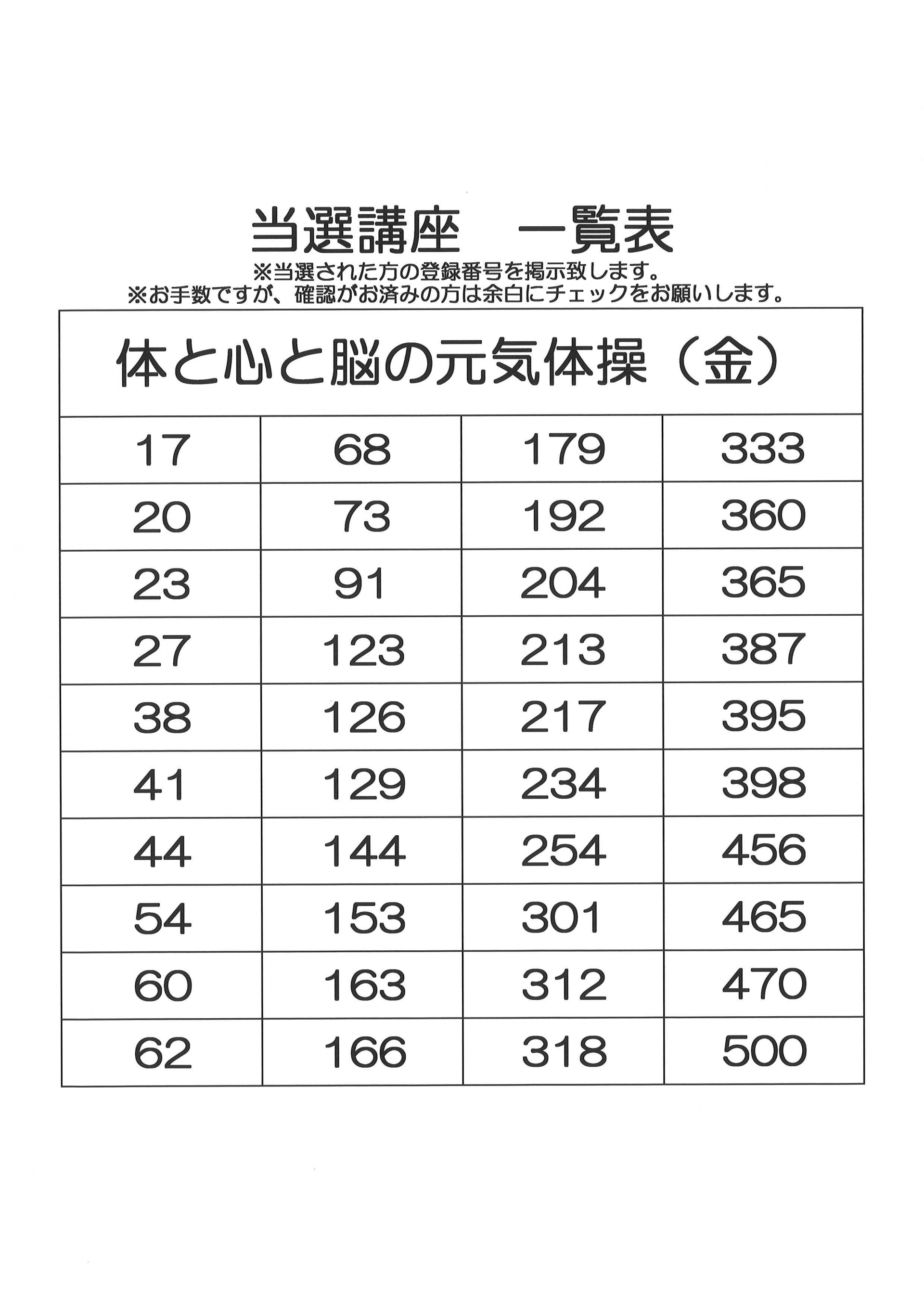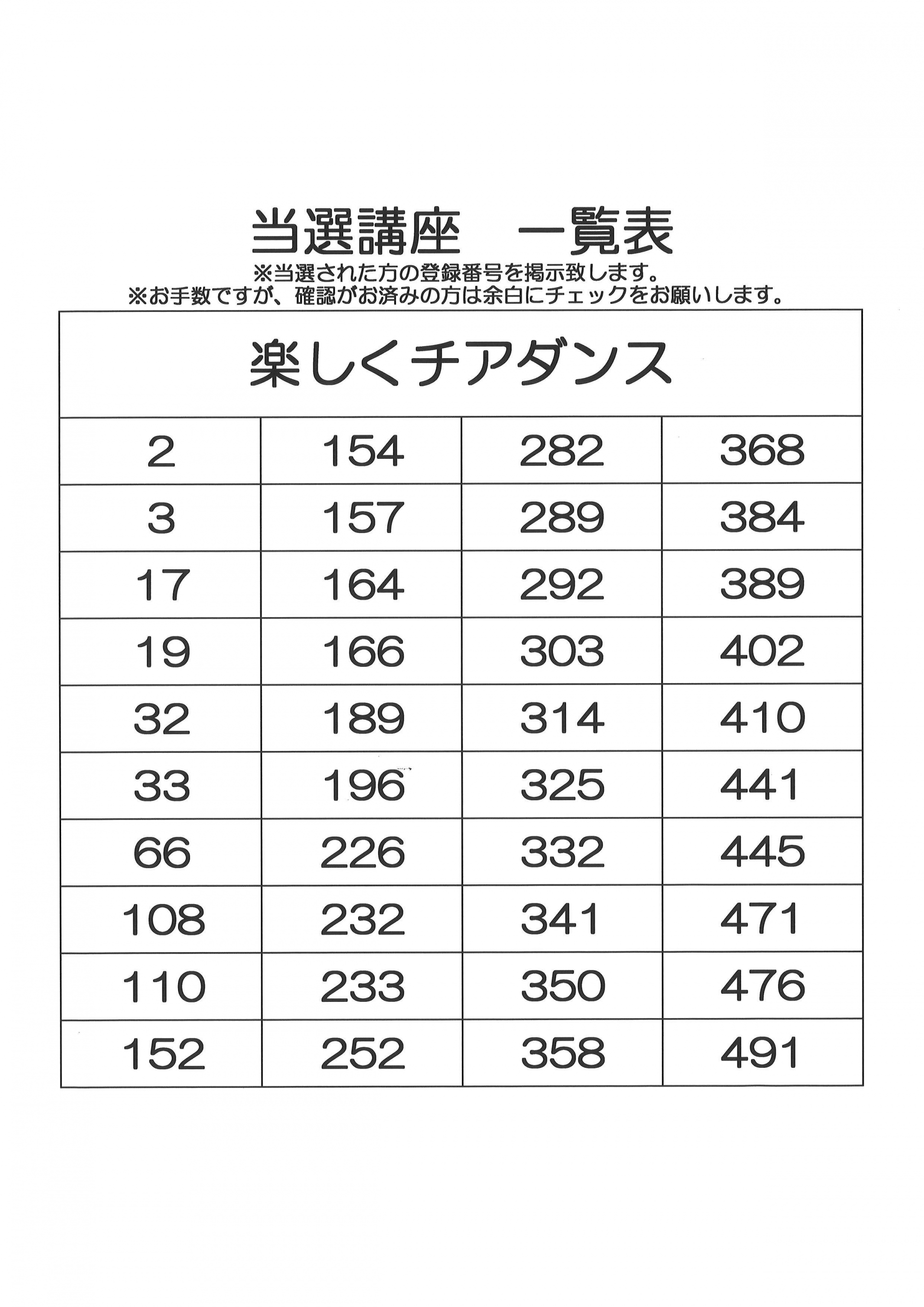 2024.03.08 お知らせ 【城東ふれあいセンター】定期講座抽選結果(健康講座) Tweet シェアする 皆さま、こんにちは 定期講座の抽選結果をお知らせします 番号は「申込番号」でご確認ください 以上になります よろしくお願いいたします 城東ふれあいセンター A.S 前の記事 2024.03.08 お知らせ 【城東ふれあいセンター】定期講座抽選結果(教養講座) 次の記事 2024.03.06 お知らせ ボランティア活動報告「桜満開!装飾ボラの活動」 一覧へ戻る