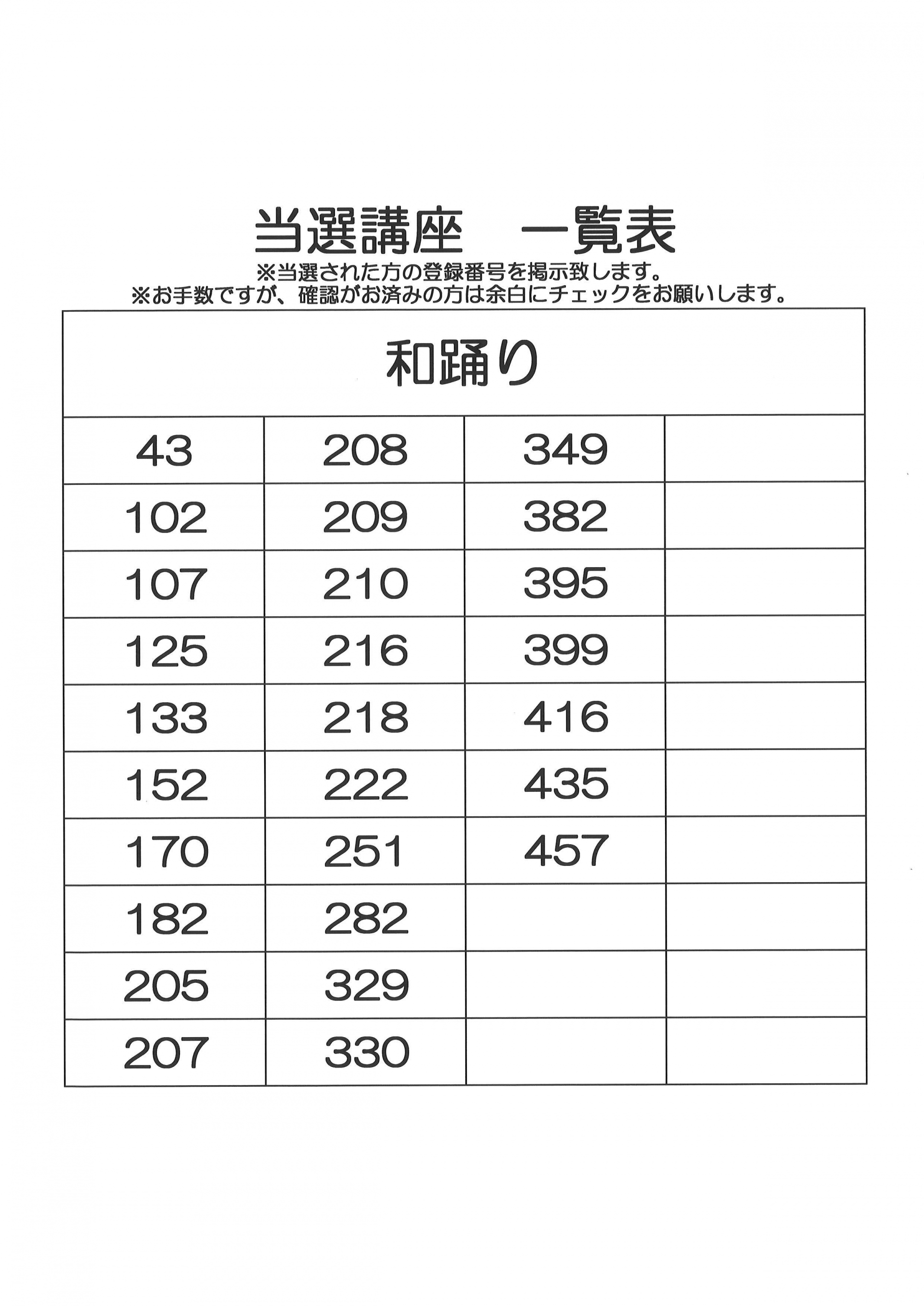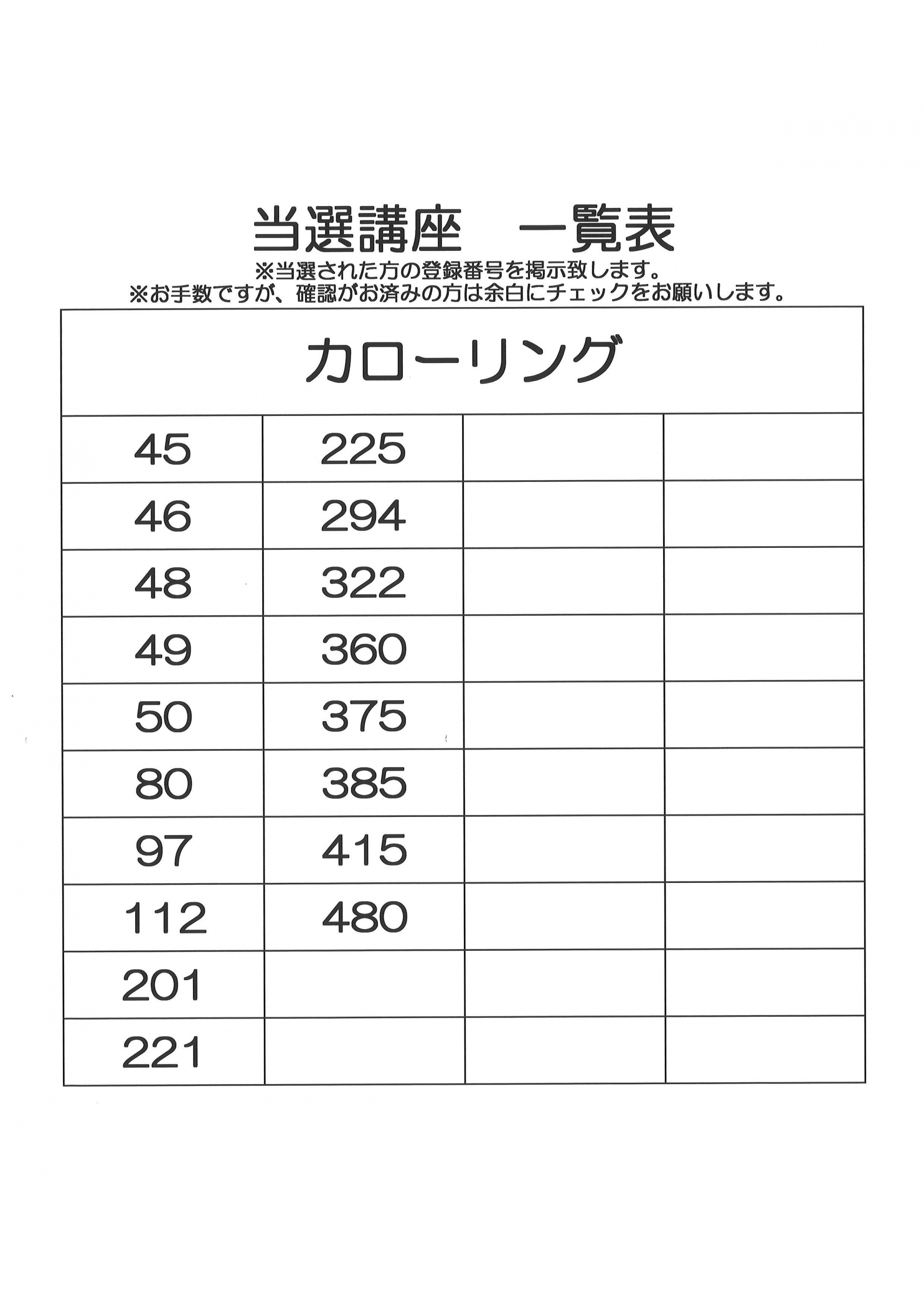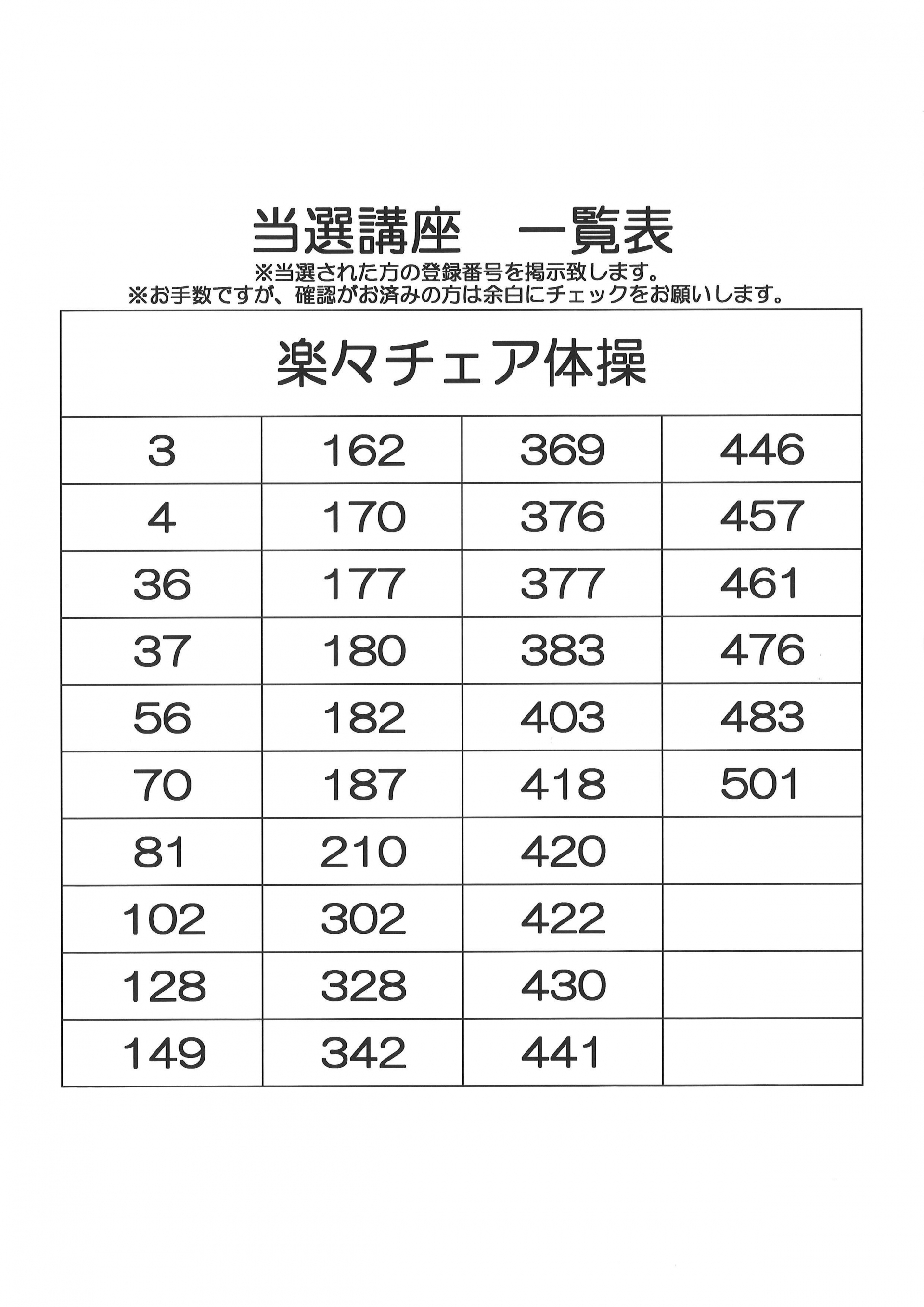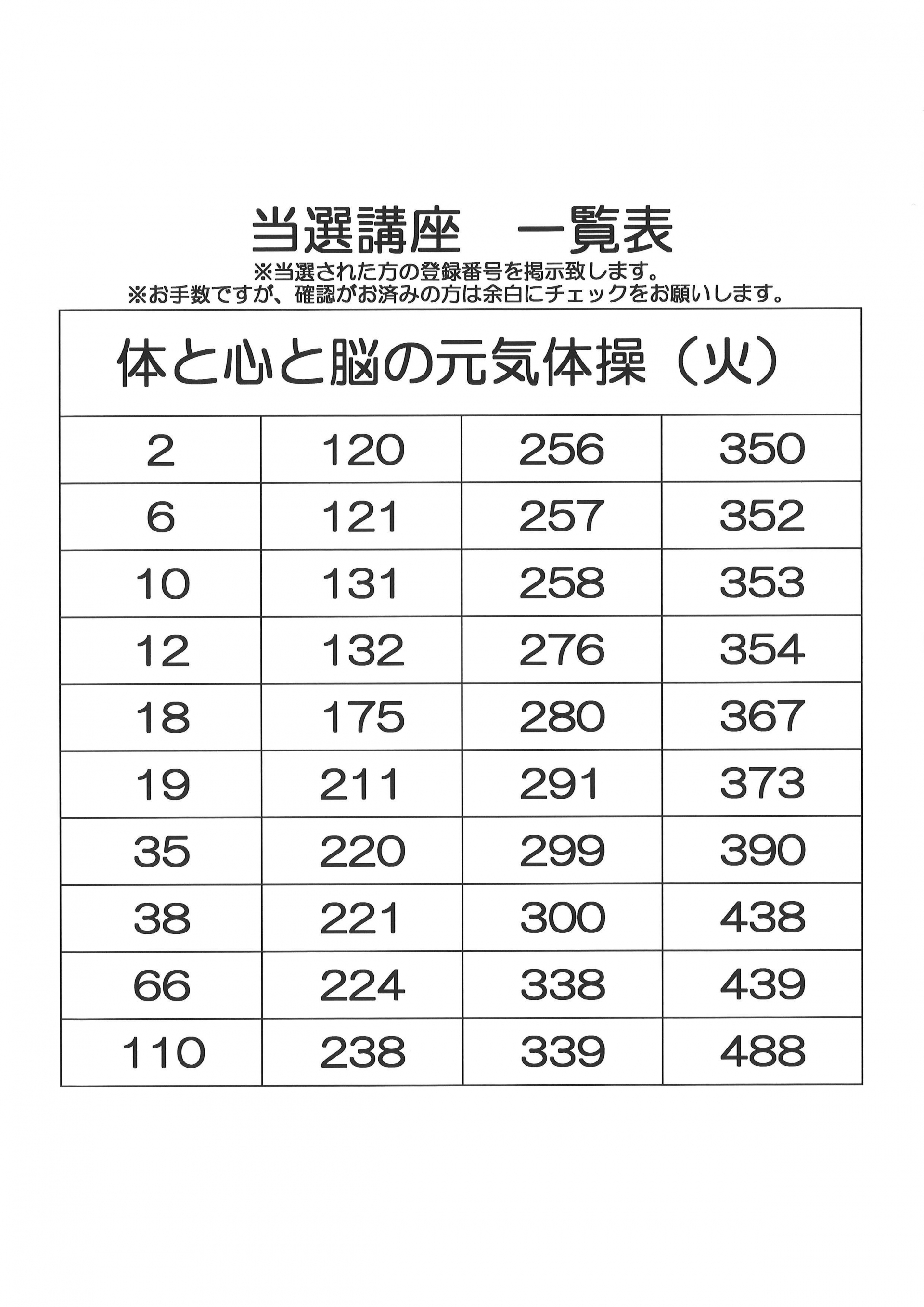 2024.03.08 お知らせ 【城東ふれあいセンター】定期講座抽選結果(健康講座) Tweet シェアする 皆さま、こんにちは 定期講座の抽選結果をお知らせします 番号は「申込番号」でご確認ください 以上になります よろしくお願いいたします 城東ふれあいセンター A.S 前の記事 2024.03.08 お知らせ 【城東ふれあいセンター】定期講座抽選結果(教養講座) 次の記事 2024.03.06 お知らせ ボランティア活動報告「桜満開!装飾ボラの活動」 一覧へ戻る