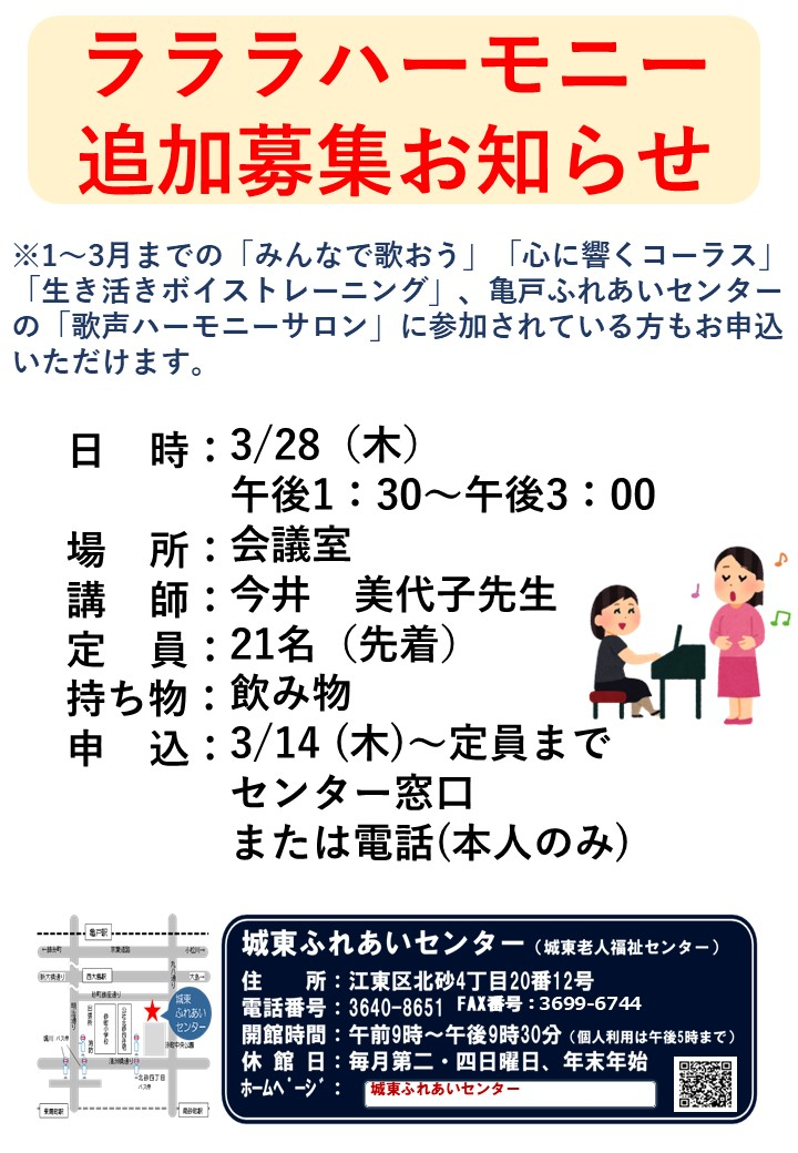 2024.03.11 お知らせ 追加募集のご案内 Tweet シェアする ※申込は3月14日(木)~ 城東ふれあいセンター A.S 前の記事 2024.03.12 お知らせ ポスター掲示 講座募集案内 次の記事 2024.03.09 お知らせ パステル体験講座 一覧へ戻る