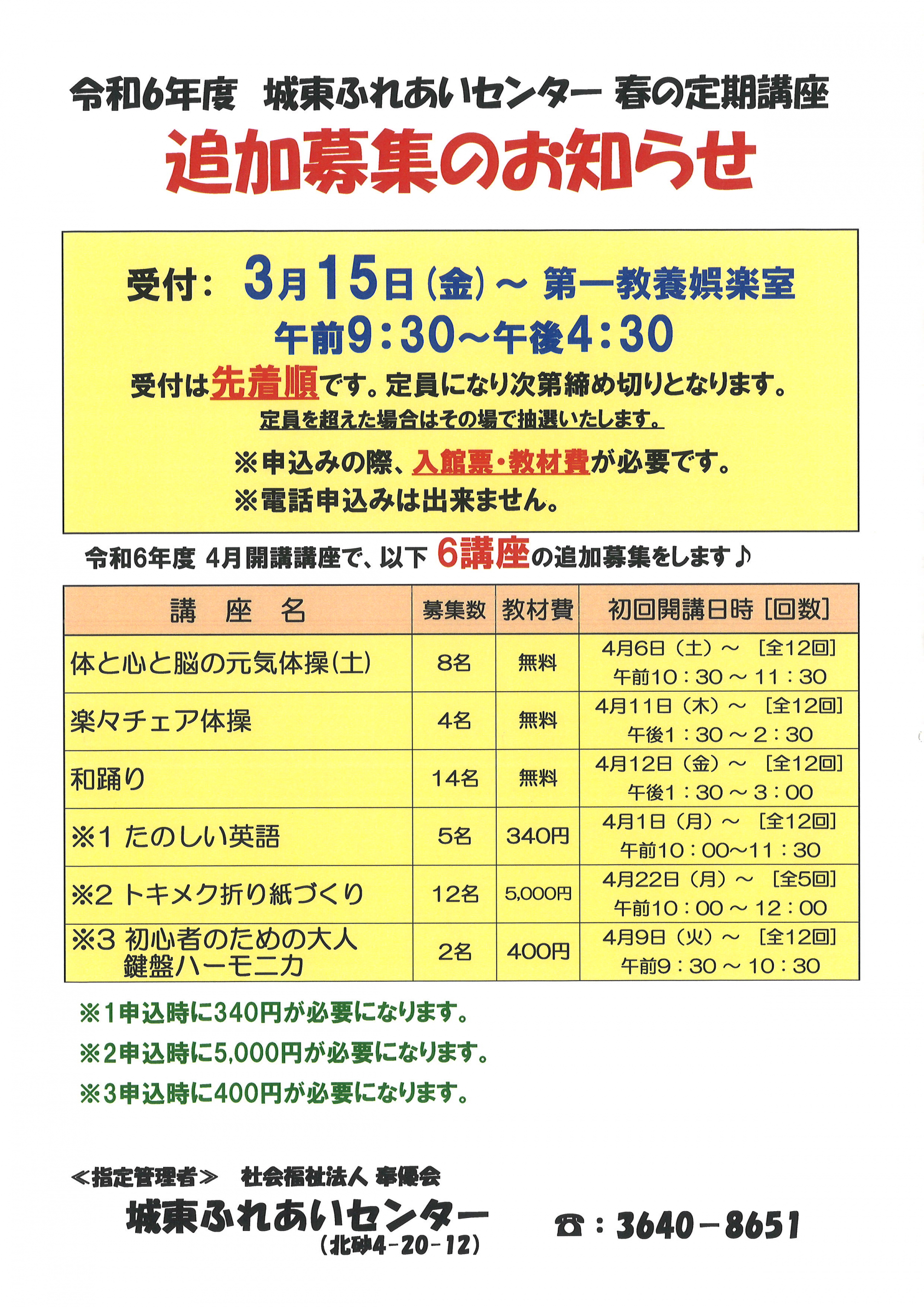 2024.03.14 お知らせ 追加募集のご案内【定期講座】 Tweet シェアする 4月開講定期講座にて追加募集のご案内です ご興味のある方はぜひお申込お待ちしております。 申込は来館のみになりますのでご注意ください!!! 城東ふれあいセンター A.S 前の記事 2024.03.17 お知らせ 3月の『新聞ちぎり絵』 次の記事 2024.03.12 お知らせ ポスター掲示 講座募集案内 一覧へ戻る