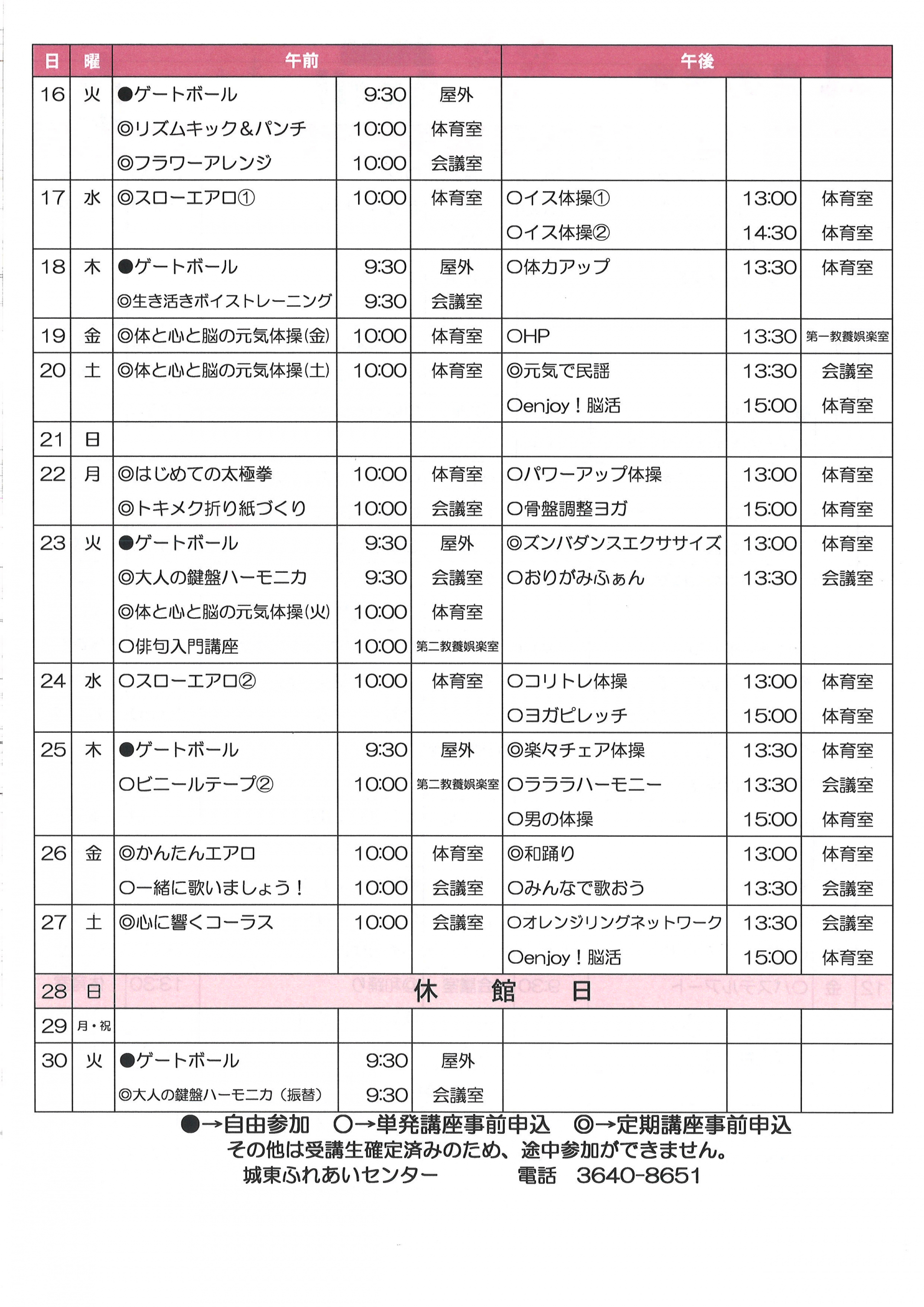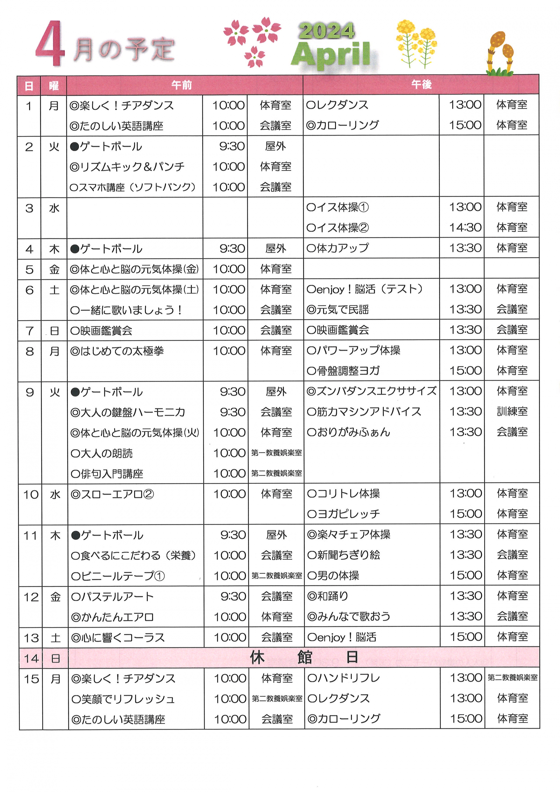 2024.03.25 お知らせ 城東ふれあいセンター 4月予定表 Tweet シェアする 皆さま、こんにちは 4月の予定表をお知らせします 皆さまのご予定を立てる際に、ご活用いただけると幸いです 城東ふれあいセンター 前の記事 2024.03.27 お知らせ ゆうゆう体操400回達成!! 次の記事 2024.03.25 お知らせ 3月号掲載単発健康・3ヶ月講座当選一覧 一覧へ戻る