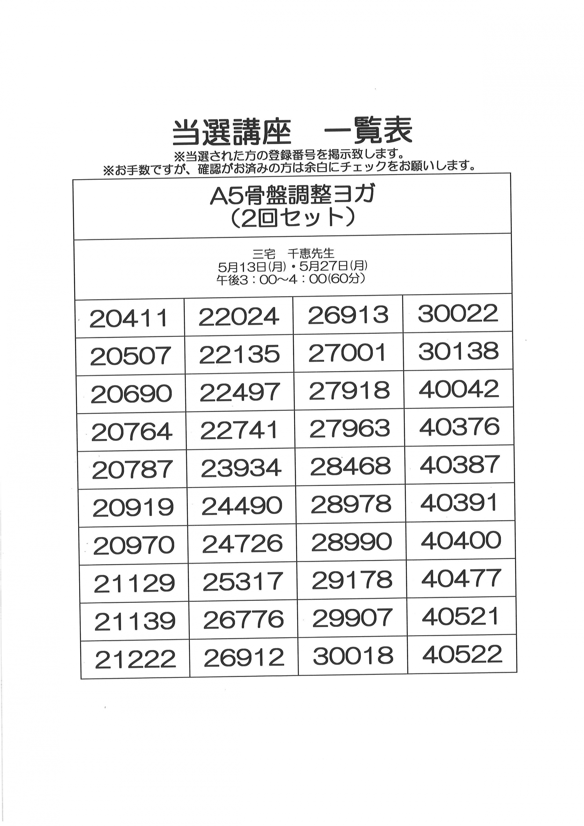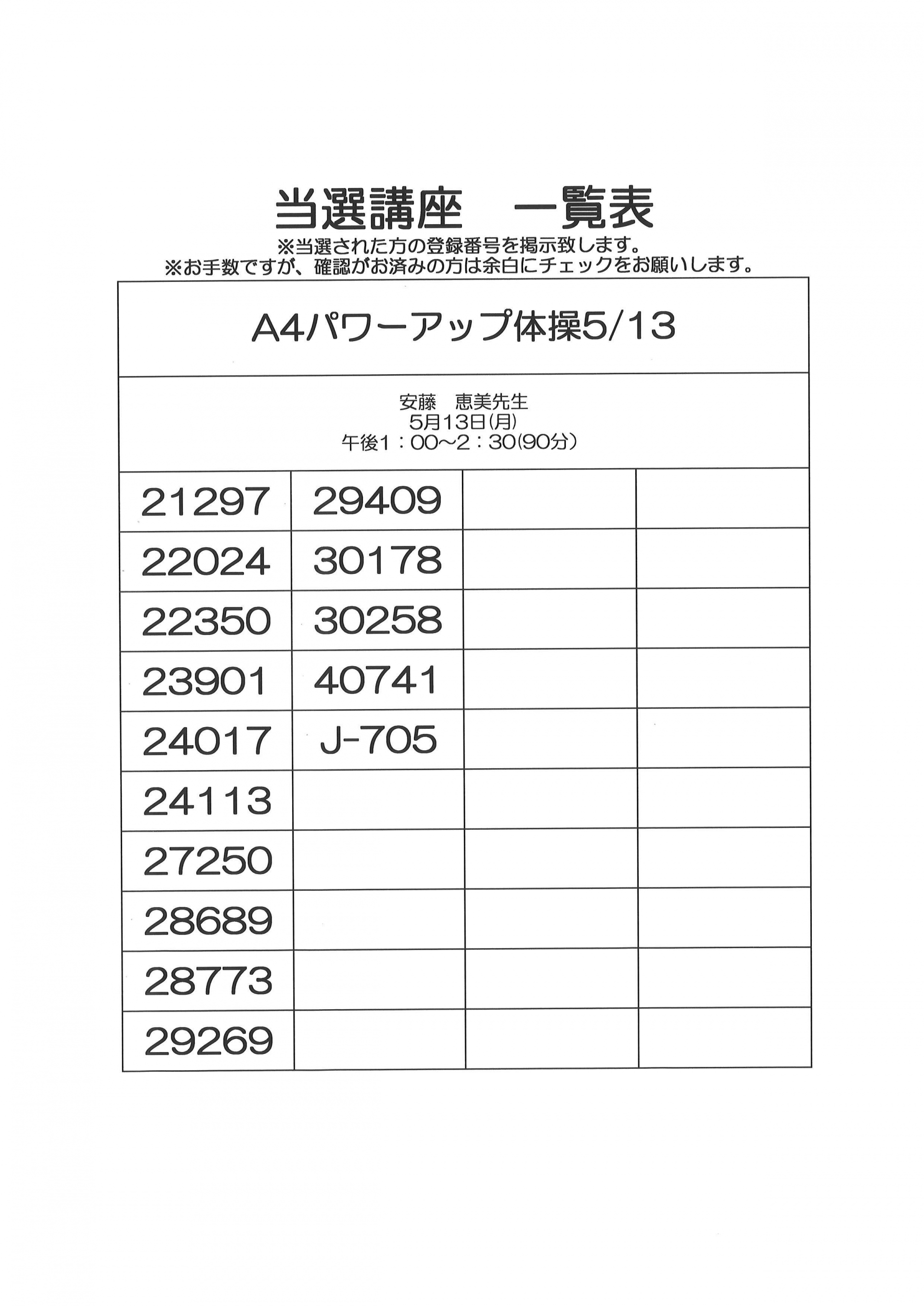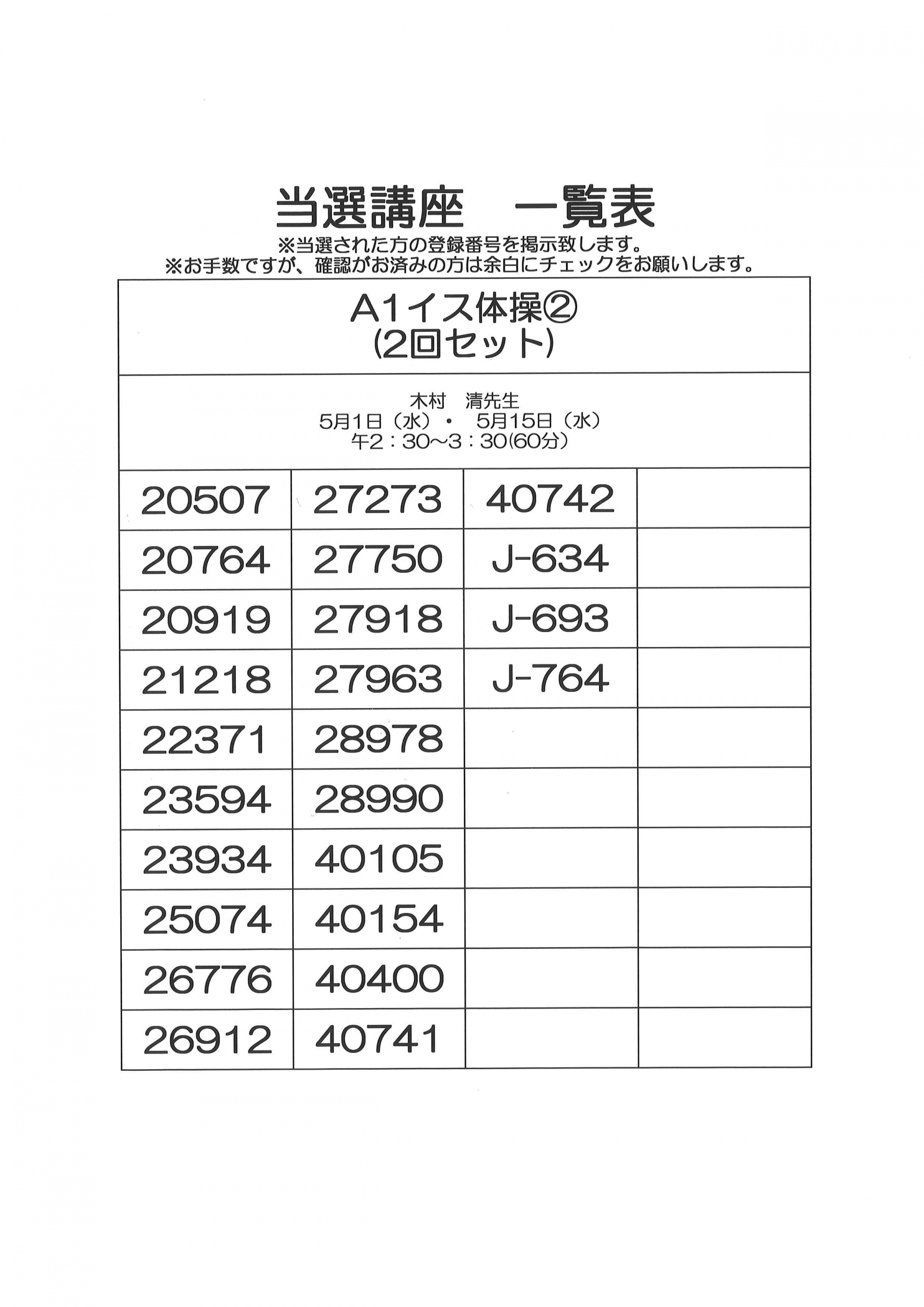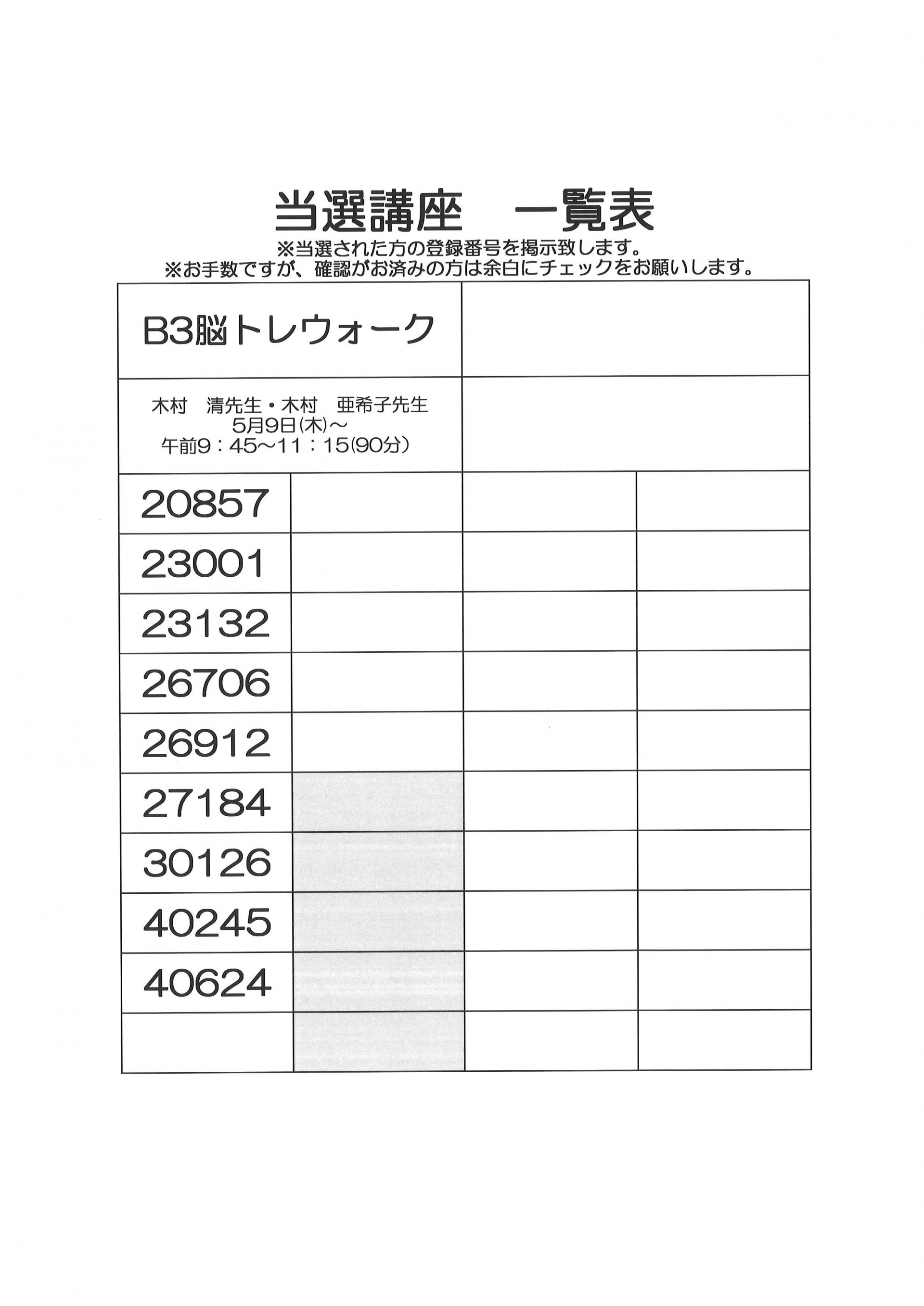 2024.04.24 活動報告 5月前半(単発・特別)講座当選一覧 Tweet シェアする 5月前半(単発・特別)講座 当選一覧です。ご確認をよろしくお願いいたします。 城東ふれあいセンター M.M 前の記事 2024.04.24 活動報告 「4月のおりがみふぁん」 次の記事 2024.04.23 活動報告 『俳句入門講座』 一覧へ戻る