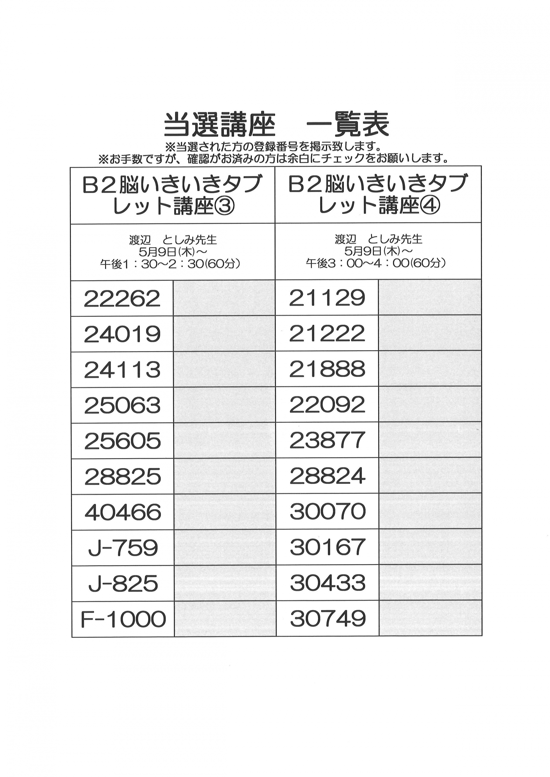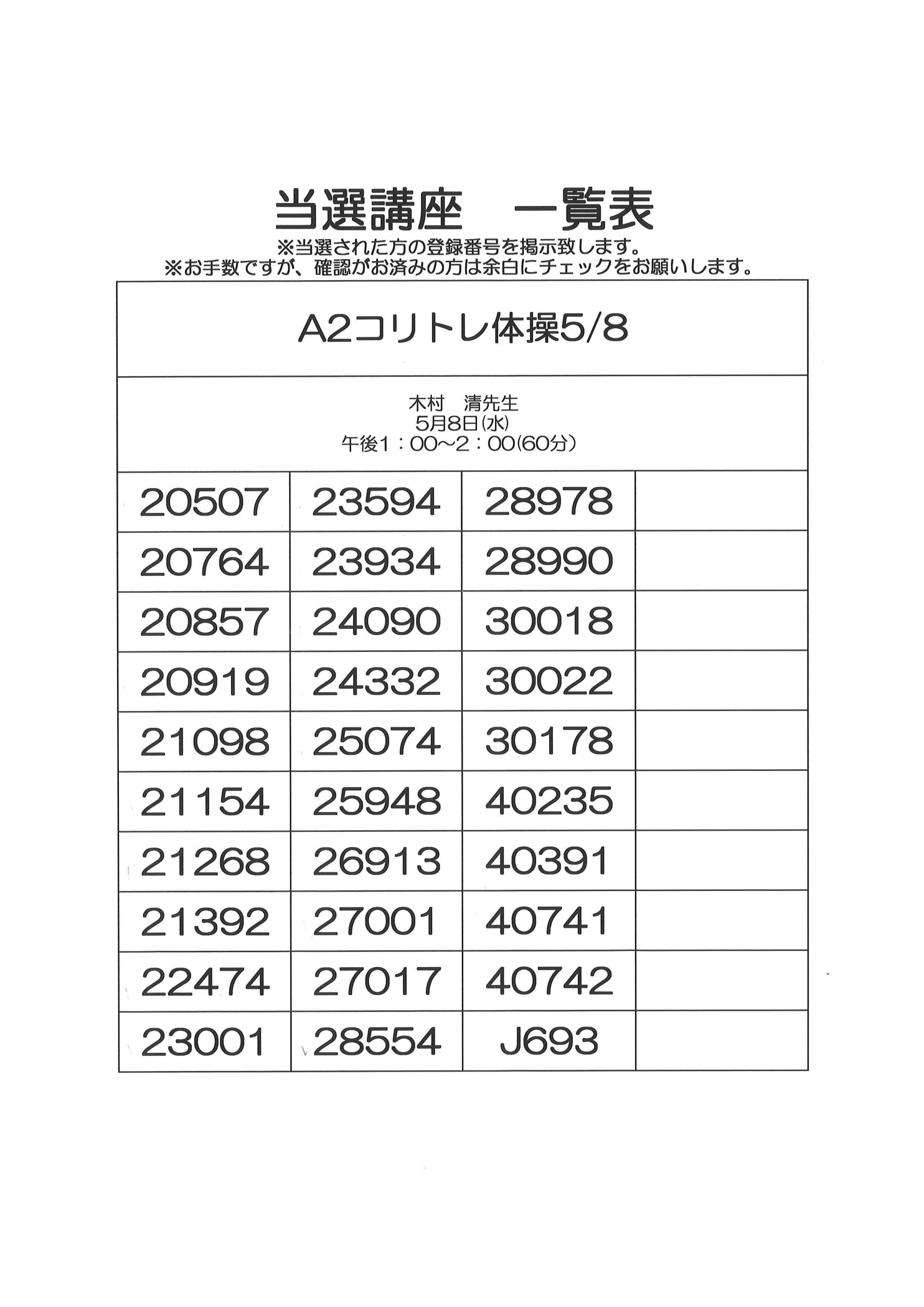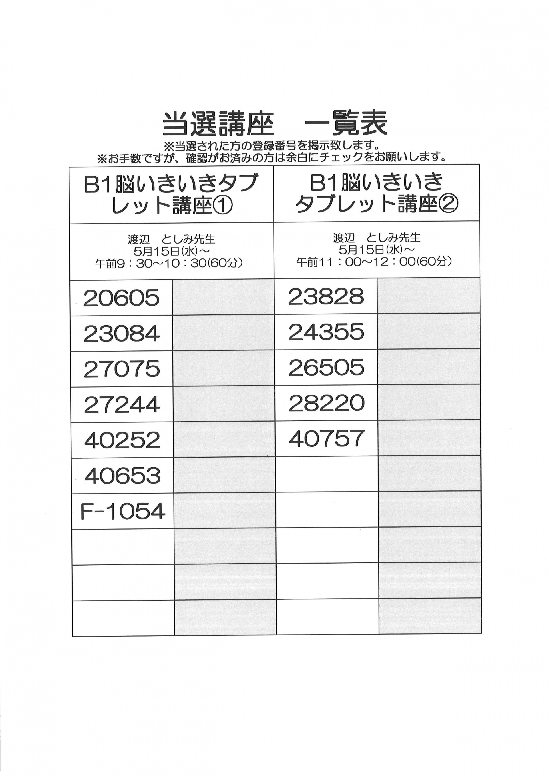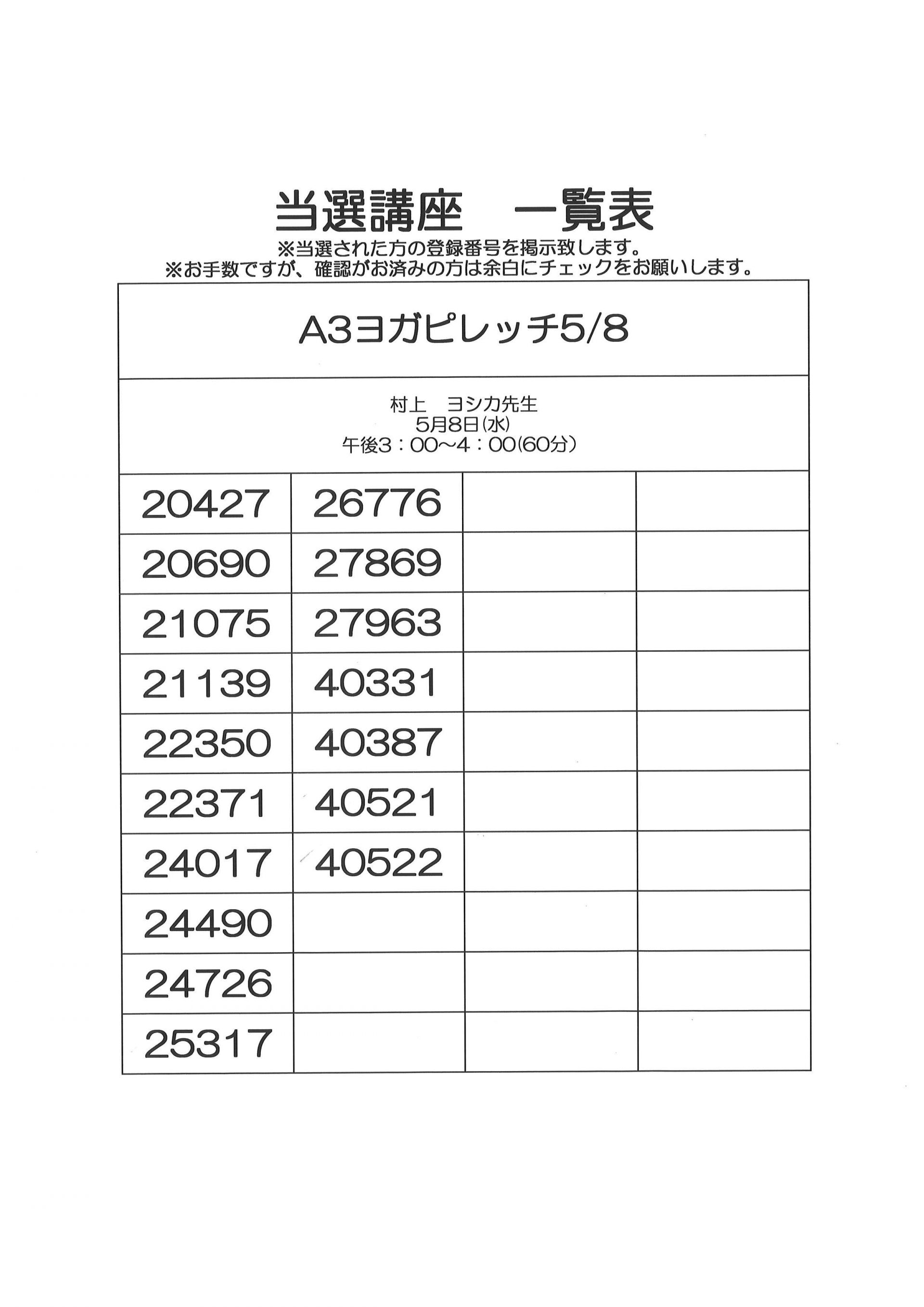 2024.04.24 活動報告 5月前半(単発・特別)講座当選一覧 Tweet シェアする 5月前半(単発・特別)講座 当選一覧です。ご確認をよろしくお願いいたします。 城東ふれあいセンター M.M 前の記事 2024.04.24 活動報告 「4月のおりがみふぁん」 次の記事 2024.04.23 活動報告 『俳句入門講座』 一覧へ戻る