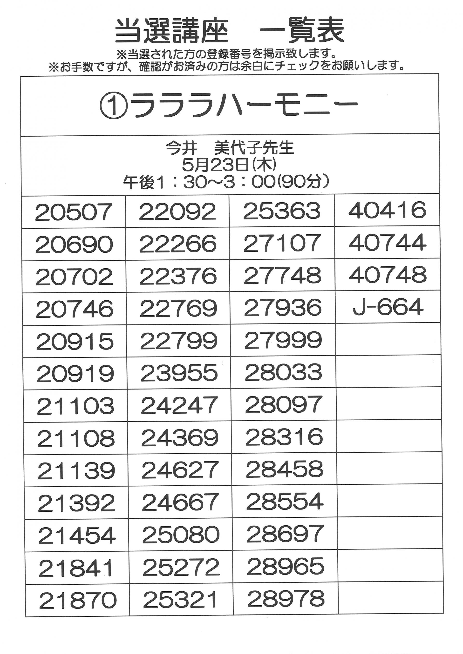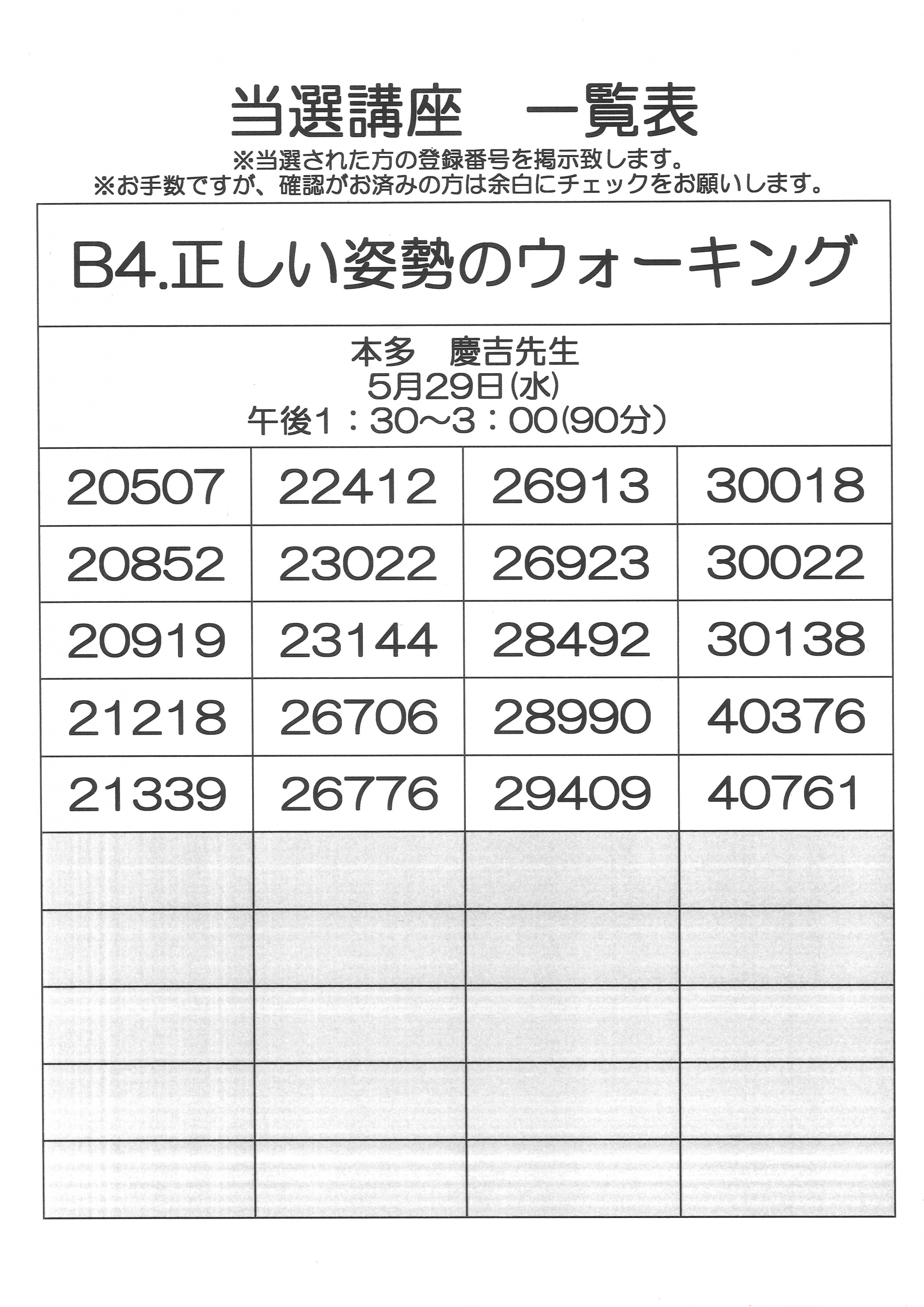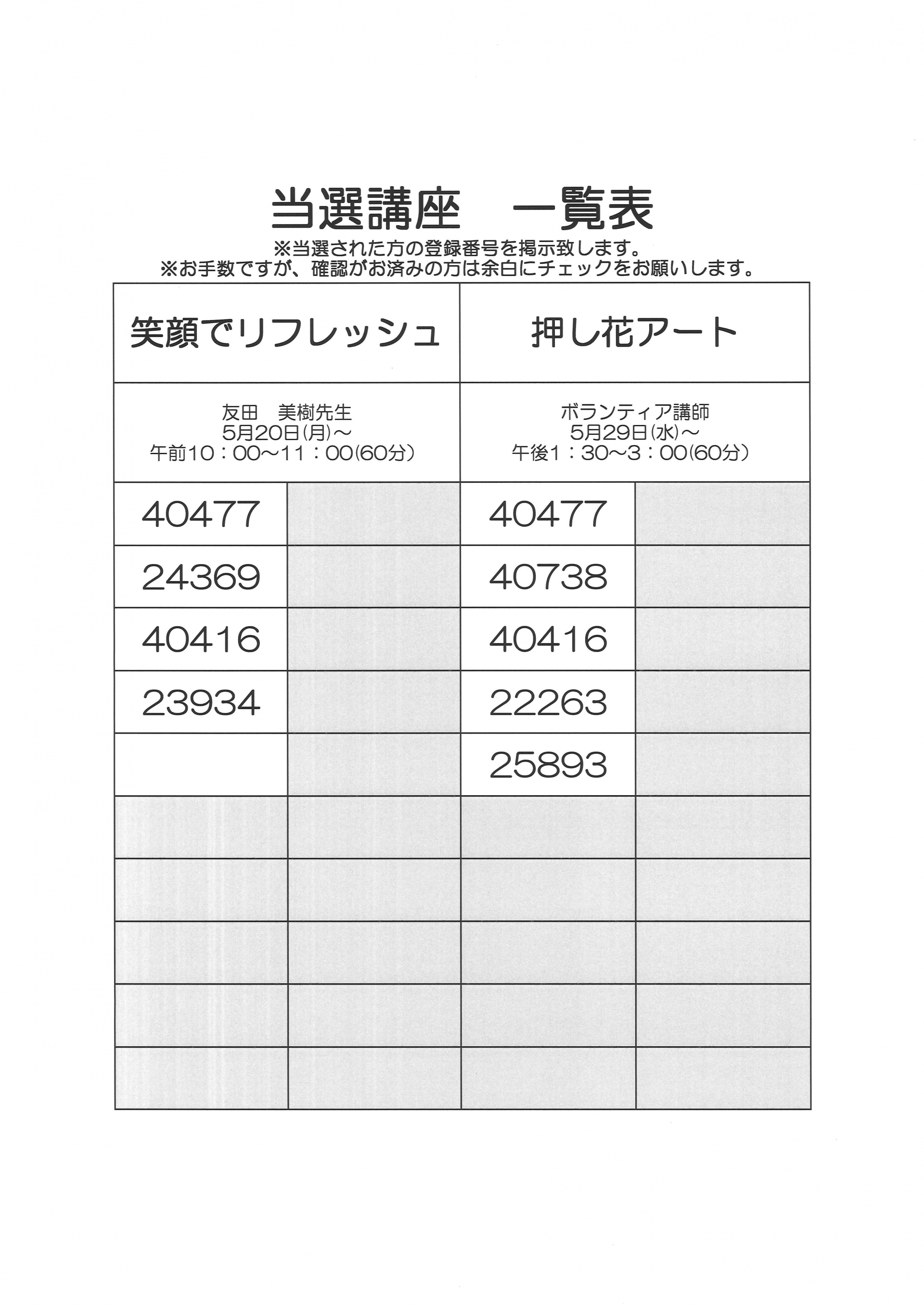 2024.05.07 お知らせ 5月後半開催 単発講座【当選一覧】 Tweet シェアする 5月後半に開催されます講座の当選一覧です。 どうぞご確認ください! 城東ふれあいセンター A.S 前の記事 2024.05.08 お知らせ 追加募集のご案内 次の記事 2024.05.05 お知らせ 自由参加できます『気軽に集える運動ひろば』 一覧へ戻る