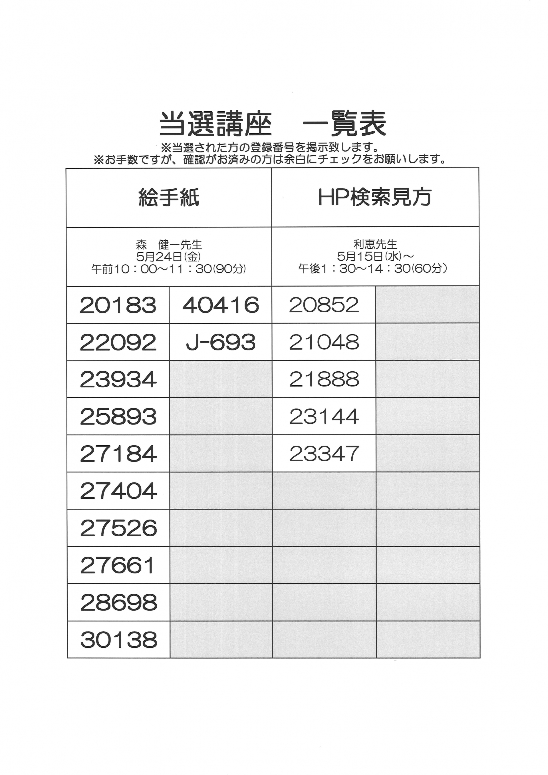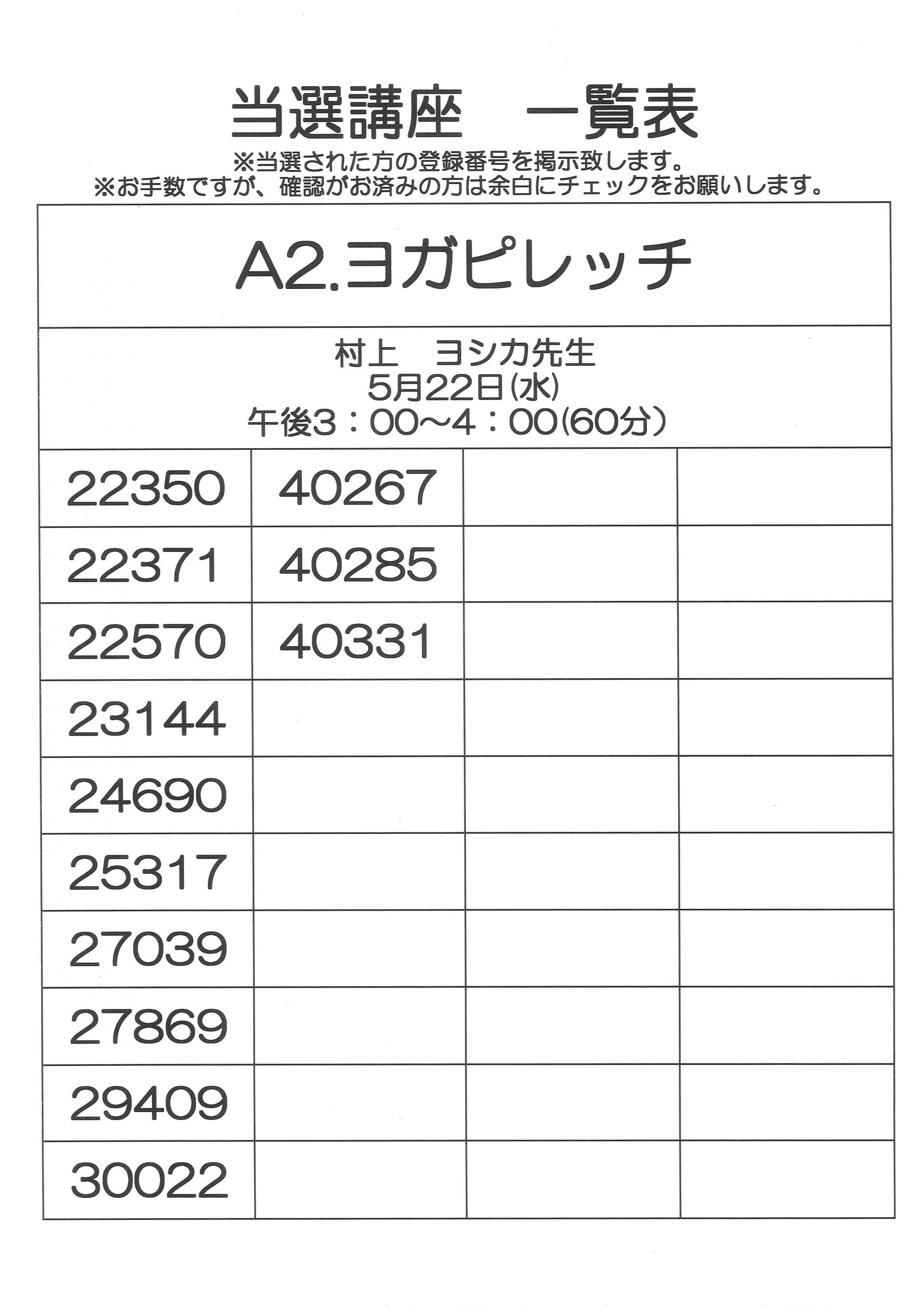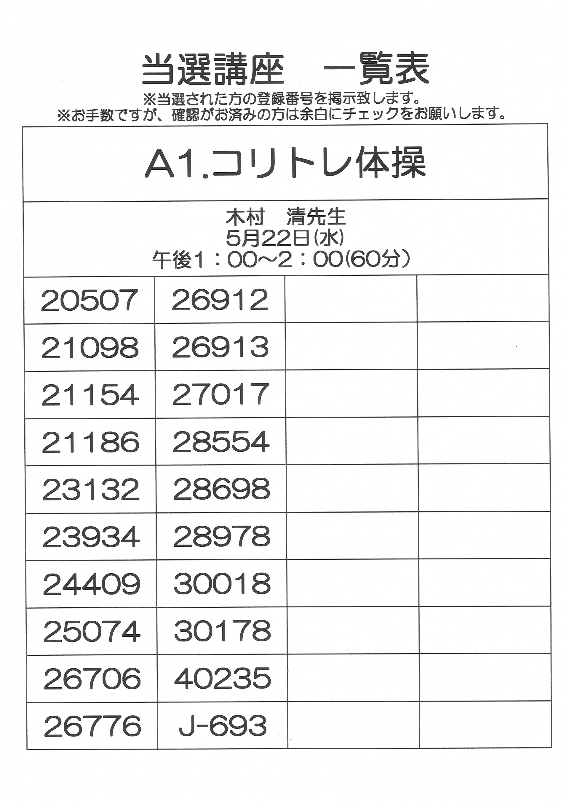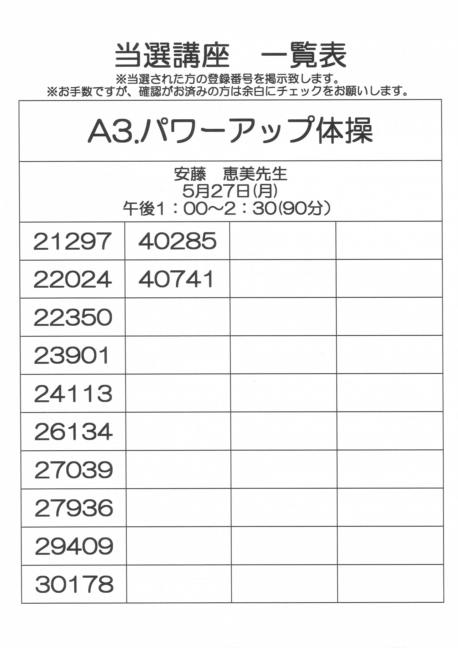 2024.05.07 お知らせ 5月後半開催 単発講座【当選一覧】 Tweet シェアする 5月後半に開催されます講座の当選一覧です。 どうぞご確認ください! 城東ふれあいセンター A.S 前の記事 2024.05.08 お知らせ 追加募集のご案内 次の記事 2024.05.05 お知らせ 自由参加できます『気軽に集える運動ひろば』 一覧へ戻る