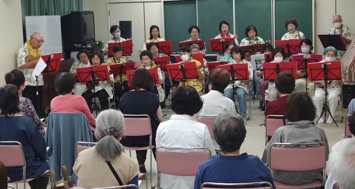カイマナヒラ、BEYOND THE REEFなどのハワイアンの名曲に加え、思い出の渚、亜麻色の髪の乙女など、世代を超えて歌い継がれてきた曲の演奏に観客も声を合わせ、会場が一つになったステキなコンサートとなりました。プログラムの曲目の演奏終了後には、もうお終い? 今度はいつ? またね、などの声が飛び交い、皆さん早くも次回の開催に期待を膨らませていました。