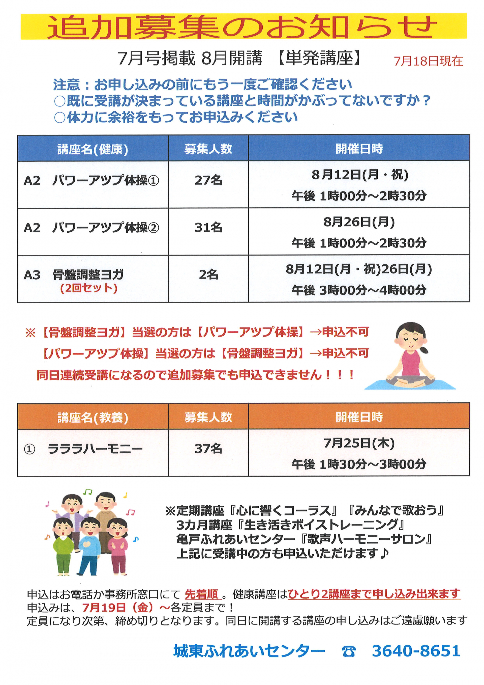 2024.07.18 お知らせ 【8月開催講座】追加募集のご案内 Tweet シェアする 皆さま、こんにちは(^^♪8月開催講座 追加募集のお知らせです。お申込みは7/19(金)からです。たくさんのお申し込みお待ちしております。!! 前の記事 2024.07.19 お知らせ 3カ月講座【パステルアート】 次の記事 2024.07.16 お知らせ 【7月開催】押し花アート講座 一覧へ戻る