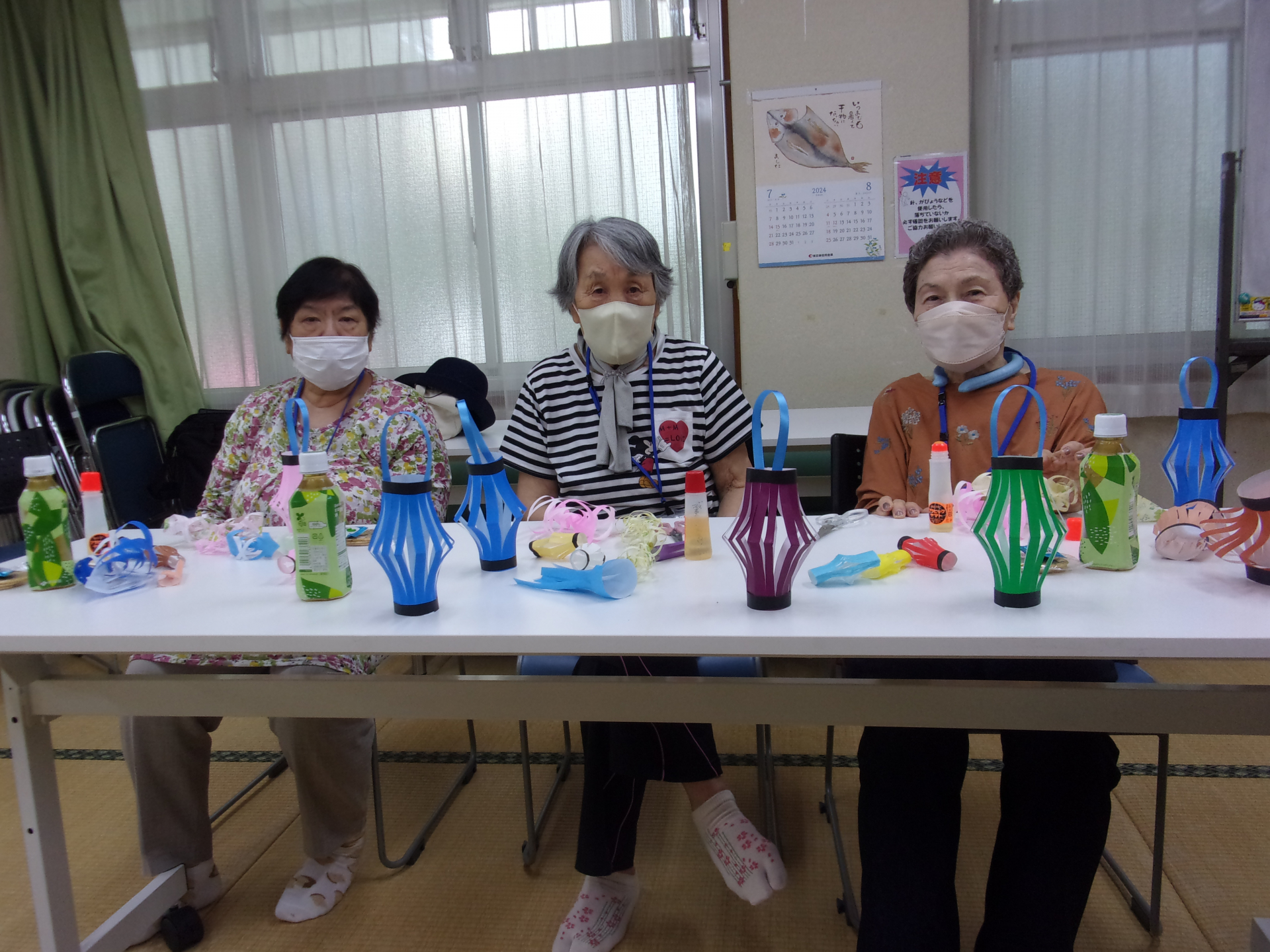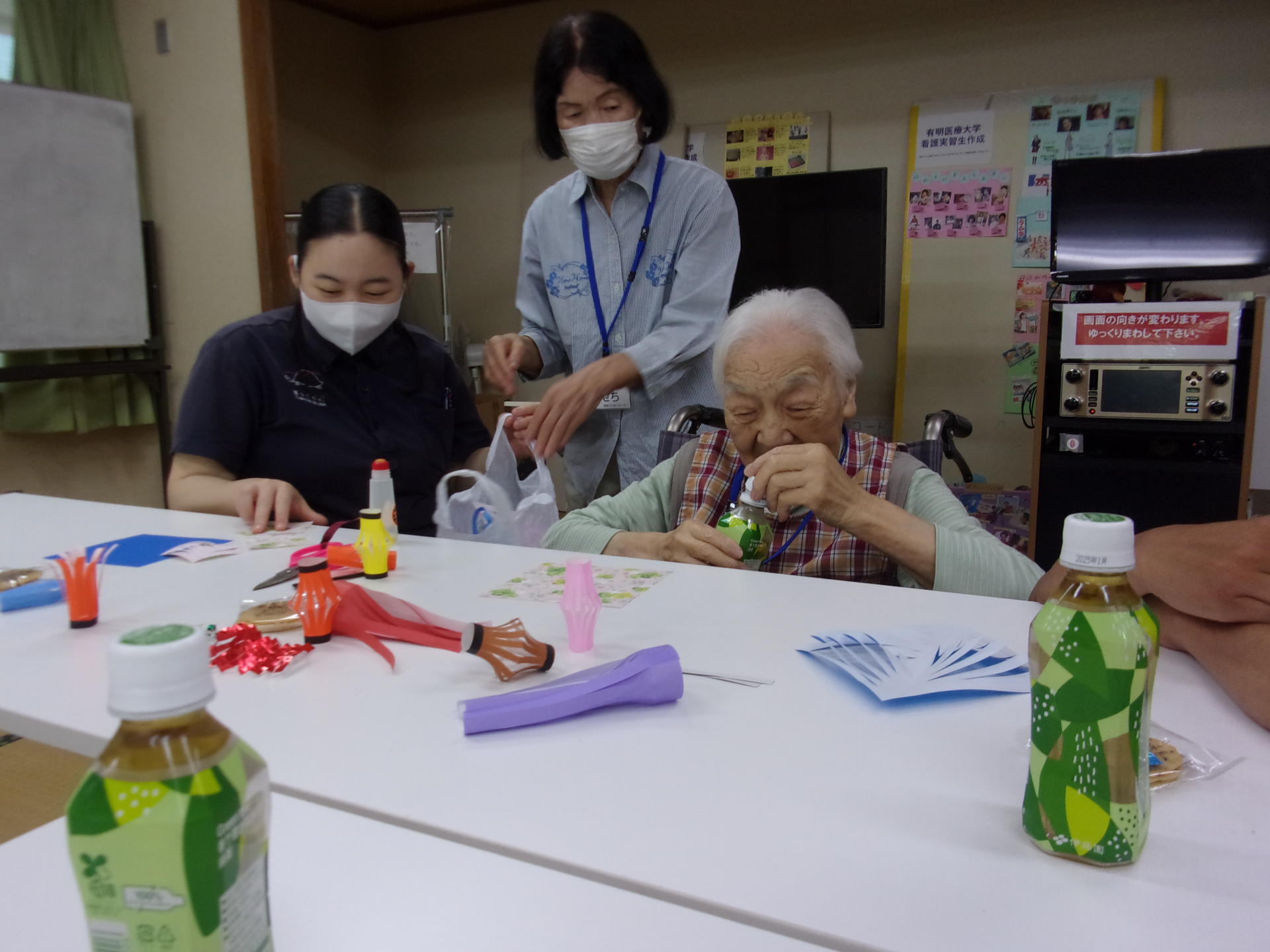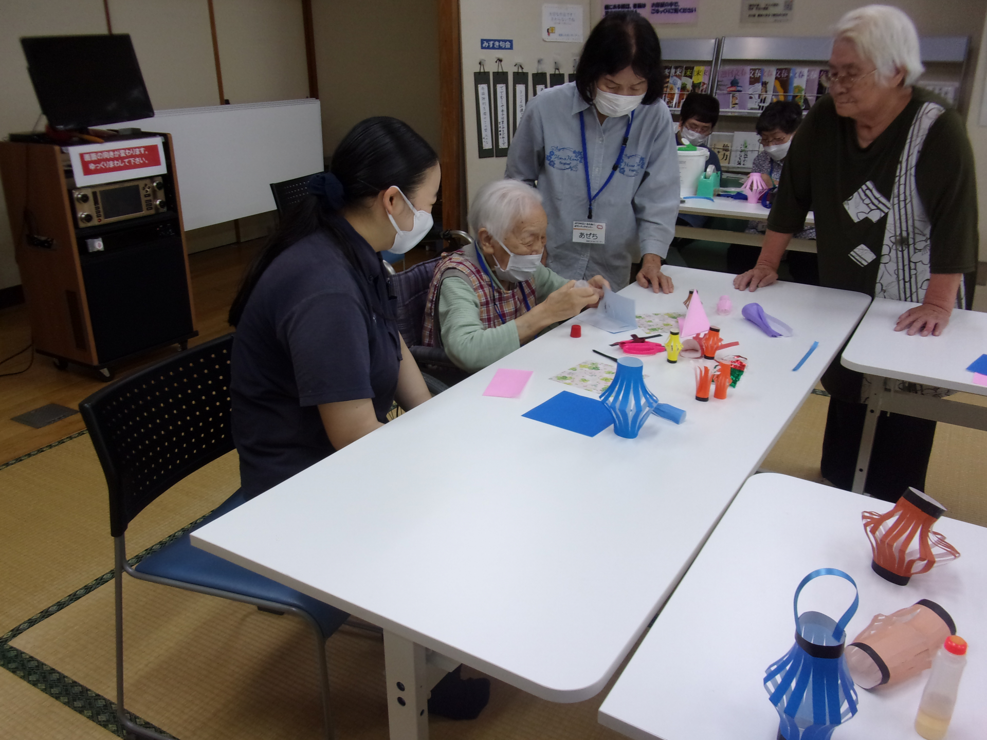 体操・おりがみで七夕飾 りを作ったり・楽しくお喋りしたり・ハーモニカの伴奏で歌を歌ったり、