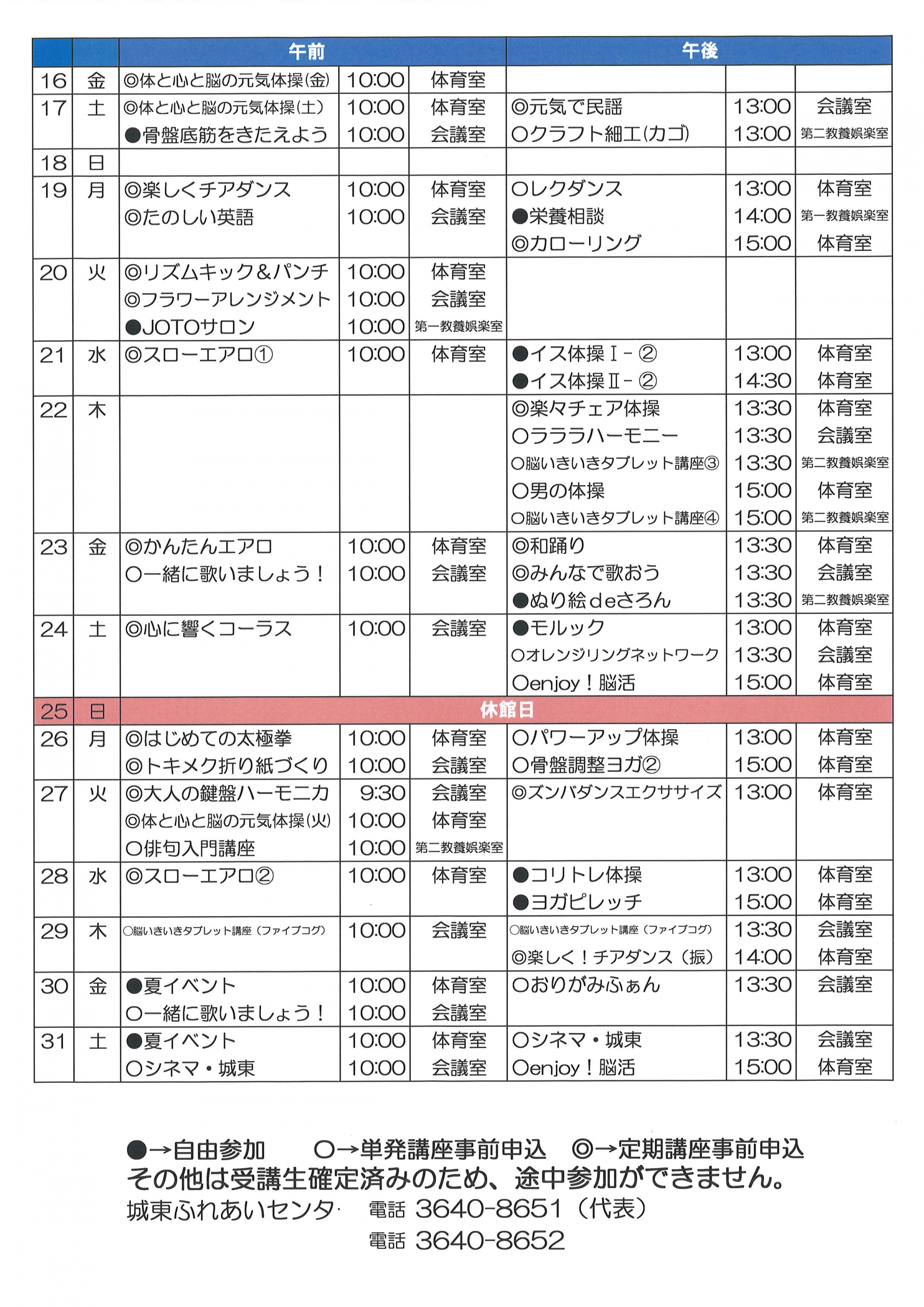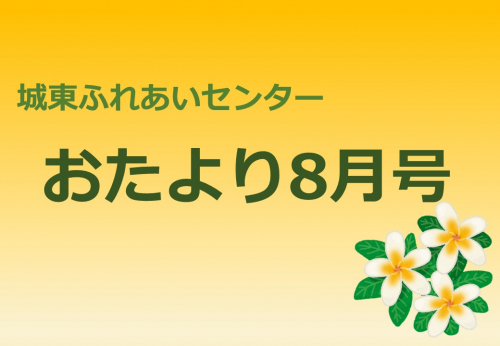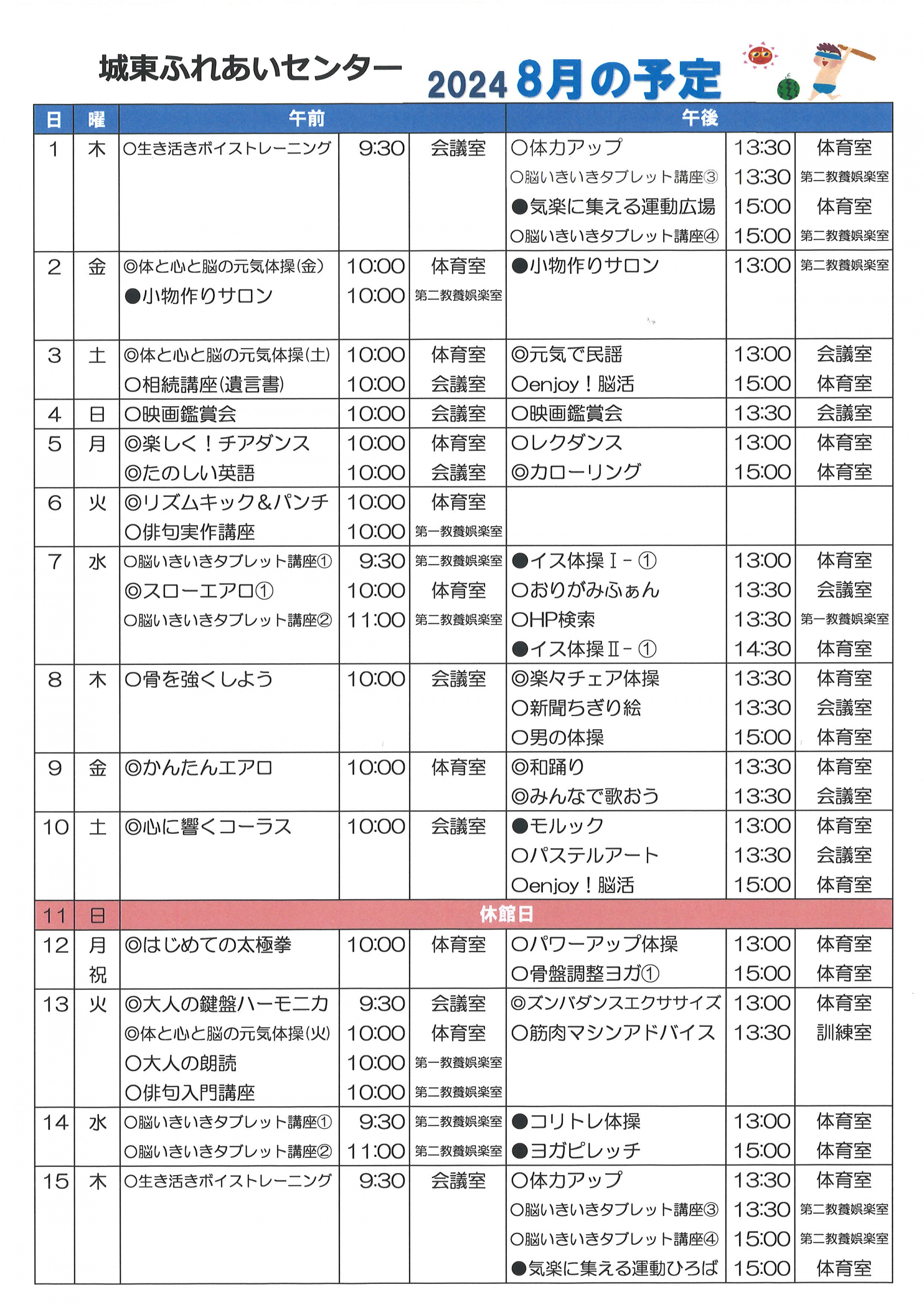 2024.07.25 お知らせ 城東ふれあいセンター 8月予定表 Tweet シェアする 皆さま、こんにちは 8月の予定表をお知らせします 皆さまのご予定を立てる際に、ご活用いただけると幸いです 城東ふれあいセンター 前の記事 2024.07.26 お知らせ 消しゴムはんこ 次の記事 2024.07.25 お知らせ 城東ふれあいセンター おたより8月号 一覧へ戻る