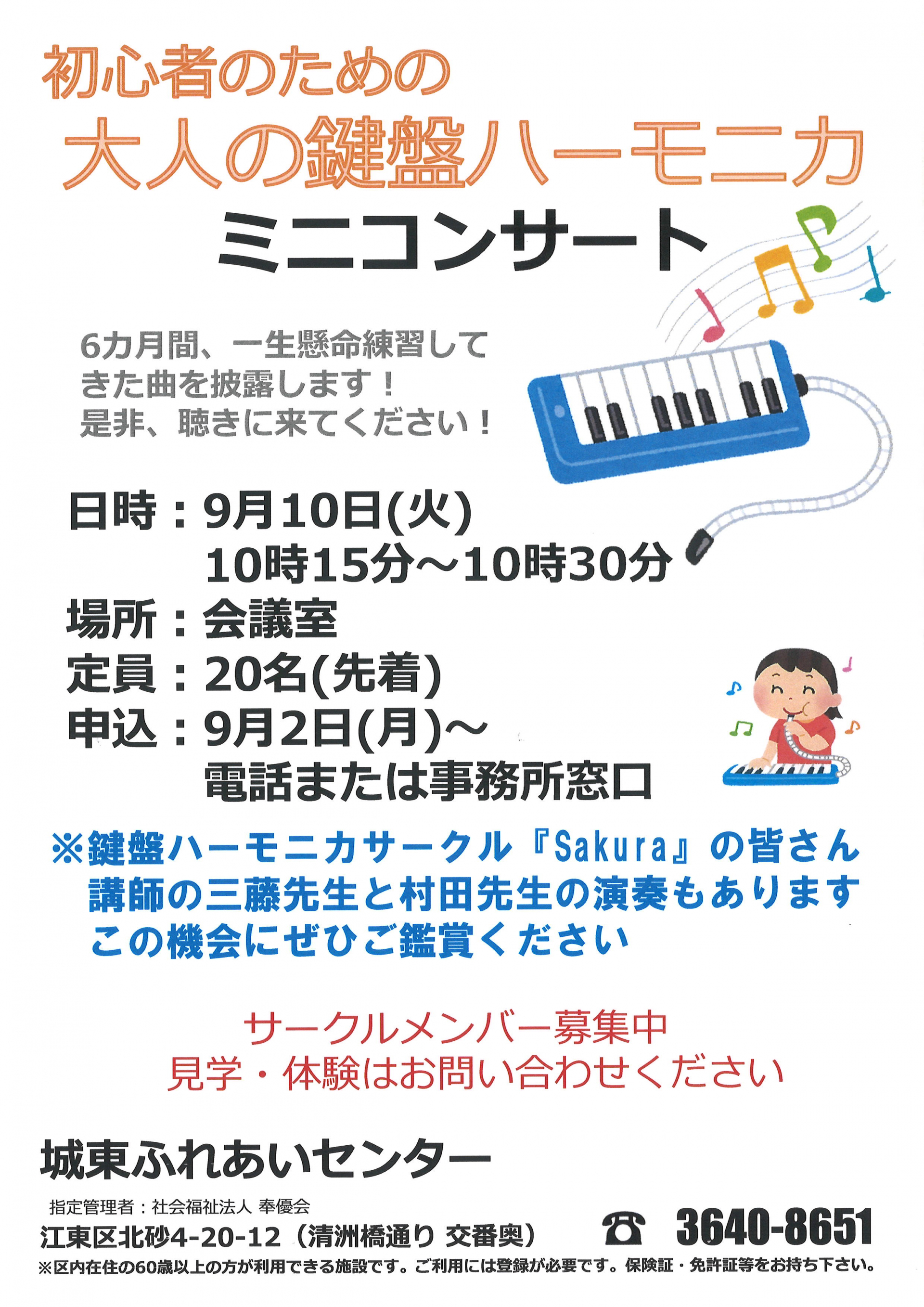 定期講座『初心者のための大人鍵盤ハーモニカ』よりお知らせです