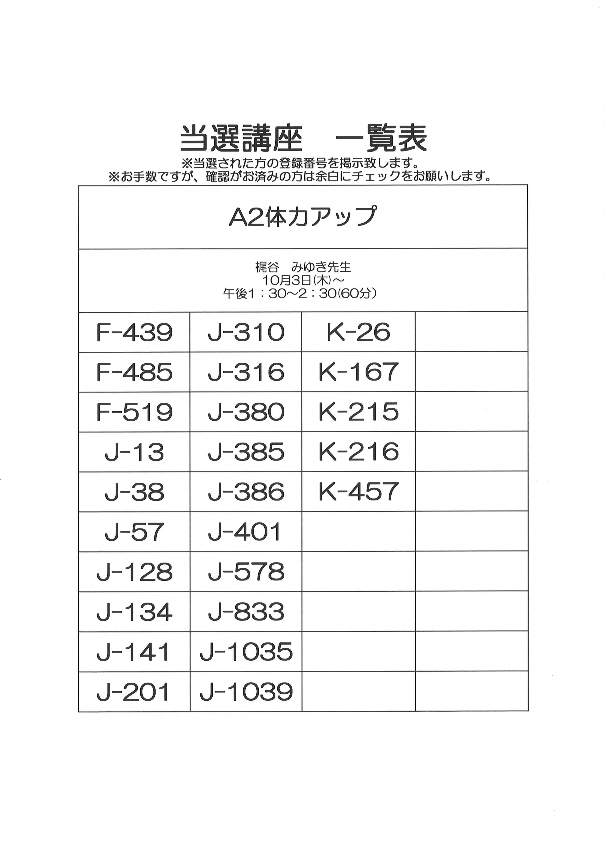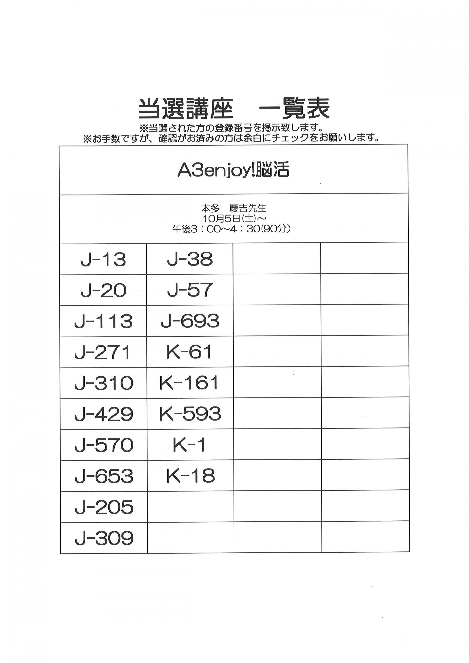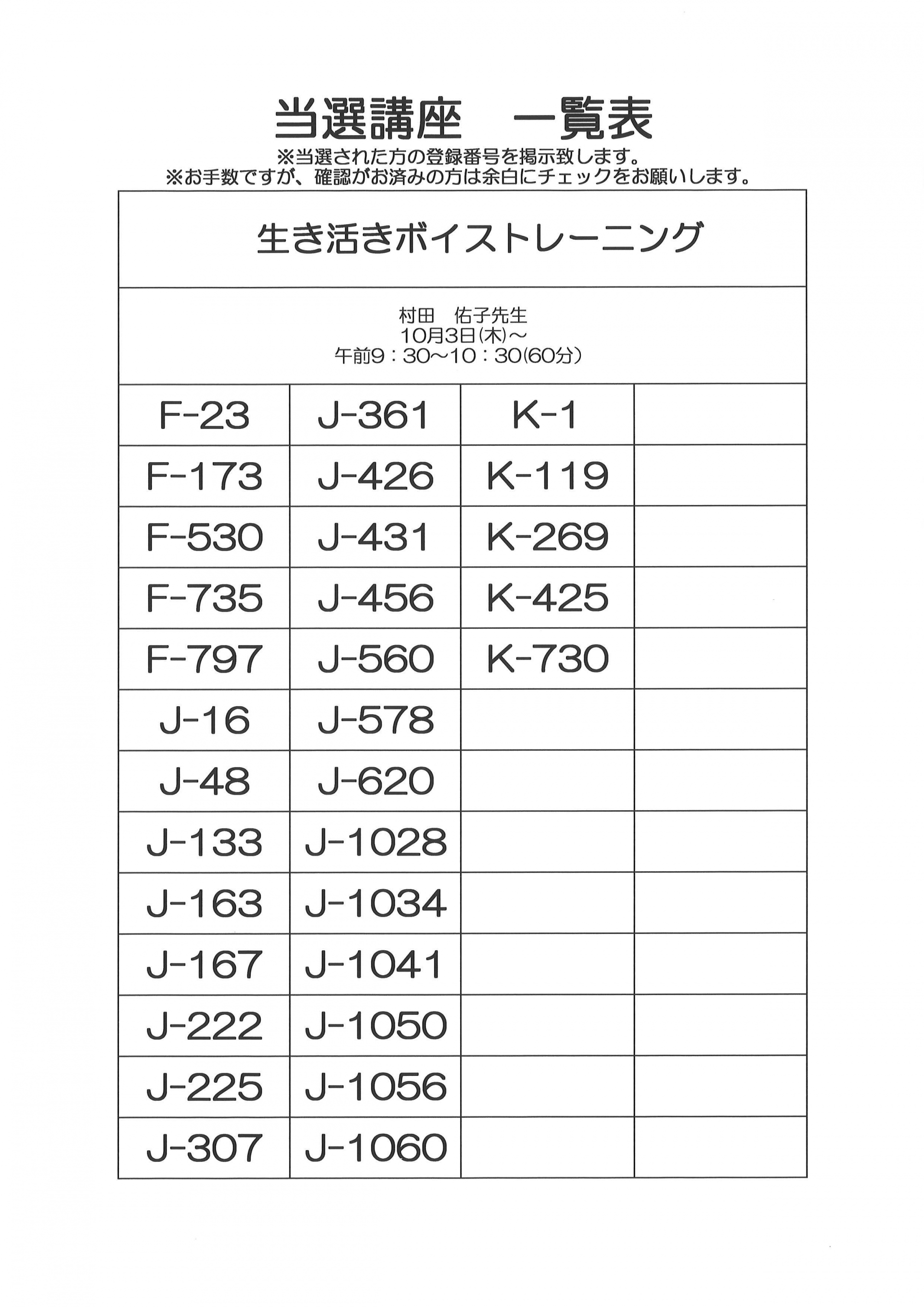 2024.09.09 お知らせ 10月開講 3ヶ月講座 当選一覧 Tweet シェアする 10月開講3ヶ月講座 10月開講3ヶ月講座の当選一覧です。どうぞご確認ください。 城東ふれあいセンター Y.T 前の記事 2024.09.09 お知らせ 【城東ふれあいセンター】定期講座抽選結果(健康講座) 次の記事 2024.09.07 お知らせ 10月開催講座 当選連絡 一覧へ戻る