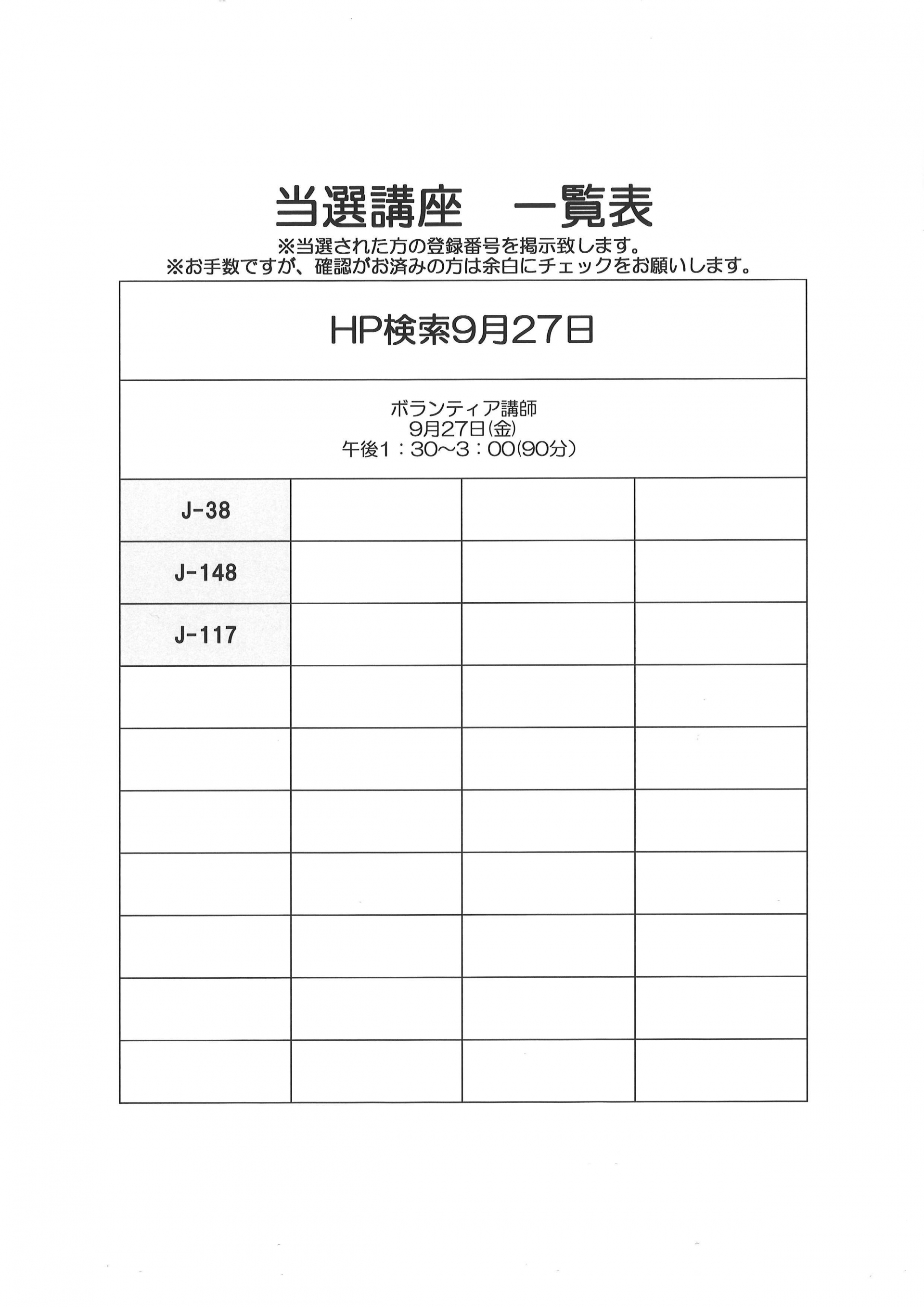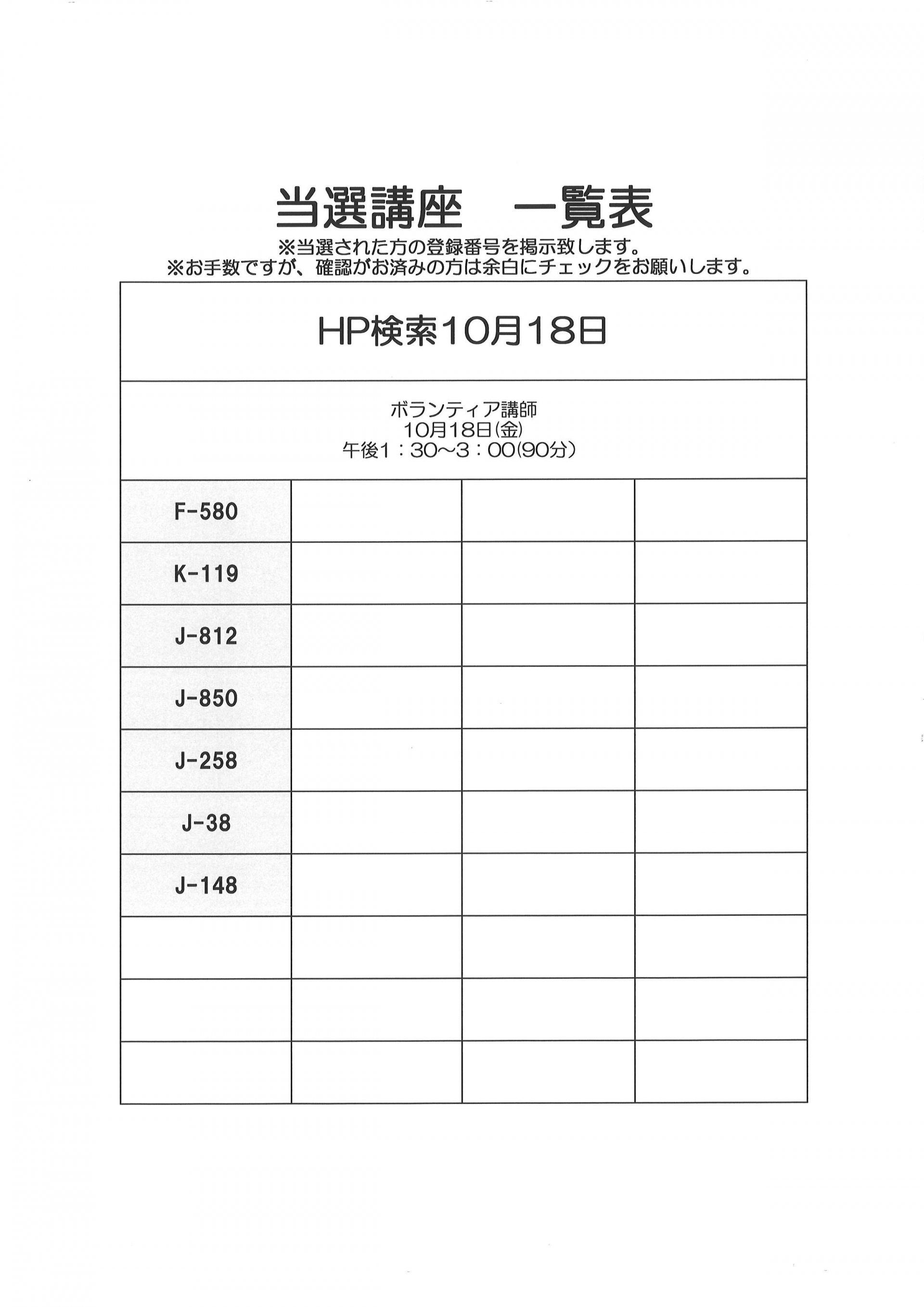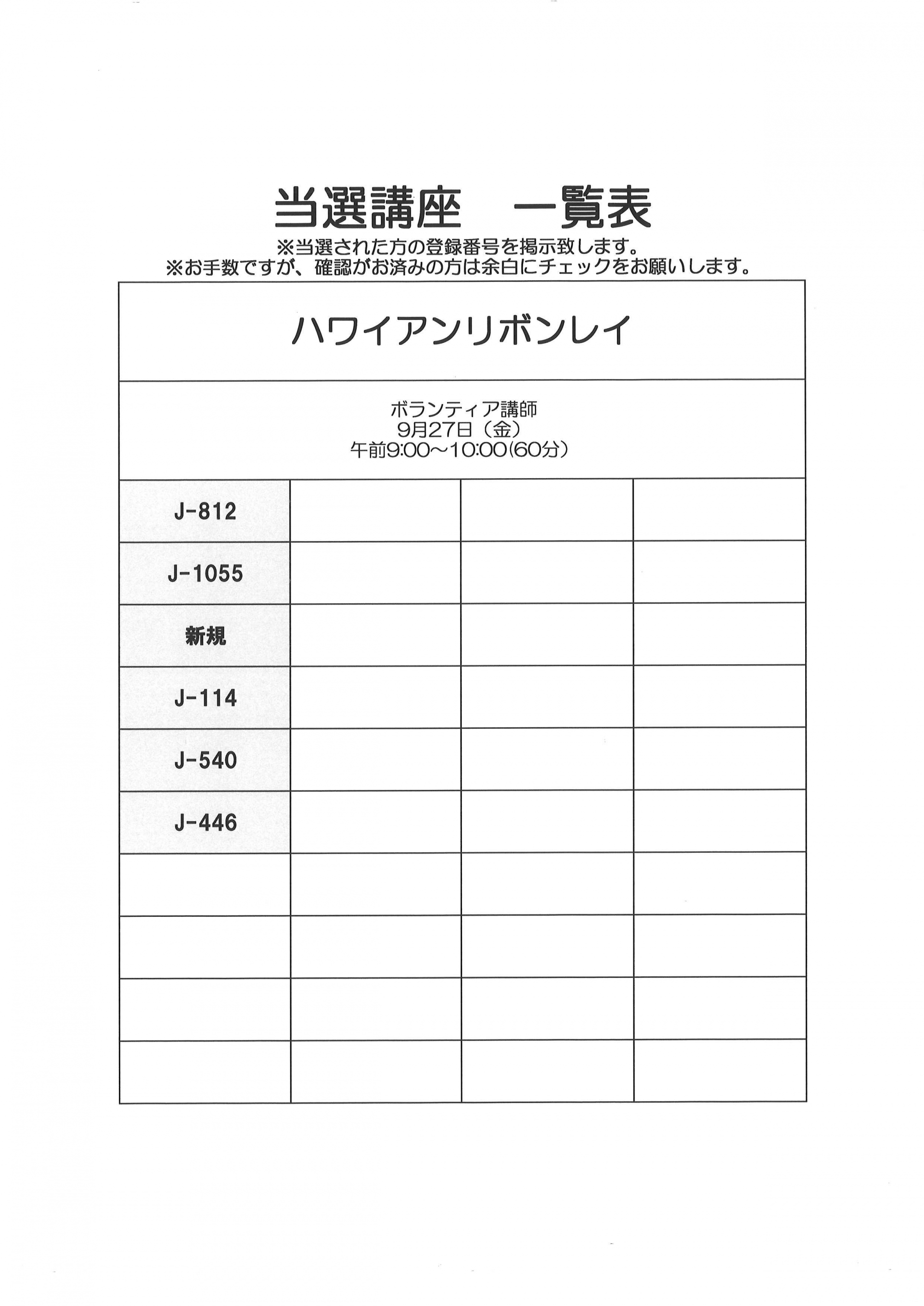 2024.09.11 活動報告(TH) ハワイアンリボンレイ HP検索 抽選単発講座 Tweet シェアする 9月開催講座 『抽選単発講座』の当選連絡です。お申込みされた方、ご確認ください。 城東ふれあいセンターKC 前の記事 2024.09.11 活動報告(TH) 10月開催歴史講座 次の記事 2024.09.11 活動報告(TH) モルック体験記(9月7日) 一覧へ戻る