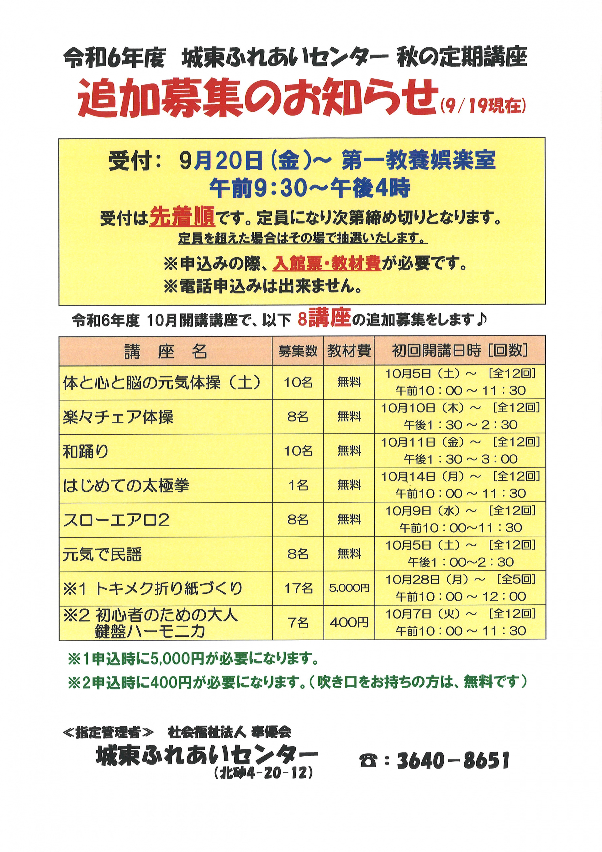 受付は9月20日(金)午前9時30~午後4時 第一教養娯楽室です。