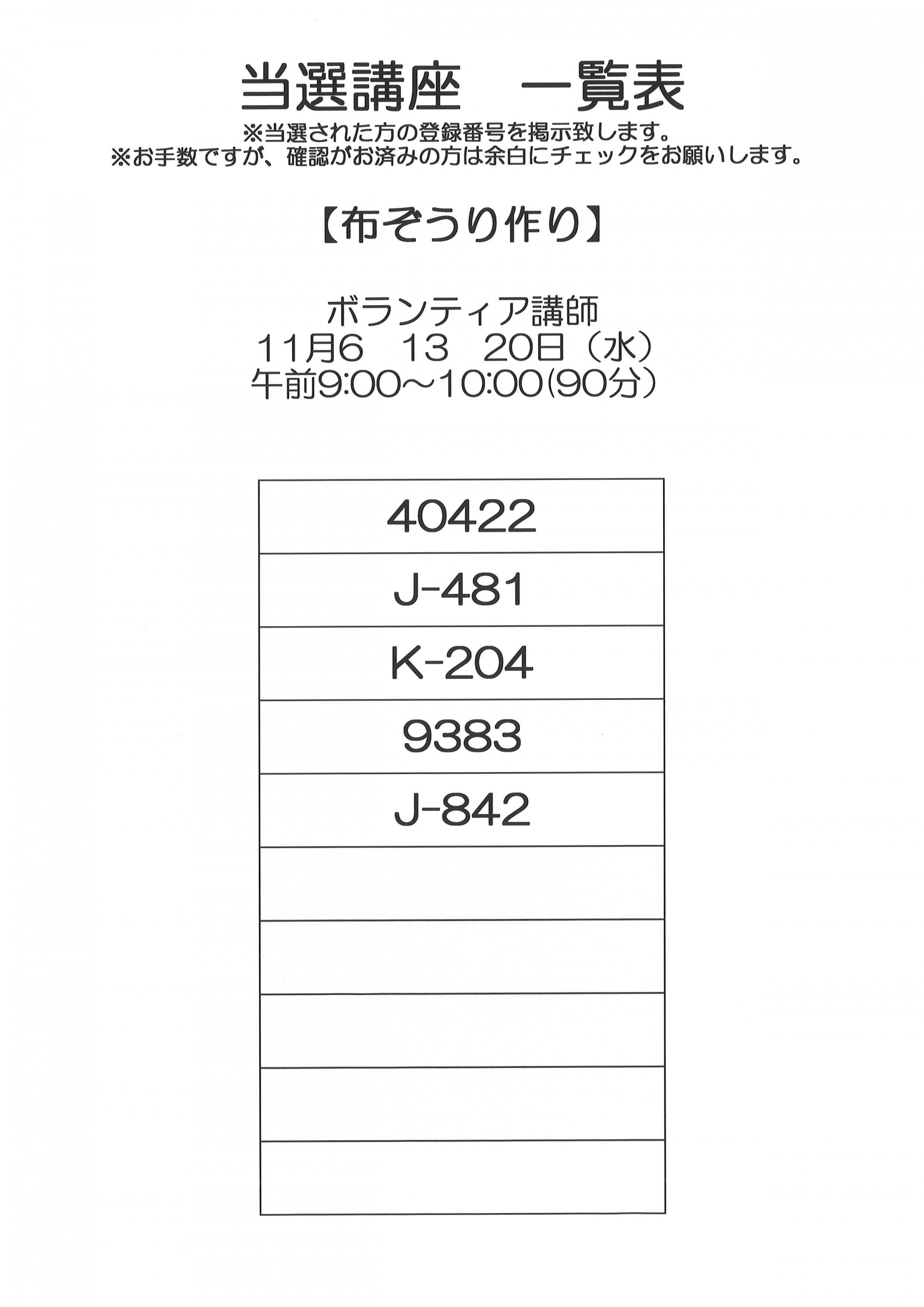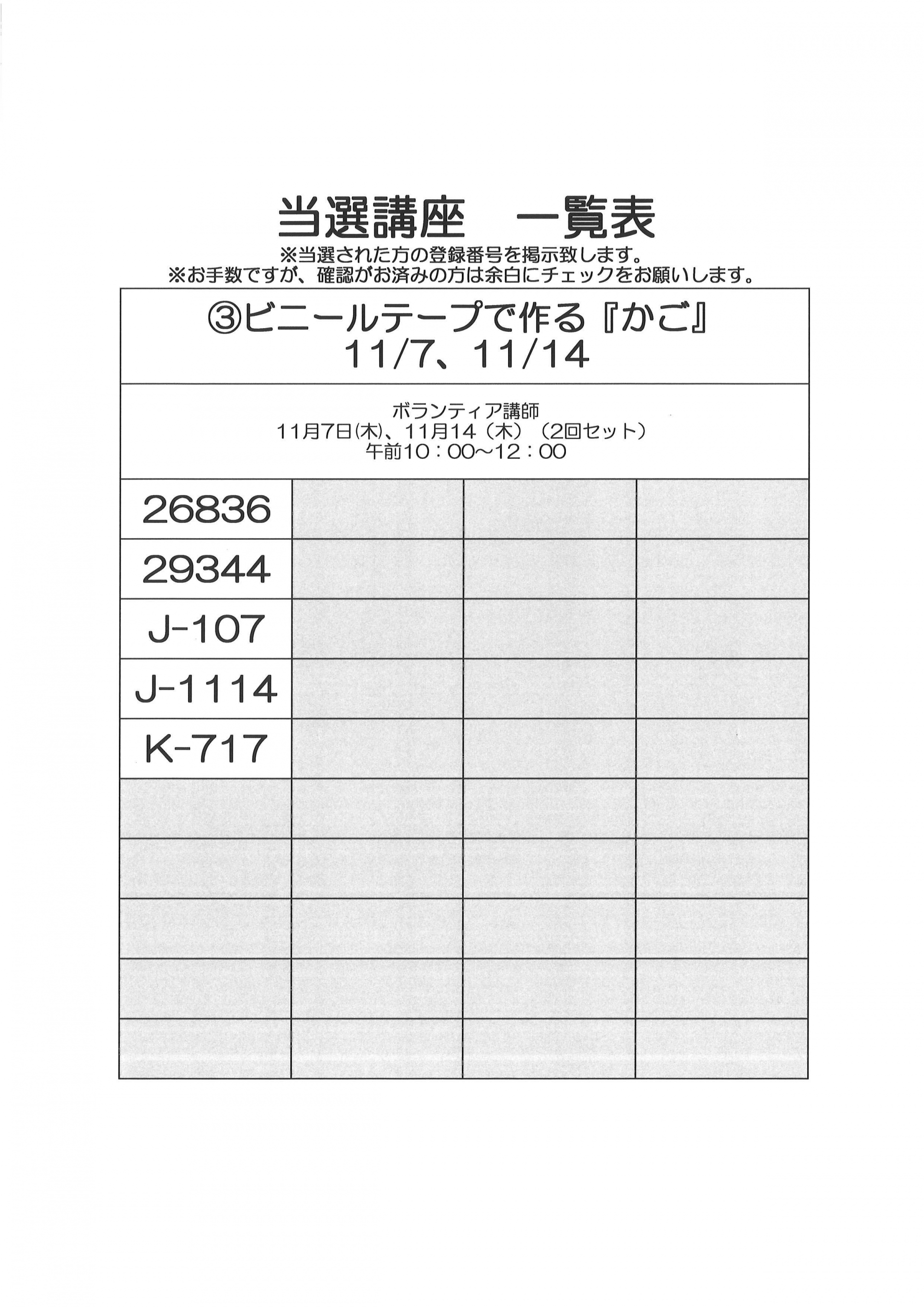 11月開催 『布ぞうり作り講座』『ビニールテープで作る(かご)』の当選発表です。