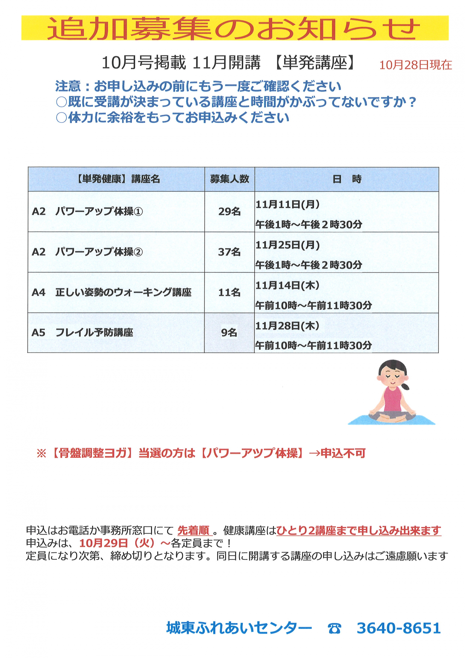 2024.10.28 お知らせ 11月開催 追加募集のお知らせ!! Tweet シェアする 皆さん こんにちは!! 11月開催 単発講座(健康)追加募集のお知らせです。 お申し込みは10/29(火)からです。 たくさんのお申し込みお待ちしています。 城東ふれあいセンター T.Y 前の記事 2024.10.28 お知らせ ストレス発散!『リズムキック&パンチ』定期講座 次の記事 2024.10.25 お知らせ 【城東フェスティバル】 一覧へ戻る