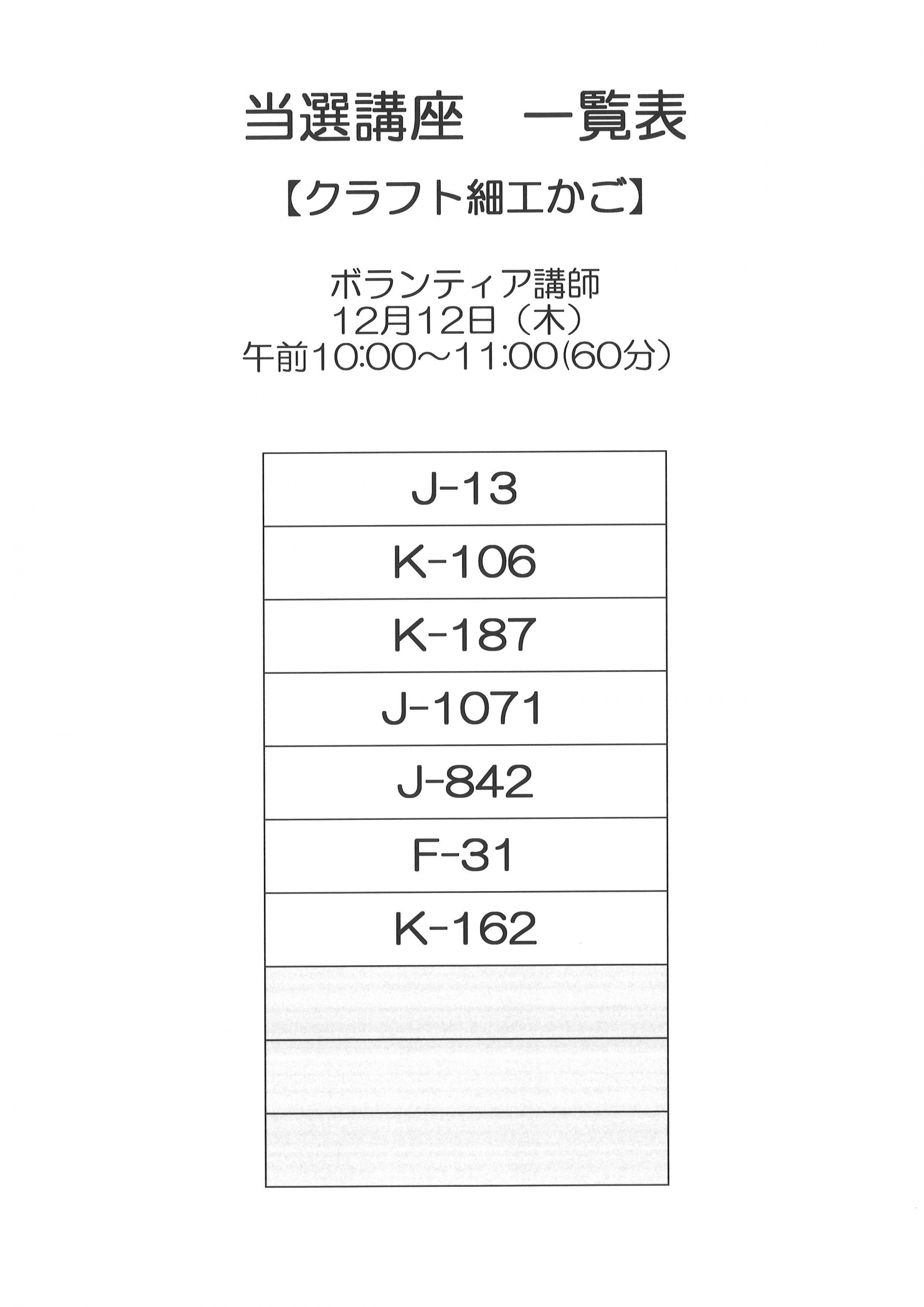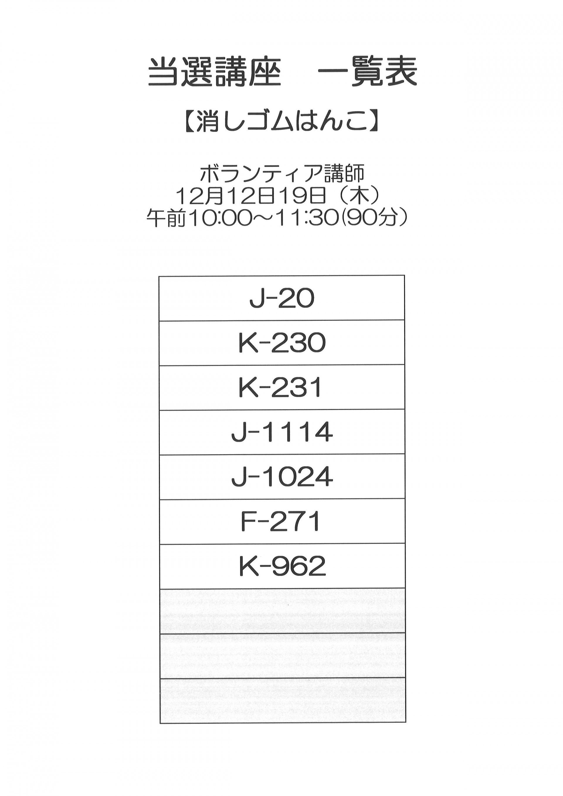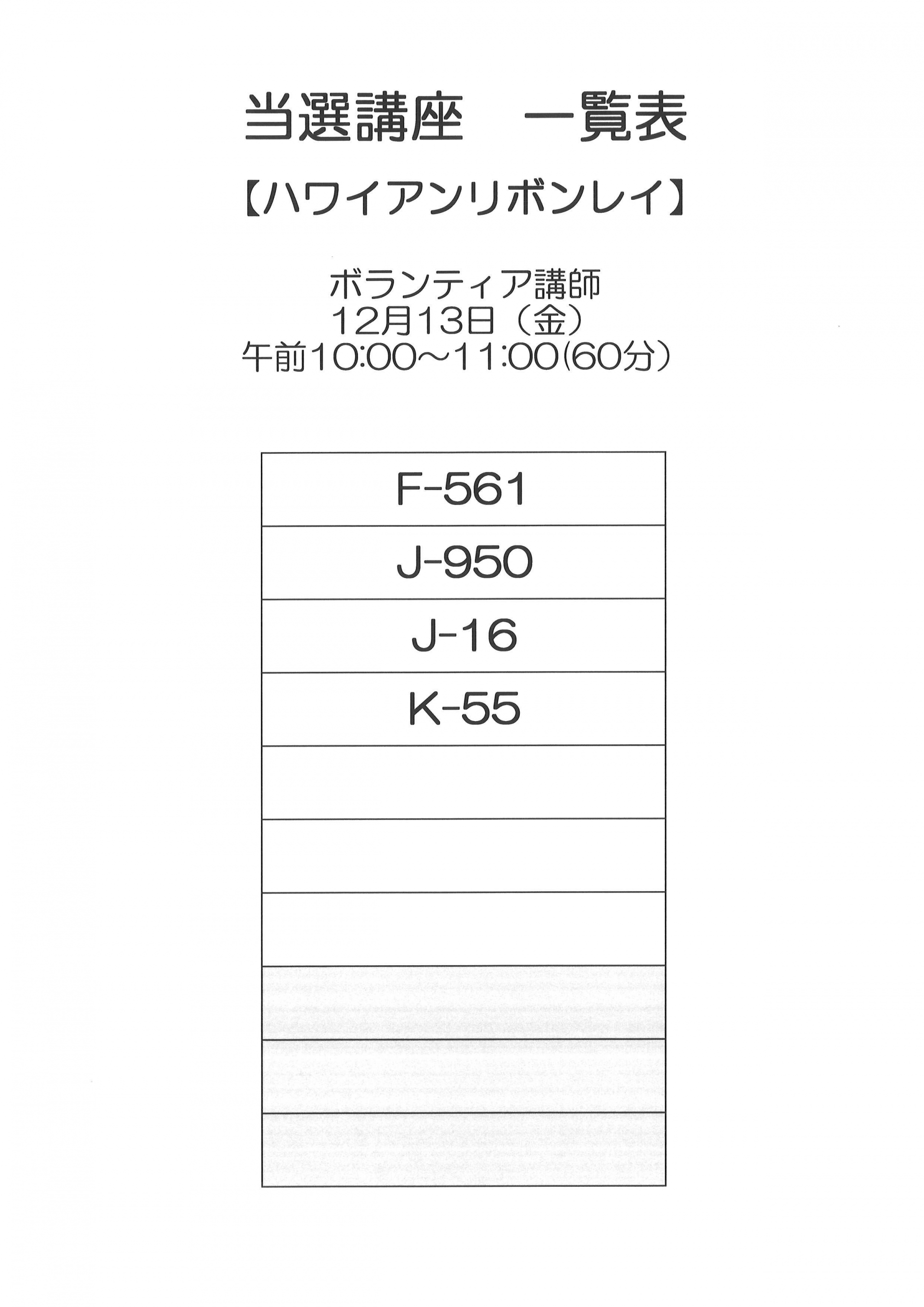2024.11.18 お知らせ 12月開催 単発講座 当選者一覧 Tweet シェアする みなさん、こんにちは(^^♪12月開催 単発講座 当選者一覧表です。ご確認をお願いします。 城東ふれあいセンター M.M 前の記事 2024.11.20 お知らせ 12月開催講座 追加募集のお知らせ 次の記事 2024.11.11 お知らせ 祝!ゆうゆう体操1000回!! 一覧へ戻る