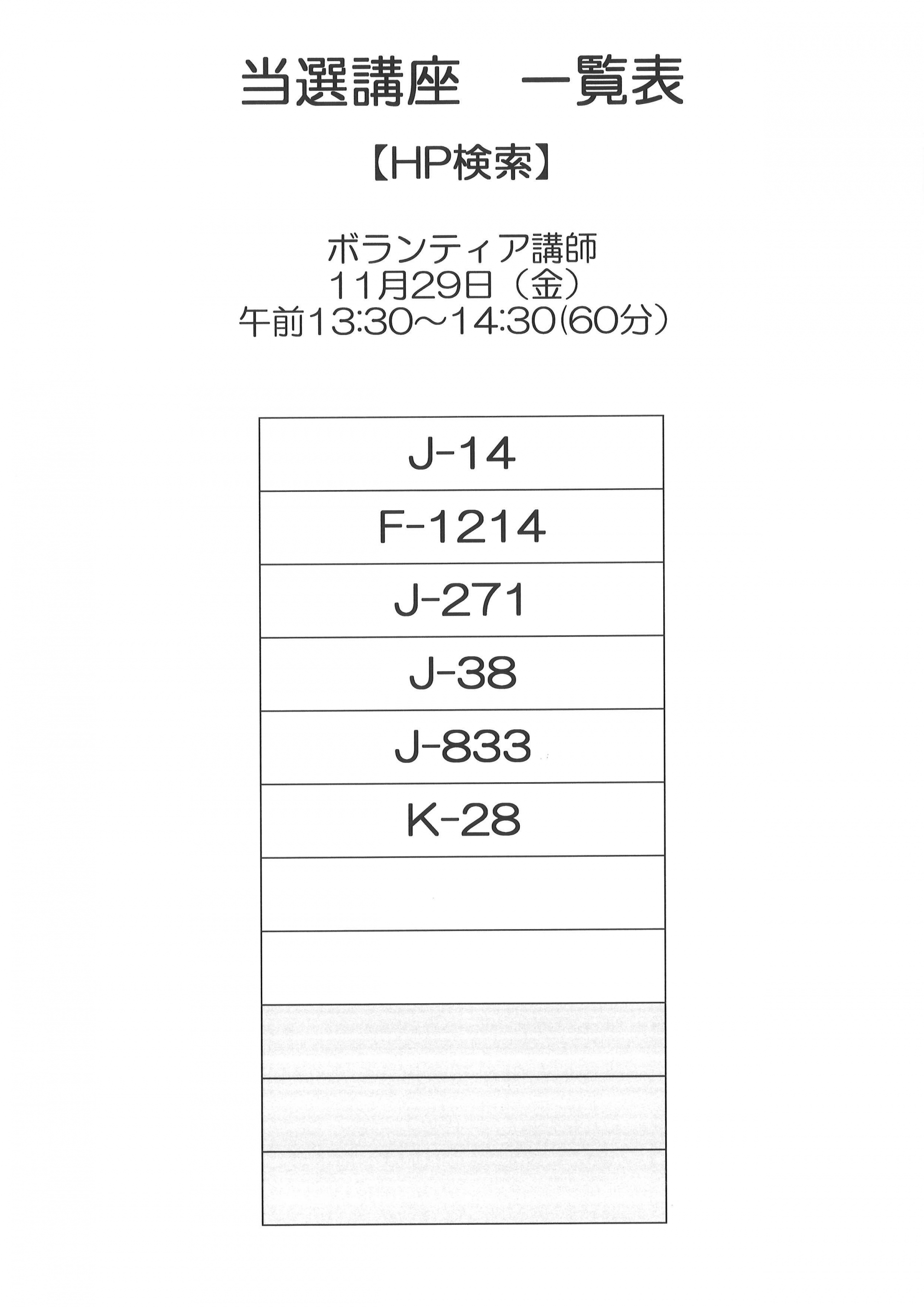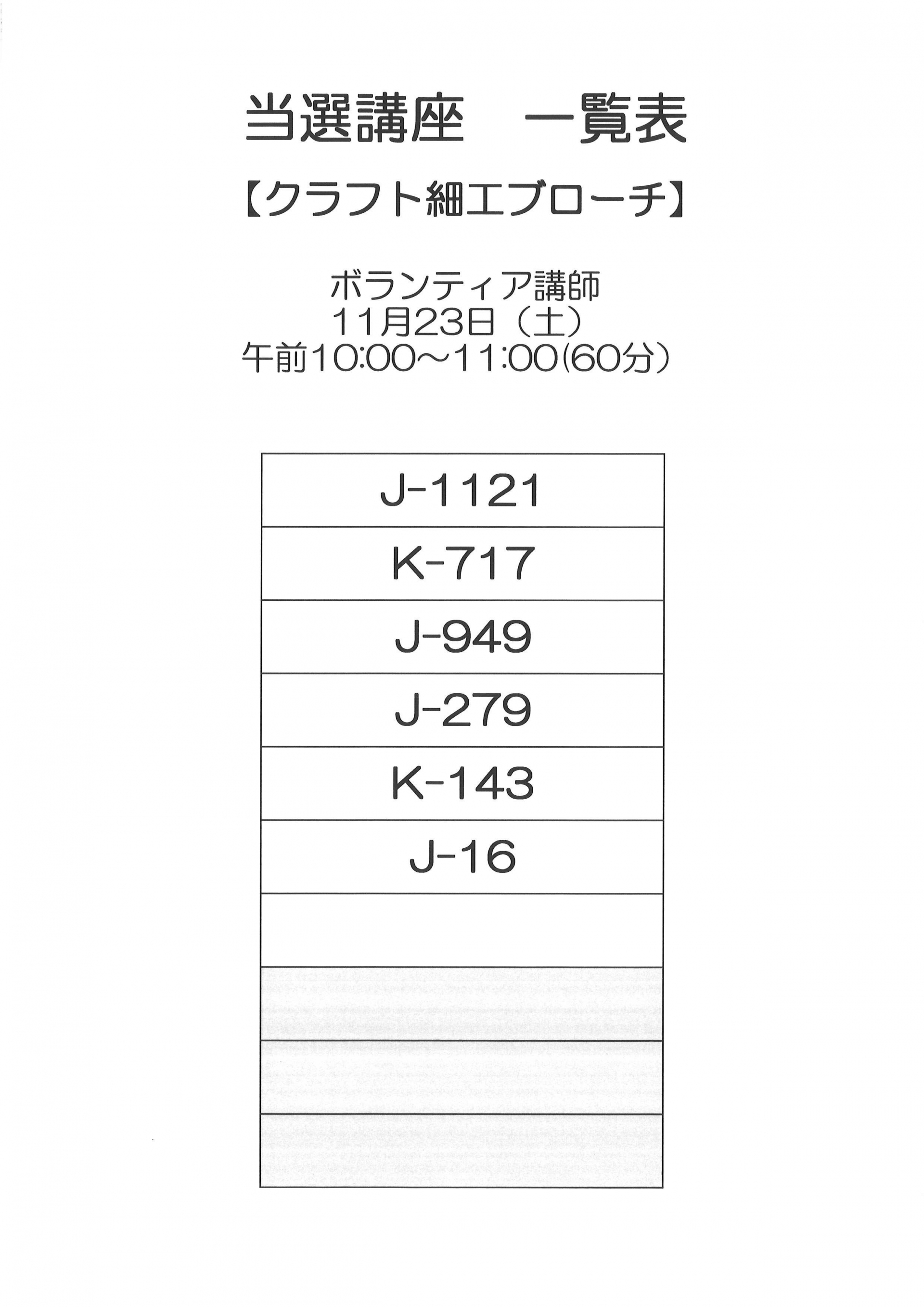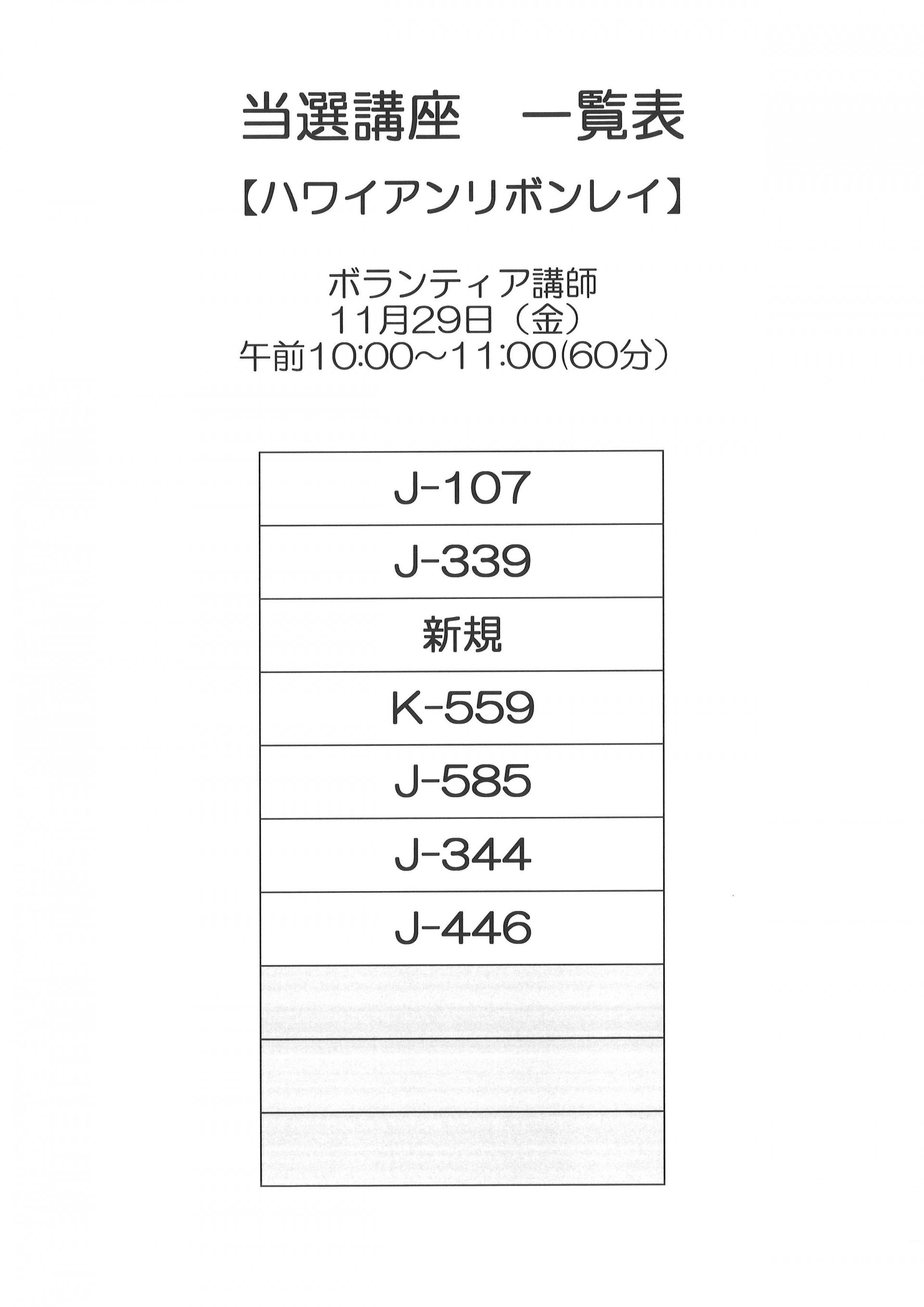 2024.11.18 お知らせ 12月開催 単発講座 当選者一覧 Tweet シェアする みなさん、こんにちは(^^♪12月開催 単発講座 当選者一覧表です。ご確認をお願いします。 城東ふれあいセンター M.M 前の記事 2024.11.20 お知らせ 12月開催講座 追加募集のお知らせ 次の記事 2024.11.11 お知らせ 祝!ゆうゆう体操1000回!! 一覧へ戻る