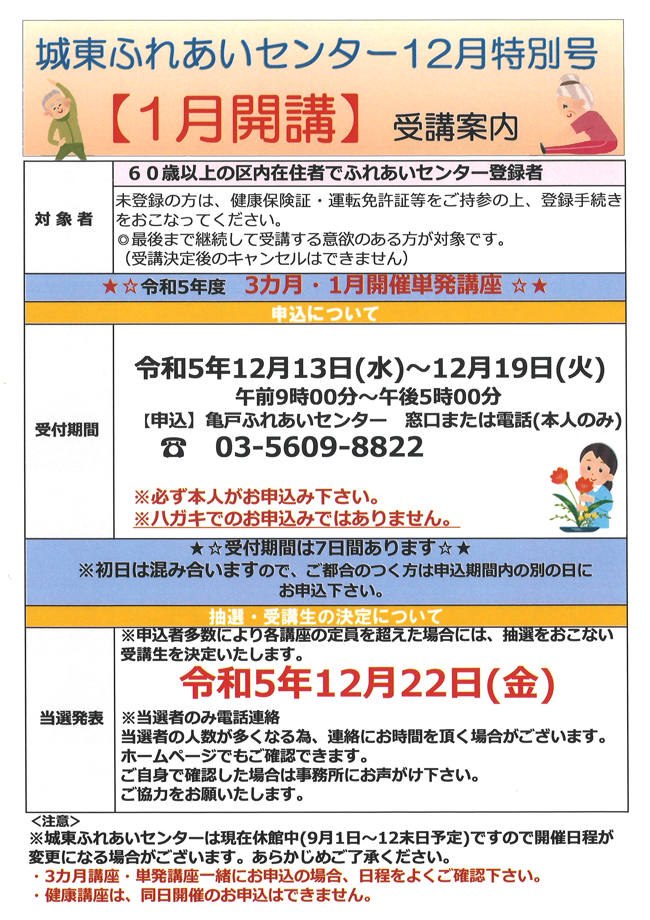こちちらのお申込・お申込や講座に関するお問い合わせは亀戸ふれあいセンターになります。