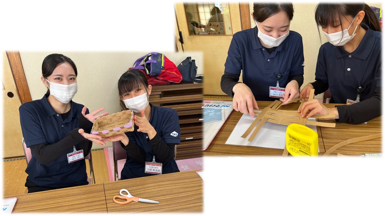 実習生2人がクラフト細工講座のかご作り参加してくれました