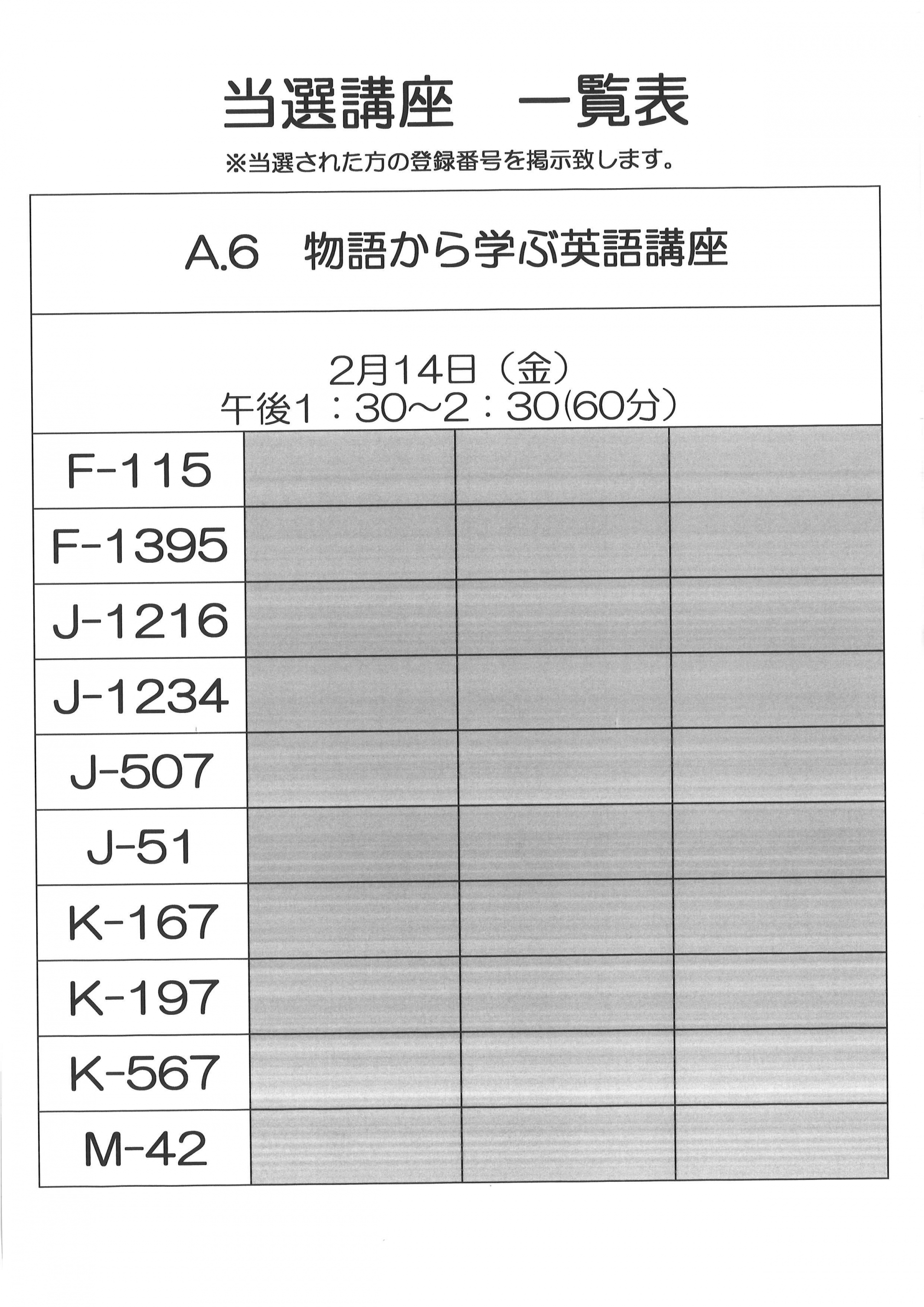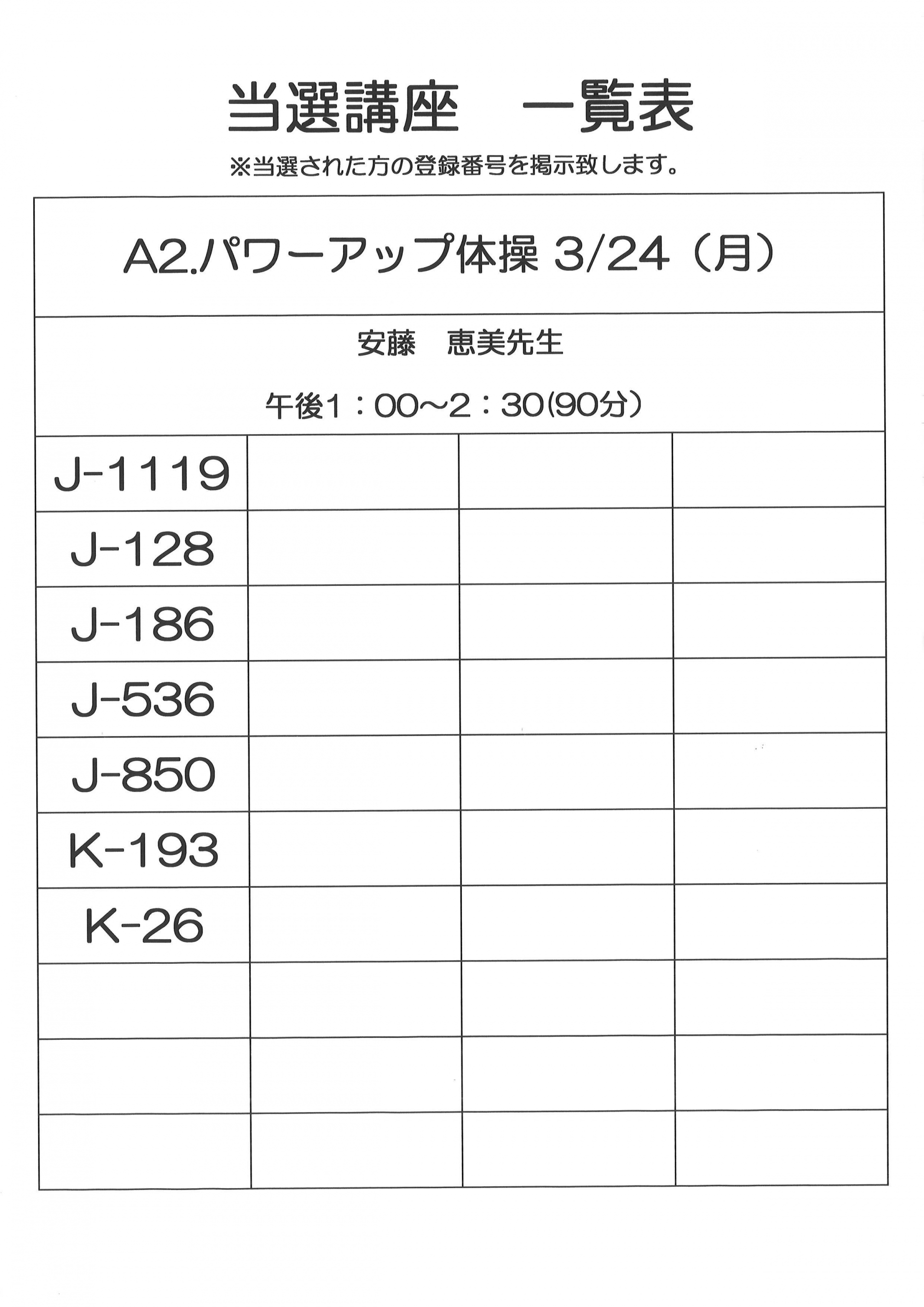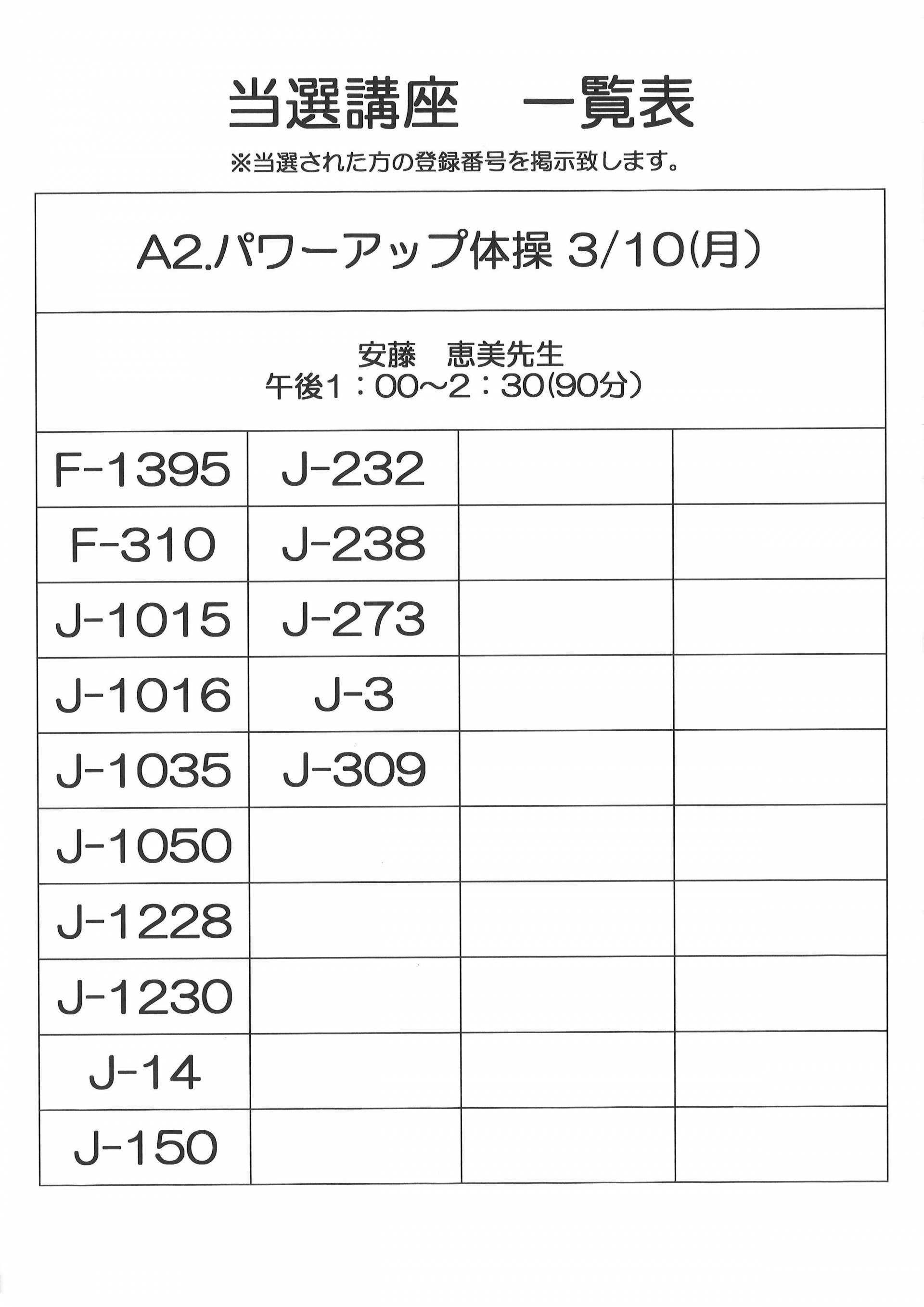 2025.02.10 お知らせ 2月・3月開催 単発講座(健康・教養)当選者一覧 Tweet シェアする こんにちは!! 2月・3月開催 単発講座(健康・教養)の当選者一覧です。 どうぞご確認をお願いいたします。 城東ふれあいセンター T.Y 前の記事 2025.02.11 お知らせ 2月・3月開催 追加募集のお知らせです。 次の記事 2025.02.07 お知らせ 緑茶を飲んで効能を学ぼう! 一覧へ戻る