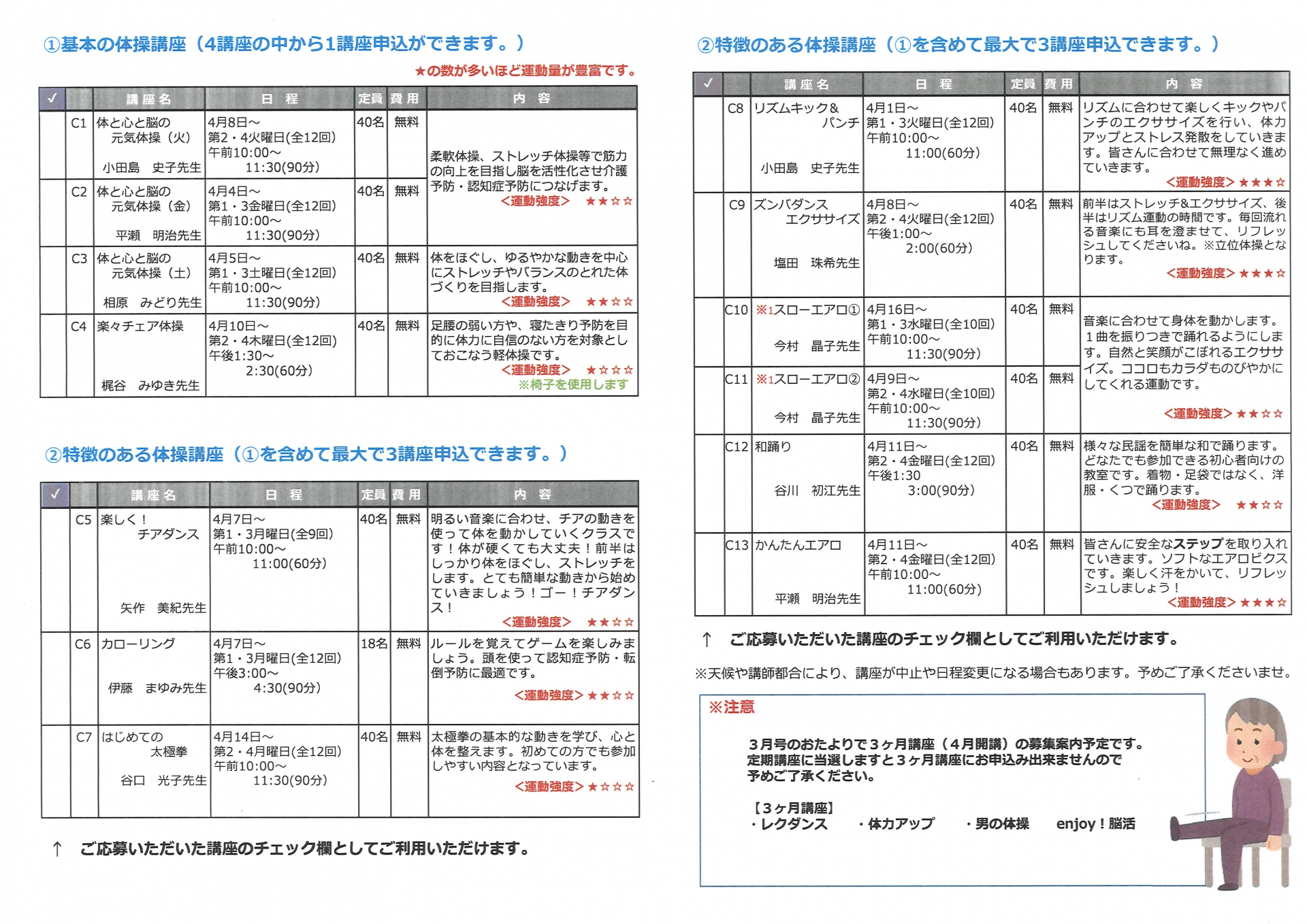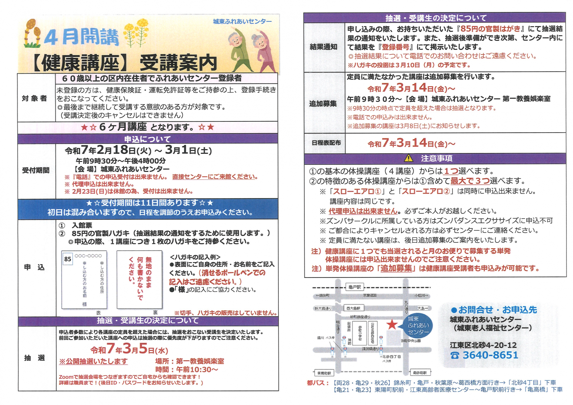 2025.02.13 お知らせ 4月開講定期講座のご案内【健康】 Tweet シェアする 定期講座の申込は来館して受付になります。(本人のみ) 申込む講座1つにつき、ハガキ1枚が必要となります。 よくご確認のうえ、お申込お願いいたします。 城東ふれあいセンターYR 前の記事 2025.02.13 お知らせ 4月開講定期講座のご案内【教養】 次の記事 2025.02.11 お知らせ 2月・3月開催 追加募集のお知らせです。 一覧へ戻る