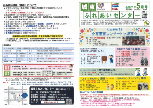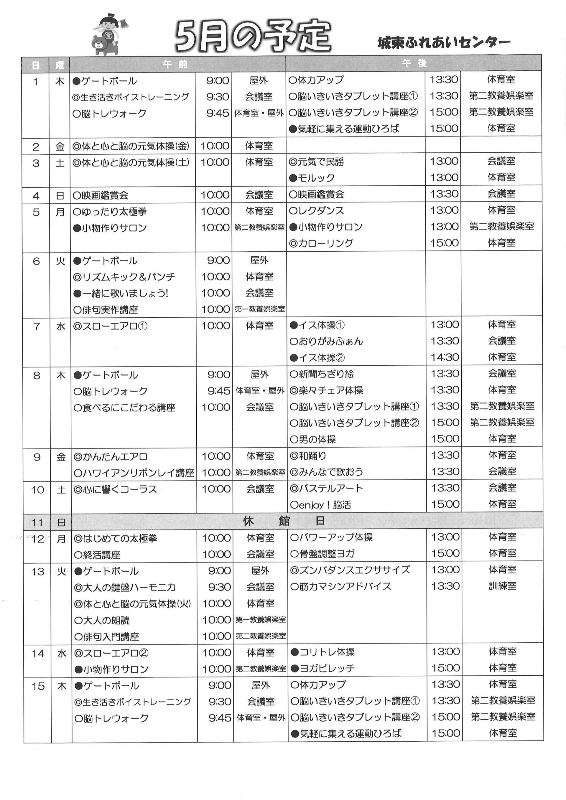 2025.04.25 お知らせ 城東ふれあいセンター 予定表5月号 Tweet シェアする 城東ふれあいセンターの5月の予定表をお知らせいたします! 城東ふれあいセンター Y.R 前の記事 2025.04.25 お知らせ 押し花アート 次の記事 2025.04.25 お知らせ 城東ふれあいセンター おたより5月号 一覧へ戻る