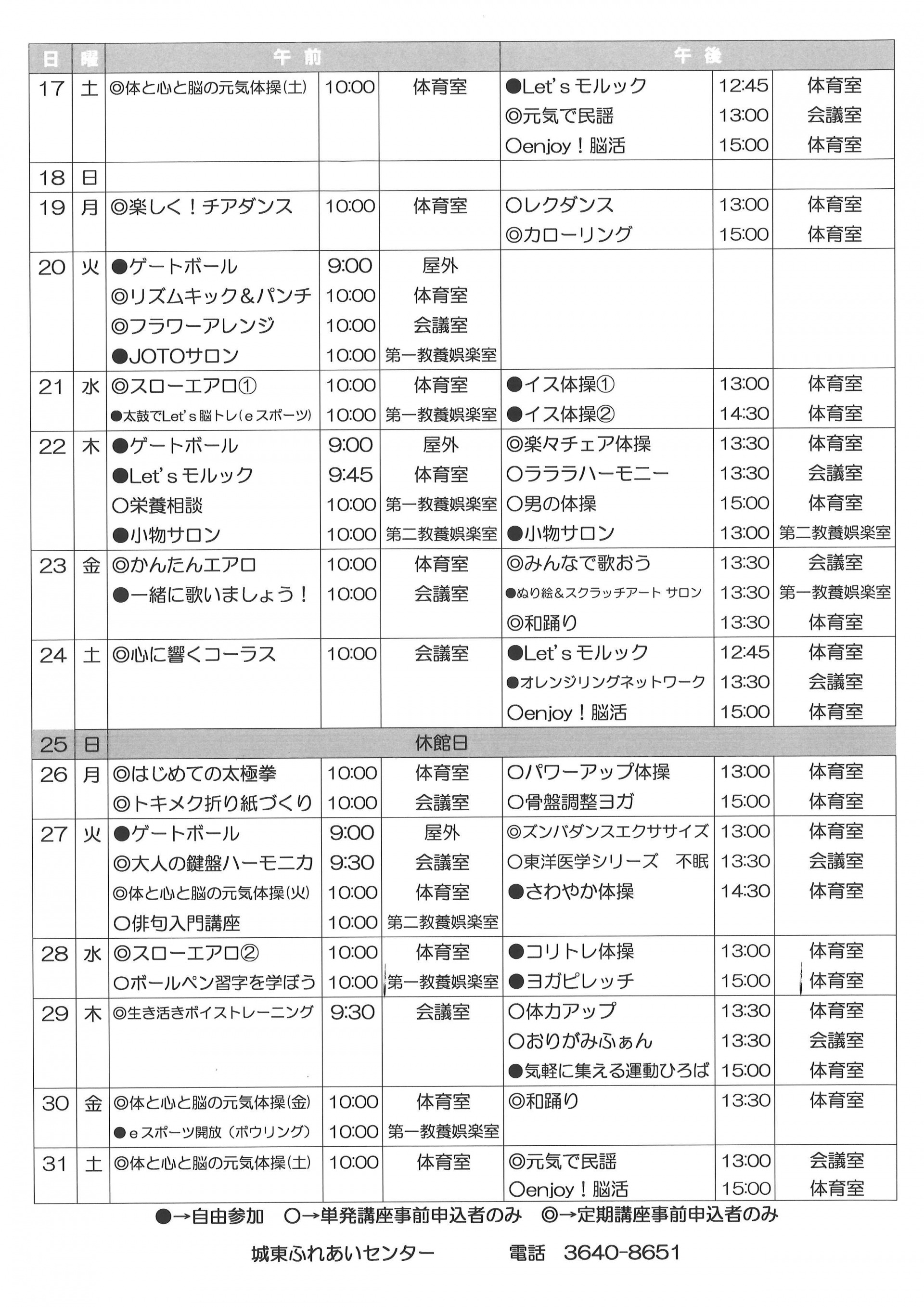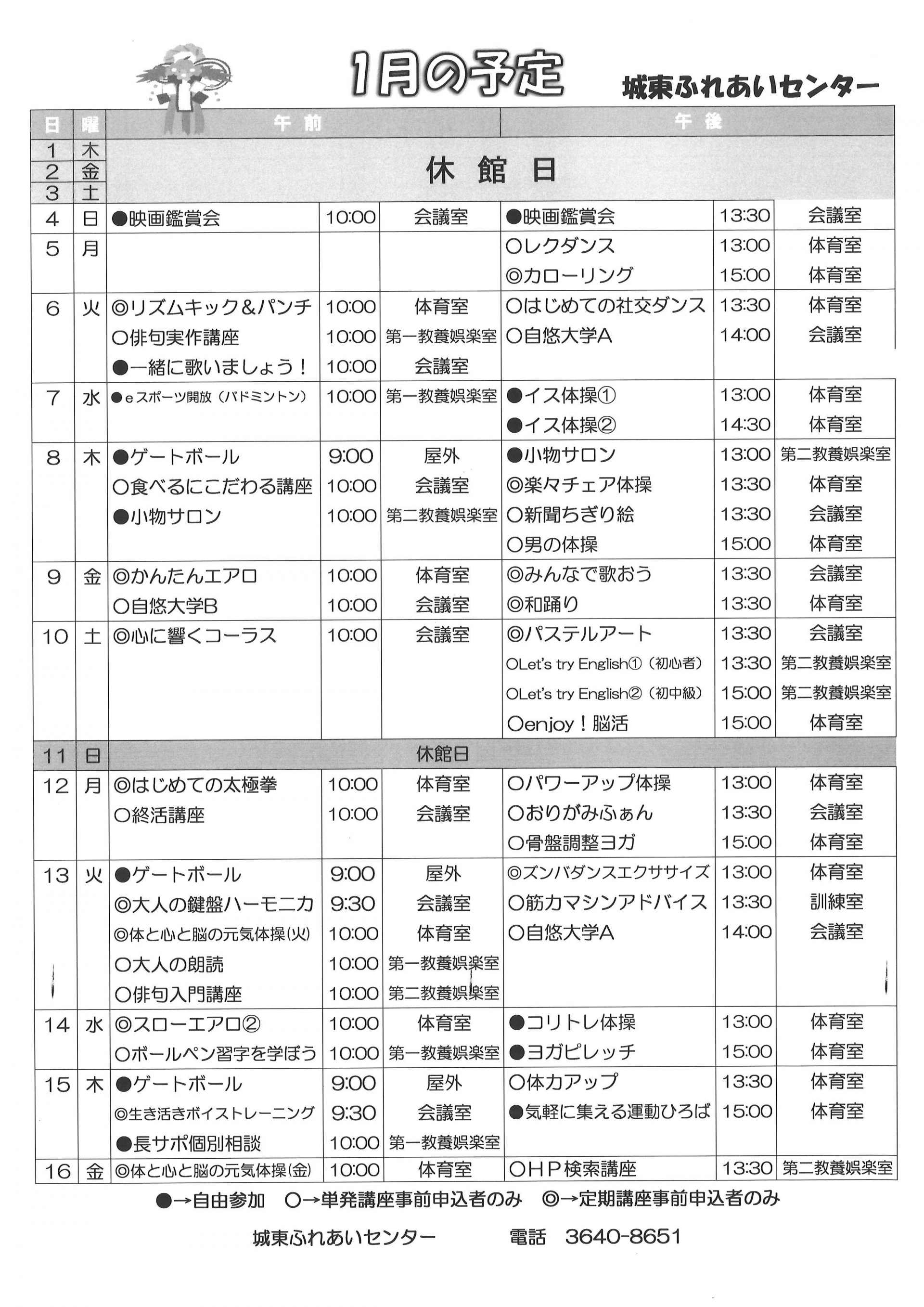 2025.12.23 お知らせ 城東ふれあいセンター1月の予定表 Tweet シェアする 城東ふれあいセンター1月の予定表をお知らせいたします。 城東ふれあいセンター H.A 前の記事 2025.12.25 お知らせ 1月自由参加日程表 次の記事 2025.12.23 お知らせ 城東ふれあいセンターおたより 1月号 一覧へ戻る