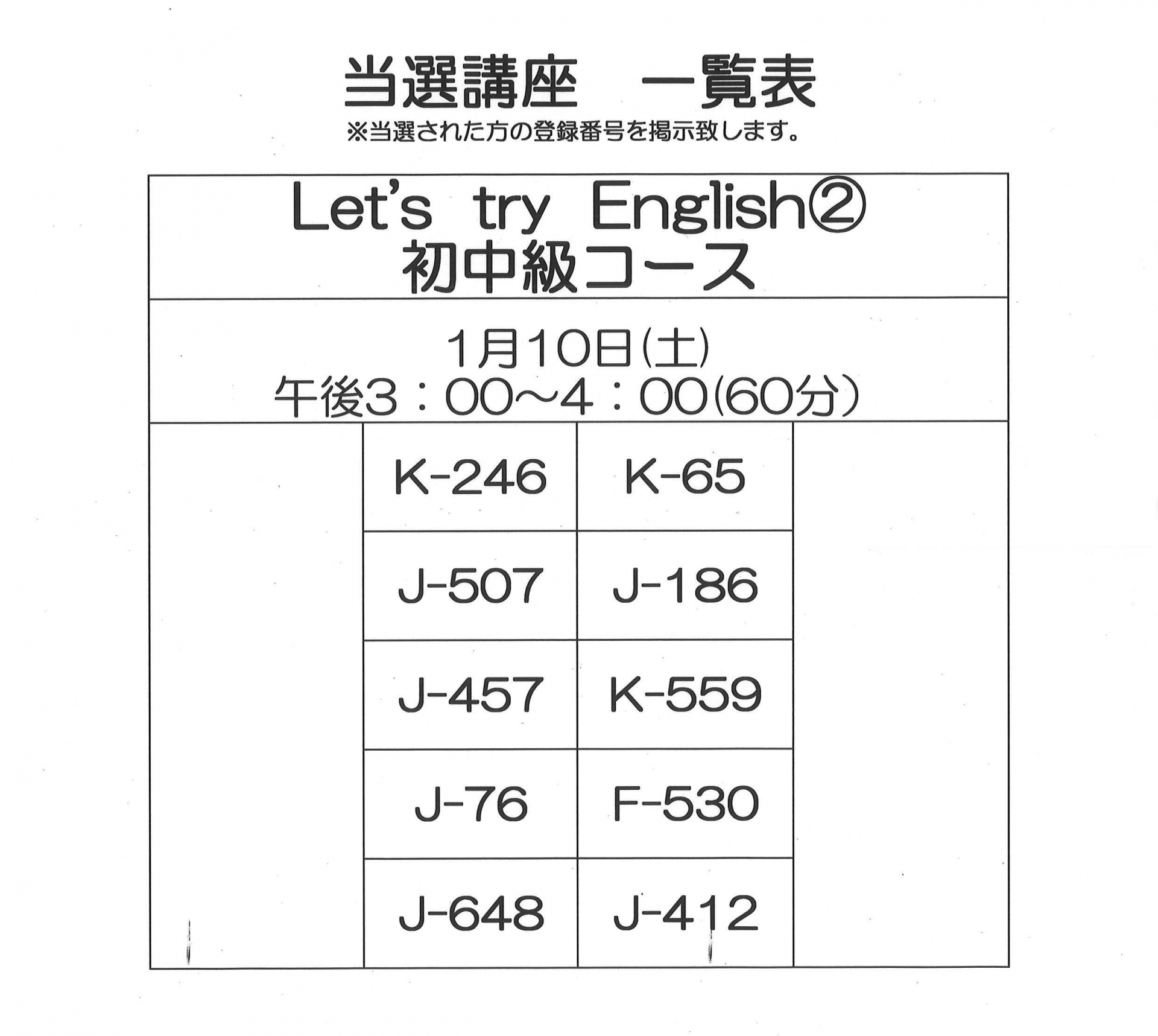 1月開催 単発講座【Let's try English①・②、HP検索講座】 当選者一覧