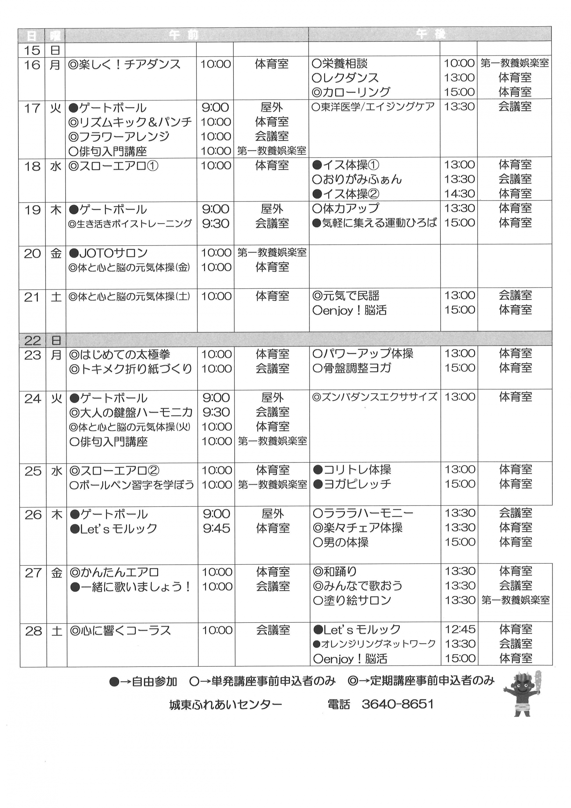 2026.01.24 お知らせ 城東ふれあいセンター2月の予定表 Tweet シェアする 城東ふれあいセンター2月の予定表をお知らせいたします。 城東ふれあいセンター H.A 前の記事 2026.01.26 お知らせ 男の体操 次の記事 2026.01.24 お知らせ 城東ふれあいセンター2月のおたより 一覧へ戻る