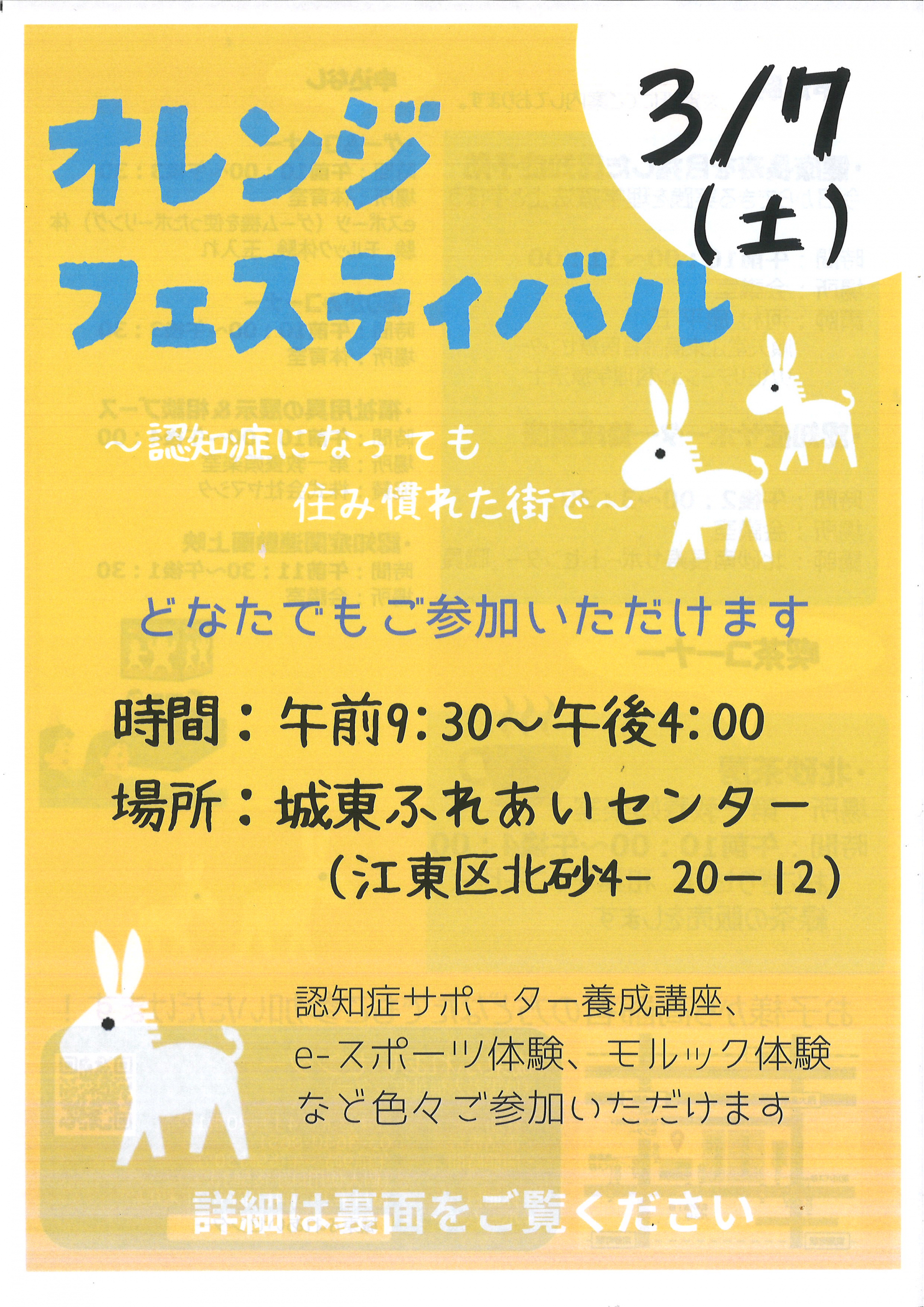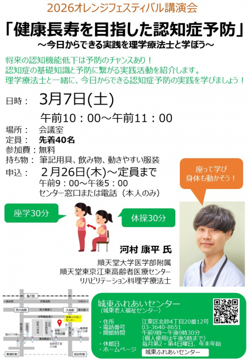 城東ふれあいセンターでは認知症への理解を広げ、地域で支えるつながりをつくることを目的とした啓発イベントオレンジフェスティバルを開催予定です。