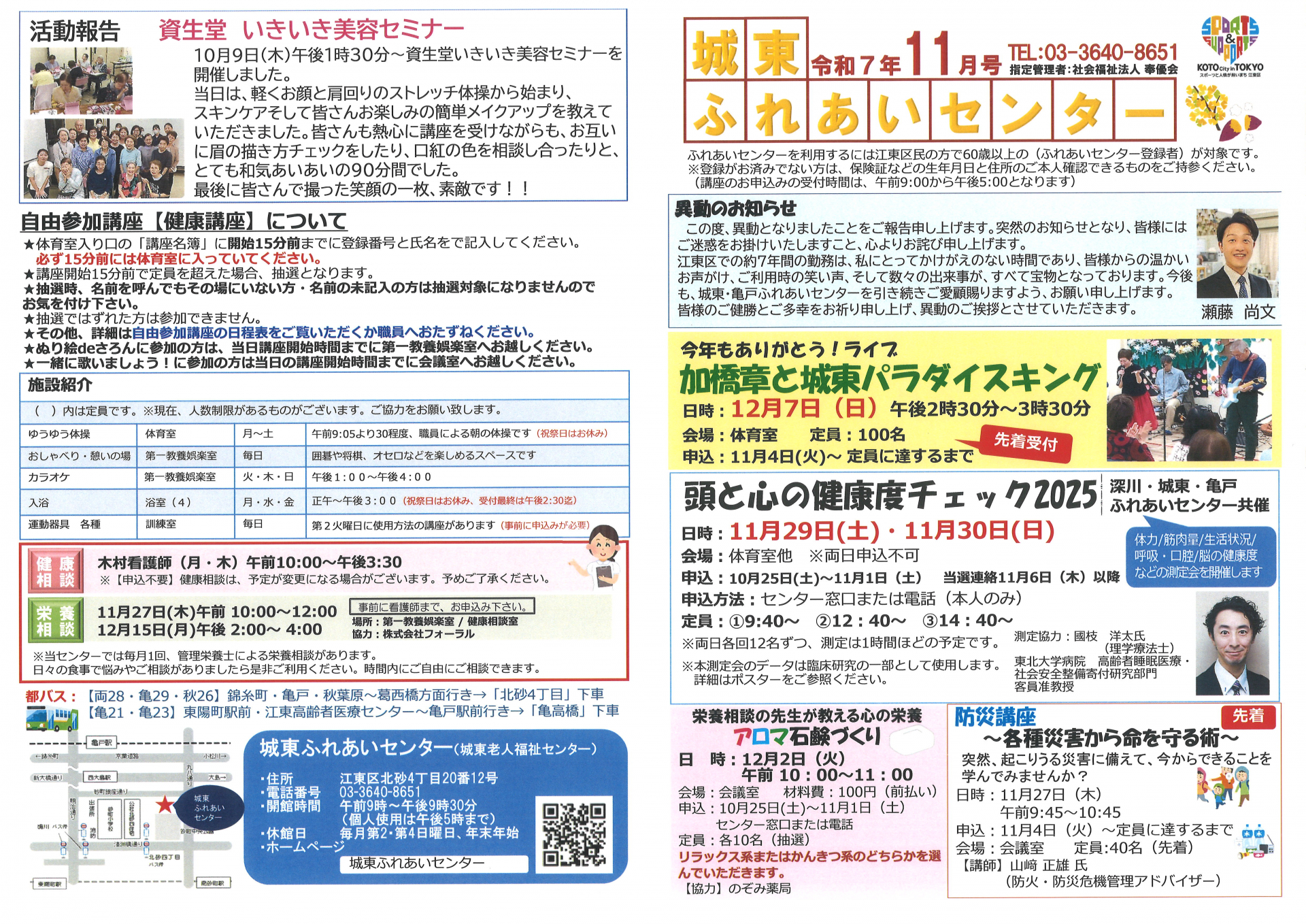 2025.10.25 お知らせ 城東ふれあいセンターのおたより11月号 Tweet シェアする 城東ふれあいセンターのおたより11月号が完成しました\(^o^)/少しずつ肌寒い日が増えてきましたね。運動と教養と・・・と館内で色々な講座に参加しませんか?今月も、講座は盛りだくさんです。皆さんのお申込をお待ちしております。 一覧へ戻る