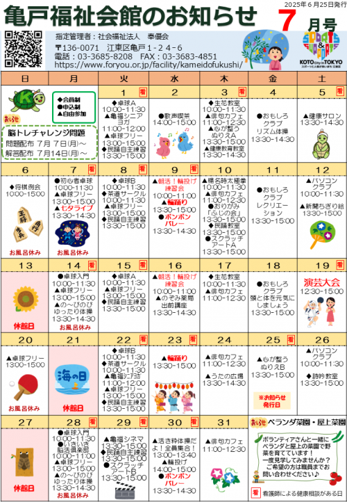 2025.12.12 歌謡教室開催しました 活動報告 2025.12.12 草月流生け花教室が開催されました 活動報告 #亀戸福祉会館 #草月流生け花教室 #生花 2025.12.11 おりがみサロンが開催されました。 活動報告 #おりがみ #亀戸福祉会館 #縁起物 #まねきねこ #おりがみサロン 2025.12.09 亀福屋上ファーム 活動報告 #亀戸福祉会館 #家庭菜園 #屋上畑 #冬野菜 #大根 #収穫 2025.12.09 今月の冬至 "ゆず湯" のお知らせ お知らせ #江東区 #亀戸福祉会館 #お風呂 #ゆず湯 2025.12.09 今月の「健康サロン」のお知らせ お知らせ #江東区 #亀戸福祉会館 #健康サロン 2025.12.08 クリスマスツリーの飾りを作りました★ 活動報告 #クリスマス #亀戸福祉会館 #おりがみ #キラキラ 2025.12.08 塗り絵コンクールのご紹介 お知らせ #江東区 #亀戸 #亀戸福祉会館 #塗り絵 #ぬり絵 2025.12.05 歌声喫茶が開催されました 活動報告 2025.12.05 亀福シニアヨガが開催されました。 活動報告 #亀戸福祉会館 #シニアヨガ #高齢者の為の運動 2025.12.03 ベランダのグリーン 活動報告 #亀戸福祉会館 #ベランダ #ハーブ #家庭菜園 2025.12.03 クリスマスツリーの飾りを作ろう🎄 活動報告 #亀戸福祉会館 #クリスマスツリー #おりがみ 2025.12.02 好評「亀福シネマ」12月上映タイトルのご案内 お知らせ #江東区 #亀戸福祉会館 #シネマ 2025.12.02 年末年始の休館日とお風呂のお知らせ お知らせ #亀戸福祉会館 #年末年始 2025.12.01 12月が始まりました! 活動報告 #亀戸福祉会館 #クリスマス #年末 #クリスマスライブ #ロザリア 1 2 3 … 29